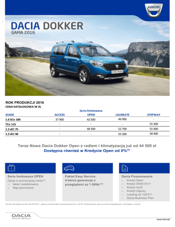 2 ROK PRODUKCJI 2016 CENA KATALOGOWA W ZŁ SILNIK ACCESS Seria limitowana OPEN 1.6 SCe 100 37 900 - 42 500 - 1.5 dCi 75 - 1.5 dCi 90 - TCe 115 LAUREATE 46 900 STEPWAY 55 300 48 300 52 700 - 55 200 58 400 55 900 Teraz Nowa Dacia Dokker Open z radiem i klimatyzacją już od 44 500 zł Dostępna również w Kredycie Open od 0%(1) Seria limitowana OPEN cenie(3): Opcje w promocyjnej o lakier metalizowany o felgi aluminiowe Pakiet Easy Service: 4-letnia gwarancja z przeglądami za 1 099zł (4) Dacia Finansowanie o o o o o o Kredyt Open Kredyt 50/50 0%(5) Kredyt 4x25 Kredyt Ulgowy Leasing od 102%(6) Dacia Business Plan Cennik obowiązuje od dnia 06.09.2016r. i dotyczy samochodów wyprodukowanych w 2016r. Prezentowane ceny są cenami katalogowymi. Szczegóły w salonie. CENA KATALOGOWA W ZŁ 1.6 SCe 100 1.5 dCi 75 PODSTAWOWE WYPOSAŻENIE SERII LIMITOWANEJ OPEN = ACCES + Zderzaki w kolorze nadwozia Boczne listwy ochronne Światła przeciwmgłowe Centralny zamek drzwi zdalnie sterowany falami radiowymi Elektrycznie podnoszone szyby przednie Dacia Plug&Radio (radioodtwarzacz z dużym wyświetlaczem, CD MP3, Bluetooth®, wejście USB/jack w panelu radia, pilot do sterowania przy kierownicy) Zamykany schowek w desce rozdzielczej Kanapa w drugim rzędzie dzielona w układzie 1/3-2/3 ze składanym oparciem i z możliwością złożenia do pionu Oświetlenie bagażnika Badge poniżej lusterek bocznych ELEMENTY WYPOSAŻENIA OPCJONALNEGO SERII LIMITOWANEJ OPEN: oferowane w promocyjnej cenie: o Klimatyzacja manualna o Obręcze kół ze stopu metali lekkich 15” wzór NEPTA o Nowy metalizowany kolor nadwozia, dostępny wyłącznie dla serii limitowanej OPEN - Brązowy Tourmaline pozostałe opcje: o Koło zapasowe o Metalizowane kolory nadwozia (inne niż Brązowy Tourmaline) o System wspomagania parkowania tyłem 42 500 zł 48 300 zł CENA KATALOGOWA W ZŁ TCe 115 1.5 dCi 75 1.5 dCi 90 55 300 zł 55 900 zł 58 400 zł ELEMENTY WYPOSAŻENIA SERYJNEGO WERSJI STEPWAY = LAUREATE + • elementy ozdobne zewnętrzne w kolorze ciemnoszarego metalu • dwukolorowe relingi dachowe (kolor czarny / matowy chrom) • obręcze kół ze stopu metali lekkich 16” wzór PANACHE w kolorze ciemnoszarego metalu • czarne osłony nadkoli i dodatkowa ochronne czarne listwy boczne • zewnętrzne klamki drzwi w kolorze czarnym • naklejki Stepway na przednich drzwiach • Dacia PLUG&RADIO • kierownica pokryta skórą • czarna tapicerka z napisem Stepway w kolorze niebieskim na oparciach siedzeń oraz delikatnymi niebieskimi przeszyciami • wewnętrzne elementy ozdobne w kolorze niebieskim metalizowanym • ciemnografitowa kolorystyka wnętrza • wewnętrzne klamki drzwi w kolorze czarnym Access seria limitowana OPEN Laureate Stepway Przedni i tyl ny zderza k w kol orze cza rnym ● - Przedni i tyl ny zderza k w kol orze na dwozi a ● ● - Przedni zderza k w kol orze na dwozi a , tyl ny w kol orze cza rnym, z el ementa mi ozdobnymi w kol orze ci emnos za rym - - - ● Boczne l i s twy ochronne WYGLĄD ZEWNĘTRZNY ● ● ● Cza rne rel i ngi da chowe - - 510 ● Sta l owe obręcze kół 14˝ ● - Sta l owe obręcze kół 15˝ wra z z kołpa ka mi 400 ● ● Obręcze kół ze s topów meta l i l ekki ch 15˝ - 500 1 010 - Obręcze kół ze s topów meta l i l ekki ch 16˝ La ki er meta l i zowa ny - - - ● 1 900 1 900 1 900 1 900 SIEDZENIA I WYSTROJE WNĘTRZA Tyl na ka na pa dzi el ona w ukła dzi e 1/3-2/3 ze s kła da nym opa rci em i możl i woś ci ą złożeni a do pi onu Skórza na ki erowni ca Za główki chowa ne w opa rci u - - - ● ● ● ● ● ● ● ● ● ● ● ● ● Boczne podus zki powi etrzne z przodu ● ● ● ● Sys tem mocowa ni a fotel i ków dzi eci ęcych Is ofi x na mi ejs ca ch 2. rzędu s i edzeń ● ● ● ● 310 310 310 310 BEZPIECZEŃSTWO CZYNNE I BIERNE ABS + s ys tem ws poma ga ni a na głego ha mowa ni a ® Sys tem kontrol i toru ja zdy ESC z funkcją za pobi ega ni a poś l i zgowi kół przy rus za ni u (ASR), czujni k ci ś ni eni a w opona ch Czołowe podus zki powi etrzne ki erowcy i pa s a żera Koło za pa s owe DRZWI I SZYBY Pra we boczne drzwi przes uwa ne z otwi era ną s zybą ● ● ● ● Drzwi l ewe przes uwne z s zybą uchyl ną - 1400 ● ● Kodowa na bl oka da za płonu ● ● ● ● Za mek centra l ny s terowa ny fa l a mi ra di owymi - ● ● ● Ukła d ki erowni czy ze ws poma ga ni em Komputer pokła dowy (ogól ny i dzi enny l i czni k ki l ometrów, przebi eg od os ta tni ego ta nkowa ni a , i l oś ć zużytego pa l i wa , ś redni e zużyci e pa l i wa , za s i ęg na pozos ta łym za pa s i e pa l i wa , ś redni a prędkoś ć, przebi eg pozos ta łych do na s tępnego przegl ądu) Regul a tor / ogra ni czni k prędkoś ci ● ● ● ● - 120 ● ● - - 650 ● Sys tem ws poma ga ni a pa rkowa ni a tyłem - - 650 650 - 300 ● ● - 350 ● - - ● ● ● ● ● ● ● ZABEZPIECZENIE POJAZDU PROWADZENIE POJAZDU I INSTRUMENTY KONTROLNE WIDOCZNOŚĆ El ektryczni e s terowa ne i podgrzewa ne l us terka boczne El ektryczni e s terowa ne i podgrzewa ne l us terka boczne w kol orze na dwozi a Refl ektory przeci wmgłowe Wyci era czka tyl nej s zyby Access seria limitowana OPEN Laureate Stepway KOMFORT Ręczni e podnos zone s zyby przedni e ● - - - El ektryczni e podnos zone s zyby przedni e - ● ● ● 70 - 70 70 - 250 ● ● 250 ● ● Przenoś na popi el ni czka / za pa l ni czka Ki erowni ca z regul a cją w pi oni e Fotel ki erowcy z regul a cją w pi oni e - Fotel e przedni e podgrzewa ne - - 550 550 Kl i ma tyza cja ma nua l na - 2000 ● ● Oś wi etleni e ba ga żni ka - 0 ● ● Si a tka oddzi el a jąca ba ga ż - - 500 500 ● ● ● ● Tyl ko z przodu ● ● ● Schowek w des ce rozdzi el czej po s troni e ki erowcy ● - ● ● Ki es zeni e w opa rci u przedni ch fotel i - ● ● ● Zwi ja na przes łona ba ga żni ka - ● ● ● - ● ● ● - - 950 950 - - 300 300 SCHOWKI I AKCESORIA Otwa rta wnęka na d 