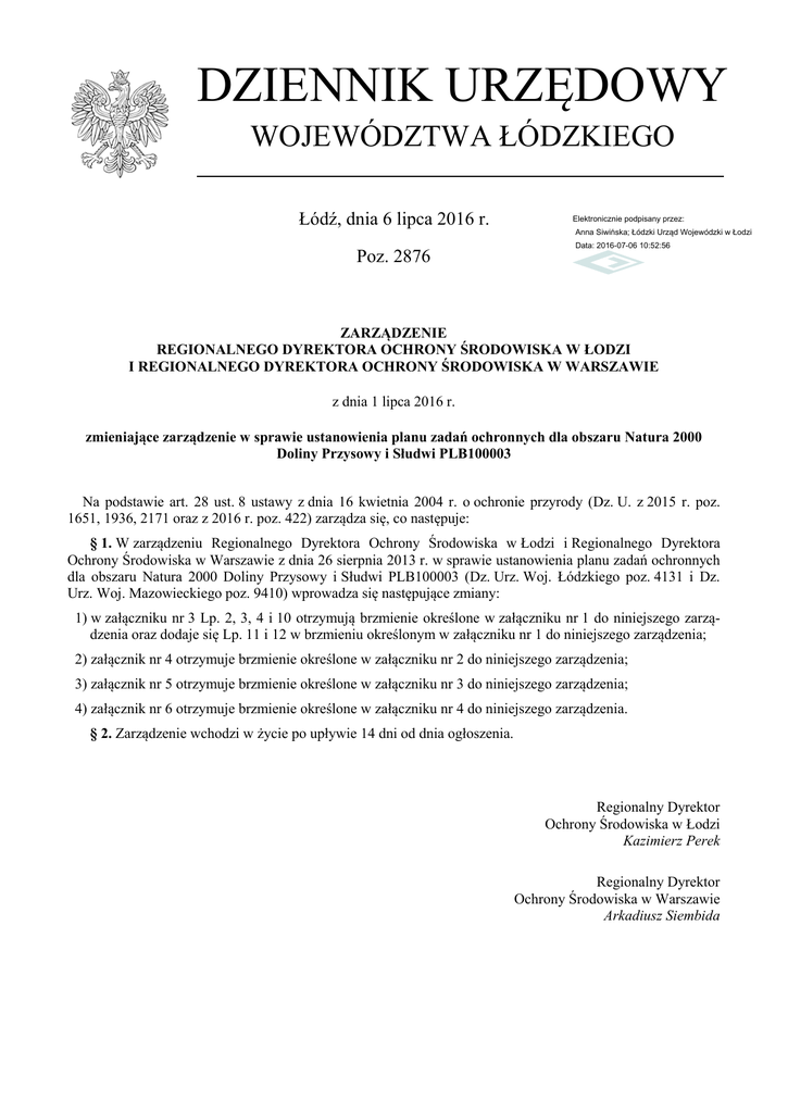DZIENNIK URZĘDOWY WOJEWÓDZTWA ŁÓDZKIEGO Łódź, dnia 6 lipca 2016 r. Elektronicznie podpisany przez: Anna Siwińska; Łódzki Urząd Wojewódzki w Łodzi Poz. 2876 Data: 2016-07-06 10:52:56 ZARZĄDZENIE REGIONALNEGO DYREKTORA OCHRONY ŚRODOWISKA W ŁODZI I REGIONALNEGO DYREKTORA OCHRONY ŚRODOWISKA W WARSZAWIE z dnia 1 lipca 2016 r. zmieniające zarządzenie w sprawie ustanowienia planu zadań ochronnych dla obszaru Natura 2000 Doliny Przysowy i Słudwi PLB100003 Na podstawie art. 28 ust. 8 ustawy z dnia 16 kwietnia 2004 r. o ochronie przyrody (Dz. U. z 2015 r. poz. 1651, 1936, 2171 oraz z 2016 r. poz. 422) zarządza się, co następuje: § 1. W zarządzeniu Regionalnego Dyrektora Ochrony Środowiska w Łodzi i Regionalnego Dyrektora Ochrony Środowiska w Warszawie z dnia 26 sierpnia 2013 r. w sprawie ustanowienia planu zadań ochronnych dla obszaru Natura 2000 Doliny Przysowy i Słudwi PLB100003 (Dz. Urz. Woj. Łódzkiego poz. 4131 i Dz. Urz. Woj. Mazowieckiego poz. 9410) wprowadza się następujące zmiany: 1) w załączniku nr 3 Lp. 2, 3, 4 i 10 otrzymują brzmienie określone w załączniku nr 1 do niniejszego zarządzenia oraz dodaje się Lp. 11 i 12 w brzmieniu określonym w załączniku nr 1 do niniejszego zarządzenia; 2) załącznik nr 4 otrzymuje brzmienie określone w załączniku nr 2 do niniejszego zarządzenia; 3) załącznik nr 5 otrzymuje brzmienie określone w załączniku nr 3 do niniejszego zarządzenia; 4) załącznik nr 6 otrzymuje brzmienie określone w załączniku nr 4 do niniejszego zarządzenia. § 2. Zarządzenie wchodzi w życie po upływie 14 dni od dnia ogłoszenia. Regionalny Dyrektor Ochrony Środowiska w Łodzi Kazimierz Perek Regionalny Dyrektor Ochrony Środowiska w Warszawie Arkadiusz Siembida Dziennik Urzędowy Województwa Łódzkiego –2– Poz. 2876 Załącznik nr 1 do zarządzenia Regionalnego Dyrektora Ochrony Środowiska w Łodzi i Regionalnego Dyrektora Ochrony Środowiska w Warszawie z dnia 1 lipca 2016 r. IDENTYFIKACJA ISTNIEJĄCYCH I POTENCJALNYCH ZAGROŻEŃ DLA ZACHOWANIA WŁAŚCIWEGO STANU OCHRONY GATUNKÓW PTAKÓW I ICH SIEDLISK BĘDĄCYCH PRZEDMIOTAMI OCHRONY Lp. Przedmiot ochrony Istniejące Zagrożenia Potencjalne Opis zagrożenia A041 gęś białoczelna Anser albifrons A039 gęś zbożowa Anser fabalis 2. A043 gęgawa Anser anser A122 derkacz Crex crex J02 Spowodowane przez człowieka zmiany stosunków wodnych X Brak zagrożeń i nacisków A156 rycyk Limosa limosa Zjawisko to wiąże się z charakterem dolin Słudwi i Przysowy. Koryta rzek są uregulowane i dość głębokie co przyczynia się do szybszego spływu powierzchniowego wód w okresie wiosennym oraz osłabienia walorów żerowiskowych dla gęsi. Zarówno rzeki jak i rowy są w miarę regularnie czyszczone. Z drugiej strony zagrożeniem jest również zabagnienie terenu i związane z tym zarzucenie gospodarowania np. koszenia łąk, co przyczyniłoby się do zarastania siedlisk dogodnych dla migrujących gęsi. Zarastanie łąk powoduje również ubytek siedlisk dla derkacza, rycyka i krwawodzioba. A162 krwawodziób Tringa totanus A041 gęś białoczelna Anser albifrons A039 gęś zbożowa Anser fabalis A043 gęgawa Anser anser 3. A140 siewka złota Pluvialis apricaria A122 derkacz Crex crex A156 rycyk Limosa limosa A162 krwawodziób Tringa totanus X Brak zagrożeń i nacisków A02 Zmiany sposobu uprawy (zmiana zagospodarowania gruntów) Obecny sposób zagospodarowania gruntów w obrębie doliny, jak i w bezpośrednim sąsiedztwie, jest właściwy. Na terenie obszaru stwierdzono pojedyncze przypadki przekształcania łąk w grunty orne. Zjawisko to w niewielkim natężeniu nie ma negatywnego wpływu na gęsi, gdyż żerują one równie chętnie na polach jak i na łąkach. Groźniejsze mogą być natomiast próby zmiany przeznaczenia gruntów w obrębie doliny, zwłaszcza lokalizacja zabudowy inwestycyjnej (w szczególności fermy, kurniki, składowiska) w obrębie samej doliny rzeki. Przekształcanie łąk na grunty orne lub ich zalesianie jest także zagrożeniem dla derkacza, rycyka i krwawodzioba, powoduje to bowiem zanikanie dogodnych siedlisk lęgowych dla tych gatunków. Dziennik Urzędowy Województwa Łódzkiego –3– Poz. 2876 A041 gęś białoczelna Anser albifrons A039 gęś zbożowa Anser fabalis A043 gęgawa Anser anser 4. A140 siewka złota Pluvialis apricaria A03.03 zaniechanie/brak koszenia Zagrożenie, które może być istotne w momencie zarzucenia koszenia łąk. Aktualnie większość łąk jest prawidłowo użytkowana (koszona), ale potencjalne zmiany ekonomiczne w rolnictwie mogą spowodować powstanie tego rodzaju zagrożenia. A03 Koszenie/ ścinanie trawy X Brak zagrożeń i nacisków Zbyt wczesny termin koszenia łąk (w okresie rozrodu gatunków: derkacza, rycyka, krwawodzioba) przyczynia się do strat w lęgach. X Brak zagrożeń i nacisków J03.01 Zmniejszenie lub utrata określonych cech siedliska Brak struktury kępkowej zakrzewień i zarośli. CO3.03 Produkcja energii wiatrowej Lokalizacja farm wiatrowych w obszarze Natura 2000 i jego sąsiedztwie. X Brak zagrożeń i nacisków A122 derkacz Crex crex A156 rycyk Limosa limosa A162 krwawodziób Tringa totanus A122 derkacz Crex crex 10 A156 rycyk Limosa limosa A162 krwawodziób Tringa totanus 11. A272 podróżniczek Luscinia svecica A041 gęś białoczelna Anser albifrons A039 gęś zbożowa Anser fabalis 12. A043 gęgawa Anser anser A081 błotniak stawowy Circus aeruginosus A140 siewka złota Pluvialis apricaria A122 derkacz Crex crex X Brak zagrożeń i nacisków Dziennik Urzędowy Województwa Łódzkiego –4– Poz. 2876 A156 rycyk Limosa limosa A162 krwawodziób Tringa totanus A272 podróżniczek Luscinia svecica Kody gatunków i zagrożeń według Instrukcji wypełniania Standardowego Formularza Danych obszaru Natura 2000, wersja 2012.1 (Generalna Dyrekcja Ochrony Środowiska 2012 r.). Załącznik nr 2 do zarządzenia Regionalnego Dyrektora Ochrony Środowiska w Łodzi i Regionalne