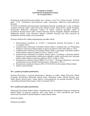 Protokół nr 52/2014 z posiedzenia Komisji Rewizyjnej 16 września 2014 r. Posiedzenie Komisji Rewizyjnej odbyło się w ratuszu w sali 312 i trwało od godz. 16.00 do godz. 17.50. Posiedzeniu przewodniczył radny Przemysław Bukowski przewodniczący Komisji. W chwili stwierdzania prawomocności posiedzenia Komisji uczestniczyło w nim 6 radnych członków Komisji (radni: Adam Pieszczuk, Michał Nowak, Marek Kawa, Marek Przygoda, Przemysław Bukowski, Marcjanna Lotko). W trakcie realizacji porządku obrad na posiedzenie Komisji doszli radni: Tomasz Kaliszan, Dariusz Smagała, Zbigniew Kubalańca, Małgorzata Sekula. Listę obecności radnych członków Komisji oraz listę obecnych na posiedzeniu Komisji załącza się do protokołu. Komisja obradowała według następującego porządku obrad: 1. Zatwierdzenie protokołu nr 51/2014 z posiedzenia Komisji Rewizyjnej w dniu 19 sierpnia 2014 r. 2. Zaopiniowanie Informacji Prezydenta Miasta Opola o kształtowaniu się Wieloletniej Prognozy Finansowej Miasta Opola za pierwsze półrocze 2014 roku (druk nr 1192). 3. Zaopiniowanie Informacji Prezydenta Miasta Opola o przebiegu wykonania budŜetu miasta Opola za pierwsze półrocze 2014 r. (druk nr 1193). 4. Zaopiniowanie Informacji Prezydenta Miasta Opola o przebiegu wykonania planów finansowych samodzielnych publicznych zakładów opieki zdrowotnej oraz instytucji kultury miasta Opola za pierwsze półrocze 2014 r. (druk nr 1194). 5. Rozpatrzenie wyników kontroli BRM.1712.5.2014 - „Wynajem, dzierŜawa i uŜywanie nieruchomości przez Miejski Ośrodek Sportu i Rekreacji w 2013 r.” 6. Rozpatrzenie zasadności skargi nr OR-I.1510.40.2014 na Prezydenta Miasta Opola. 7. Sprawy róŜne Komisji. Do 1. punktu porządku posiedzenia: Komisja Rewizyjna w jawnym głosowaniu 6 głosami za (radni: Adam Pieszczuk, Marek Przygoda, Przemysław Bukowski, Marek Kawa, Marcjanna Lotko, Michał Nowak), przy braku głosów przeciwnych i barku głosów wstrzymujących się przyjęła protokół 51/2014 z posiedzenia Komisji Rewizyjnej w dniu 19 sierpnia 2014 r. Do 2. punktu porządku posiedzenia: Informację Prezydenta Miasta Opola o kształtowaniu się Wieloletniej Prognozy Finansowej Miasta Opola za pierwsze półrocze 2014 roku (druk nr 1192) przedstawił pan Paweł Krawczyk Naczelnik Wydziału BudŜetu Urzędu Miasta Opola. Pytań nie zadano. Dyskusji nie podjęto. Opinia Komisji Rewizyjnej Rady Miasta Opola z dnia 16 września 2014 r. do Informacji Prezydenta Miasta Opola o kształtowaniu się Wieloletniej Prognozy Finansowej Miasta Opola za pierwsze półrocze 2014 roku (druk nr 1192). Komisja wnioskuje do Rady Miasta Opola o przyjęcie ww. informacji. Opinię podjęto w jawnym głosowaniu 5 głosami za (radni: Marek Przygoda, Dariusz Smagała, Tomasz Kaliszan, Przemysław Bukowski, Marcjanna Lotko), przy braku głosów przeciwnych i 4 głosach wstrzymujących się (radni: Marek Kawa, Michał Nowak, Adam Pieszczuk, Małgorzata Sekula). Do 3. punktu porządku posiedzenia: Informację Prezydenta Miasta Opola o przebiegu wykonania budŜetu miasta Opola za pierwsze półrocze 2014 r. (druk nr 1193) przedstawił pan Paweł Krawczyk Naczelnik Wydziału BudŜetu Urzędu Miasta Opola. Pytanie do ww. informacji zadał radny Marek Kawa, a odpowiedzi udzielił pan Paweł Krawczyk. Dyskusji nie było. Opinia Komisji Rewizyjnej Rady Miasta Opola z dnia 16 września 2014 r. do Informacji Prezydenta Miasta Opola o przebiegu wykonania budŜetu miasta Opola za pierwsze półrocze 2014 r. (druk nr 1193). Komisja wnioskuje do Rady Miasta Opola o przyjęcie ww. informacji. Opinię podjęto w jawnym głosowaniu 5 głosami za (radni: Marek Przygoda, Dariusz Smagała, Tomasz Kaliszan, Przemysław Bukowski, Marcjanna Lotko), przy braku głosów przeciwnych i 3 głosach wstrzymujących się (radni: Marek Kawa, Adam Pieszczuk, Małgorzata Sekula). Do 4. punktu porządku posiedzenia: Informację Prezydenta Miasta Opola o przebiegu wykonania planów finansowych samodzielnych publicznych zakładów opieki zdrowotnej oraz instytucji kultury miasta Opola za pierwsze półrocze 2014 r. (druk nr 1194) przedstawił pan Paweł Krawczyk Naczelnik Wydziału BudŜetu Urzędu Miasta Opola. Pytań nie zadano. Dyskusji nie podjęto. 2 Opinia Komisji Rewizyjnej Rady Miasta Opola z dnia 16 września 2014 r. do Informacji Prezydenta Miasta Opola o przebiegu wykonania planów finansowych samodzielnych publicznych zakładów opieki zdrowotnej oraz instytucji kultury miasta Opola za pierwsze półrocze 2014 r. (druk nr 1194). Komisja wnioskuje do Rady Miasta Opola o przyjęcie ww. informacji. Opinię podjęto w jawnym głosowaniu 8 głosami za (radni: Marek Przygoda, Dariusz Smagała, Tomasz Kaliszan, Przemysław Bukowski, Marcjanna Lotko, Marek Kawa, Zbigniew Kubalańca, Michał Nowak), przy braku głosów przeciwnych i 1 głosie wstrzymującym się (radny Adam Pieszczuk). Do 5. punktu porządku posiedzenia: Protokół kontroli BRM.1712.5.2014 w zakresie: „Wynajem, dzierŜawa i uŜywanie nieruchomości przez Miejski Ośrodek Sportu i Rekreacji w 2013 r.” wraz z zastrzeŜeniami Prezydenta Miasta i odniesienia zespołu do zastrzeŜeń pokontrolnych odczytał radny Marek Kawa przewodniczący zespołu kontrolnego. Pytania do protokołu kontroli nie zadano. W dyskusji głos zabrał dyrektor Miejskiego Ośrodka Sportu i Rekreacji w Opolu pan Sławomir KoŜuszko i radny Marek Kawa. Radni członkowie Komisji przystąpili do głosowania nad przyjęciem zaleceń pokontrolnych: 1. NaleŜy dokonać przeglądu dotychczasowych umów najmu i dzierŜawy, zwłaszcza pochodzących jeszcze z okresu lat 90-tych, pod kątem okresu trwania stosunku najmu lub dzierŜawy, charakteru prowadzonej działalności przez najemcę oraz pod kątem urealnienia kosztów i stawek, a następnie dokonać ewentualnych zmian w ich treści, aby korespondowały z aktualnymi realiami gospodarczo-ekonomicznymi. Za przyjęciem 1 zalecenia głosowało jednogłośnie 10 radnych (radni: Przemy