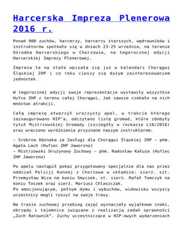 Harcerska Impreza Plenerowa 2016 r. Ponad 900 zuchów, harcerzy, harcerzy starszych, wędrowników i instruktorów spotkało się w dniach 23-25 września, na terenie Ośrodka Harcerskiego w Chorzowie, na tegorocznej edycji Harcerskiej Imprezy Plenerowej. Impreza ta na stałe wpisała się już w kalendarz Chorągwi Śląskiej ZHP i co roku cieszy się dużym zainteresowaniem jednostek. W tegorocznej edycji swoje reprezentacje wystawiły wszystkie Hufce ZHP z terenu całej Chorągwi. Jak zawsze czekało na nich mnóstwo atrakcji. Całą imprezę otworzył uroczysty apel, w trakcie którego zainaugurowano HIP’a, odczytano listę gromad, które zdobyły tytuł Mistrzowskiej Gromady (szczegóły w rozkazie L16/2016) oraz wręczono wyróżnienia przyznane naszym instruktorom: – Srebrna Odznaka za Zasługi dla Chorągwi Śląskiej ZHP – phm. Agata Lach (Hufiec ZHP Jaworzno) – Mistrzowski Drużynowy Zuchowy – phm. Radosław Kałuża (Hufiec ZHP Jaworzno) Po apelu nastąpił pokaz przygotowany specjalnie dla nas przez oddział Policji Konnej z Chorzowa w składzie: sierż. szt. Przemysław Wiza na koniu Smyczek, st. sierż. Rafał Tomczyk na koniu Toszek oraz sierż. Mariusz Chlaszczak. Po emocjonującym, pełnym dymu i wybuchów, widowisku wszyscy uczestnicy mogli ruszyć na swoje trasy. Na trasie zuchowej przebieg zajęć wyznaczały wyjątkowe znaki, obrzędy i tajemnice związane z realizacją zadań sprawności „Zuch Ratownik”. Zuchy uczestniczące w HIP-owych wydarzeniach nauczyły się jak mają reagować w sytuacjach kryzysowych, jak udzielać pierwszej pomocy, jak zachować się podczas kąpieli czy podczas korzystania z dróg, przygotowały własną kartę ICE a także zmierzyły się w turnieju zuchowym. We współzawodnictwie Zuchów Ratowników wyróżniły się Gromady: – – – – 7 GZ Przyjaciele Słońca – Hufiec ZHP Ziemi Rybnickiej 26 GZ Tropiciele Przygód – Hufiec ZHP Ziemi Rybnickiej GZ Czarownice i Czarodzieje – Hufiec ZHP Ziemi Tyskiej 6 GZ Rozbrykane Mandarynki – Hufiec ZHP Ziemi Będzińskiej Na trasie harcerskiej, na uczestników ponownie czekał „Harckeszing” jednak tym razem… po Śląsku. Ponadto patrole mogły sprawdzić swoją wiedzę i umiejętności na stoisku edukacyjnym, w „Memory po Śląsku” oraz na punktach z historią Śląska oraz rysunkiem węglem. Na najlepsze patrole czekały nagrody w postaci „kosza Śląskich maszketów”, a podium wyglądało następująco: – miejsce I – patrol 110 „Szotmeni” z Hufca ZHP Chorzów – miejsce II – patrol „Czekoladowe Żabki” z Hufca ZHP Żywiec – miejsce III – patrol „Impessa” z Hufca ZHP Beskidzkiego Zaś na trasie łączonej – Starszoharcerskiej i Wędrowniczej – patrole między innymi zwiedzały bunkier oraz stację sejsmologiczną w Planetarium Śląskim, przeszły mini regaty kajakowe, sprawdziły się z zakresu I pomocy przedmedycznej a także zapoznały się z możliwościami pracy ze specjalnościami wraz z przedstawicielami Wydziału Wsparcia Specjalności GK ZHP oraz zasadami zdobywania odznaki SWA w trakcie zajęć z hm. Maciejem Czechowskim. Na tej trasie zwyciężył Patrol nr 5, który powstał z połączenia sił „Czekoladowych Żabek”przedstawicieli Hufca ZHP Żywiec oraz patrolu „Niebo” z Hufca ZHP Ziemi Będzińskiej. Dodatkowo nasi HS i W stworzyli film o tym „Co Ci dało harcerstwo?” Efekty ich pracy możecie podziwiać poniżej Oprócz gier i zadań na trasach w pionach metodycznych, wszyscy zebrani mogli skorzystać również z punktów aktywności przygotowanych przez Zakład Ubezpieczeń Społecznych, Zespół Pilota Chorągwi Śląskiej ZHP czy Inspektorat Ratowniczy Chorągwi Śląskiej ZHP, pograć w Strefie Gier zorganizowanej przez Harcerski Klub Gier “Gildia” z VI Szczepu Harcerskiego “Chwaty” wraz ze sklepem Morigal.pl a także rozładować nieco energii na dmuchańcach Harcerskiego Klubu Podróżnika z Hufca ZHP Jaworzno czy ściance wspinaczkowej przygotowanej przez hm. Sławomira Gajdę z Hufca ZHP Beskidzkiego. Wieczorem odbyło się ognisko na 133 harcerskie gardła, na terenie Muzeum „Górnośląski Park Etnograficzny” zaś w niedzielny poranek przyszedł czas uścisków, podziękowań, wspólnych zdjęć i pożegnań. Przybyłym gościom oraz organizatorom serdecznie dziękujemy! Zwycięzcom gratulujemy! I do zobaczenia za rok! http://slaska.zhp.pl/wp-content/uploads/2016/09/14512280_94371 8735738157_5015128548696915968_n.mp4