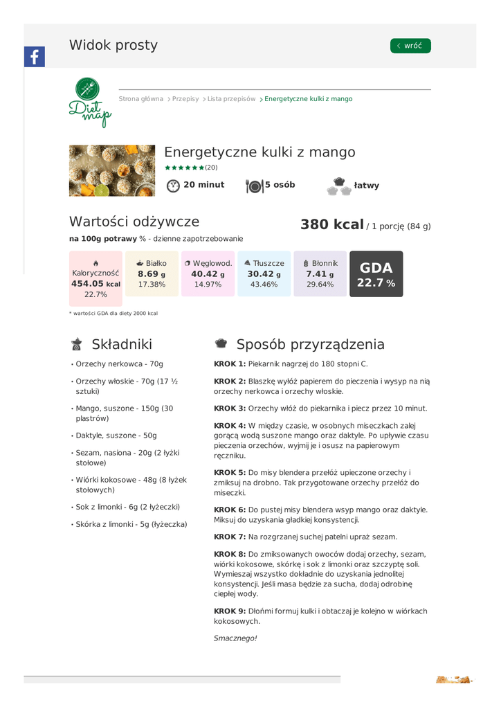 Widok prosty wróć Strona główna Przepisy Lista przepisów Energetyczne kulki z mango Energetyczne kulki z mango (20) 20 minut 5 osób Wartości odżywcze łatwy 380 kcal / 1 porcję (84 g) na 100g potrawy % - dzienne zapotrzebowanie Białko Kaloryczność 8.69 454.05 17.38% kcal g Węglowod. 40.42 g 14.97% Tłuszcze 30.42 g 43.46% Błonnik 7.41 g 29.64% GDA 22.7 % 22.7% * wartoś ci GDA dla diety 2000 kcal Składniki Sposób przyrządzenia Orzechy nerkowca - 70g KROK 1: Piekarnik nagrzej do 180 stopni C. Orzechy włoskie - 70g (17 ½ sztuki) KROK 2: Blaszkę wyłóż papierem do pieczenia i wysyp na nią orzechy nerkowca i orzechy włoskie. Mango, suszone - 150g (30 plastrów) KROK 3: Orzechy włóż do piekarnika i piecz przez 10 minut. Daktyle, suszone - 50g Sezam, nasiona - 20g (2 łyżki stołowe) Wiórki kokosowe - 48g (8 łyżek stołowych) Sok z limonki - 6g (2 łyżeczki) Skórka z limonki - 5g (łyżeczka) KROK 4: W między czasie, w osobnych miseczkach zalej gorącą wodą suszone mango oraz daktyle. Po upływie czasu pieczenia orzechów, wyjmij je i osusz na papierowym ręczniku. KROK 5: Do misy blendera przełóż upieczone orzechy i zmiksuj na drobno. Tak przygotowane orzechy przełóż do miseczki. KROK 6: Do pustej misy blendera wsyp mango oraz daktyle. Miksuj do uzyskania gładkiej konsystencji. KROK 7: Na rozgrzanej suchej patelni upraż sezam. KROK 8: Do zmiksowanych owoców dodaj orzechy, sezam, wiórki kokosowe, skórkę i sok z limonki oraz szczyptę soli. Wymieszaj wszystko dokładnie do uzyskania jednolitej konsystencji. Jeśli masa będzie za sucha, dodaj odrobinę ciepłej wody. KROK 9: Dłońmi formuj kulki i obtaczaj je kolejno w wiórkach kokosowych. Smacznego! Serwis internetowy DietMap wykorzystuje pliki cookies, które umożliwiają i ułatwiają Ci korzystanie z jego zasobów. Korzystając z serwisu wyrażasz jednocześnie zgodę na wykorzystanie plików cookies. Szczegółowe informacje znajdziesz w zakładce Zastrzeżenia Prawne. akceptuję