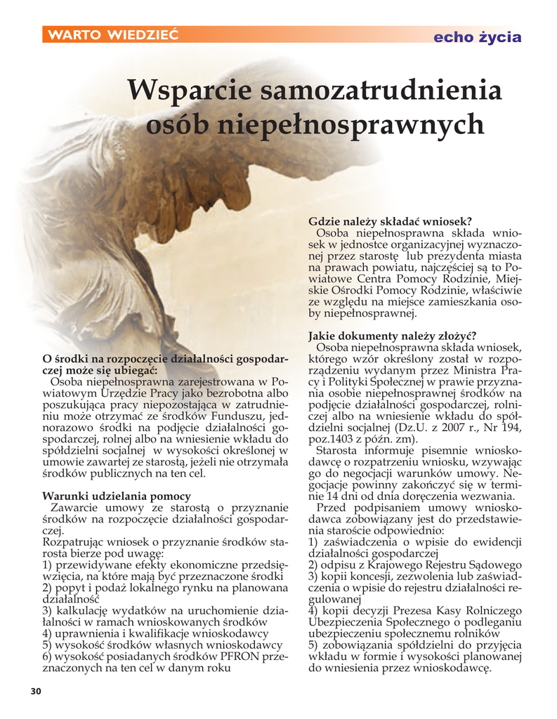 WARTO WIEDZIEĆ echo życia Wsparcie samozatrudnienia osób niepełnosprawnych Gdzie należy składać wniosek? Osoba niepełnosprawna składa wniosek w jednostce organizacyjnej wyznaczonej przez starostę lub prezydenta miasta na prawach powiatu, najczęściej są to Powiatowe Centra Pomocy Rodzinie, Miejskie Ośrodki Pomocy Rodzinie, właściwie ze względu na miejsce zamieszkania osoby niepełnosprawnej. O środki na rozpoczęcie działalności gospodarczej może się ubiegać: Osoba niepełnosprawna zarejestrowana w Powiatowym Urzędzie Pracy jako bezrobotna albo poszukująca pracy niepozostająca w zatrudnieniu może otrzymać ze środków Funduszu, jednorazowo środki na podjęcie działalności gospodarczej, rolnej albo na wniesienie wkładu do spółdzielni socjalnej w wysokości określonej w umowie zawartej ze starostą, jeżeli nie otrzymała środków publicznych na ten cel. Warunki udzielania pomocy Zawarcie umowy ze starostą o przyznanie środków na rozpoczęcie działalności gospodarczej. Rozpatrując wniosek o przyznanie środków starosta bierze pod uwagę: 1) przewidywane efekty ekonomiczne przedsięwzięcia, na które mają być przeznaczone środki 2) popyt i podaż lokalnego rynku na planowana działalność 3) kalkulację wydatków na uruchomienie działalności w ramach wnioskowanych środków 4) uprawnienia i kwalifikacje wnioskodawcy 5) wysokość środków własnych wnioskodawcy 6) wysokość posiadanych środków PFRON przeznaczonych na ten cel w danym roku 30 Jakie dokumenty należy złożyć? Osoba niepełnosprawna składa wniosek, którego wzór określony został w rozporządzeniu wydanym przez Ministra Pracy i Polityki Społecznej w prawie przyznania osobie niepełnosprawnej środków na podjęcie działalności gospodarczej, rolniczej albo na wniesienie wkładu do spółdzielni socjalnej (Dz.U. z 2007 r., Nr 194, poz.1403 z późn. zm). Starosta informuje pisemnie wnioskodawcę o rozpatrzeniu wniosku, wzywając go do negocjacji warunków umowy. Negocjacje powinny zakończyć się w terminie 14 dni od dnia doręczenia wezwania. Przed podpisaniem umowy wnioskodawca zobowiązany jest do przedstawienia staroście odpowiednio: 1) zaświadczenia o wpisie do ewidencji działalności gospodarczej 2) odpisu z Krajowego Rejestru Sądowego 3) kopii koncesji, zezwolenia lub zaświadczenia o wpisie do rejestru działalności regulowanej 4) kopii decyzji Prezesa Kasy Rolniczego Ubezpieczenia Społecznego o podleganiu ubezpieczeniu społecznemu rolników 5) zobowiązania spółdzielni do przyjęcia wkładu w formie i wysokości planowanej do wniesienia przez wnioskodawcę. echo życia Przekazanie środków może nastąpić przed dniem przedstawienia przez wnioskodawcę kopii koncesji lub zezwolenia, jeżeli wydanie koncesji lub zezwolenia jest uzależnione od posiadania przedmiotów lub urządzeń niezbędnych do prowadzenia danego rodzaju działalności, a wnioskodawca zamierza dokonać zakupu tych przedmiotów i urządzeń w ramach przyznanych środków. W takim przypadku, wnioskodawca jest zobowiązany do przedstawienia staroście kopii koncesji albo zezwolenia w terminie nie dłuższym niż 6 miesięcy od dnia wypłacenia środków pod rygorem zwrotu otrzymanych środków. Wysokość środków Maksymalna wysokość przyznanych środków nie może przekroczyć piętnastokrotnego przeciętnego wynagrodzenia. Przyznane środki udzielane są zgodnie z zasadami de minimis. Umowa pomiędzy wnioskodawcą a starostą określa w szczególności: 1) zobowiązanie starosty do: a) wypłaty środków w kwocie ustalonej w wyniku negocjacji b) co najmniej jednokrotnego zweryfikowania prawidłowości realizacji warunków umowy przez wnioskodawcę, w czasie obowiązywania umowy. 2) Zobowiązanie wnioskodawcy do: a) przeznaczenia środków na cel określony w umowie b) prowadzenia działalności, lub członkostwa w spółdzielni socjalnej przez okres co najmniej 24 miesięcy, z uwzględnieniem okresów choroby, powołania do odbycia zasadniczej lub zastępczej służby wojskowej lub korzystania ze świadczenia rehabilitacyjnego c) udokumentowania realizacji umowy na wezwanie starosty d) umożliwienia wykonania przez starostę czynności weryfikacyjnych e) informowania starosty o wszelkich zmianach dotyczących realizacji umowy w terminie 7 dni od dnia wystąpienia tych zmian f) rozliczenia otrzymanych środków w terminie określonym w umowie g) zwrotu: - otrzymanych środków oraz - odsetek od środków, naliczonych od dnia ich otrzymania w wysokości określonej jak dla zaległości podatkowych, WARTO WIEDZIEĆ w terminie 3 miesięcy od dnia otrzymania wezwania starosty do zapłaty lub ujawnienia naruszenia co najmniej jednego z warunków umowy h) zabezpieczenia zwrotu kwoty środków – w formie poręczenia, w tym poręczenia spółdzielni socjalnej, weksla z poręczeniem wekslowym (awal), gwarancji bankowej, zestawu na prawach lub rzeczach, blokady rachunku bankowego lub aktu notarialnego o poddaniu się egzekucji przez dłużnika 3. Odsetek, o których mowa w pkt.2 lit. g tiret drugi, nie nalicza się w przypadku, gdy środki zostały wypłacone wnioskodawcy w wysokości wyższej od należnej z przyczyn niezależnych od wnioskodawcy 4. Umowę zawiera się w formie pisemnej. Zmiana umowy wymaga formy pisemnej. Osoba niepełnosprawna, która otrzymała jednorazowo środki na podjęcie działalności gospodarczej, rolniczej albo na wniesienie wkładu do spółdzielni socjalnej, jest obowiązana do zwrotu otrzymanych środków wraz z odsetkami w wysokości określonej jak dla zaległości podatkowych, jeżeli z przyczyn leżących po jej stronie zostały naruszone warunki umowy. Osoba niepełnosprawna nie otrzyma tych pieniędzy, gdy ten sam cel sfinansuje wcześniej z innej pomocy finansowej uzyskanej z pieniędzy publicznych. Podstawa prawna • art. 12a ustawy z dnia 27.08.1997 r. o rehabilitacji zawodowej i społecznej oraz zatrudnianiu osób niepełnosprawnych (Dz. U. z 200