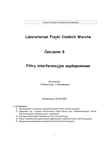 Instytut Fizyki Politechniki Wrocławskiej Laboratorium Fizyki Cienkich Warstw Ćwiczenie 8 Filtry interferencyjne wąskopasmowe Opracowanie: T.Wiktorczyk, C.Wesołowska aktualizacja, 02.02.2007 1. Cel ćwiczenia: 1) Wprowadzenie w tematykę cienkowarstwowych filtrów interferencyjnych. 2) Zapoznanie się z budową interferometru Fabry-Perota oraz cienkowarstwowych filtrów interferencyjnych dielektrycznych i metalowych. 3) Ilościowy opis przejścia światła przez filtr interferencyjny. 4) Pomiar charakterystyk spektralnych współczynnika transmisji filtrów interferencyjnych. 5) Wyznaczenie podstawowych parametrów filtrów interferencyjnych. 1 2. Wstęp Filtry interferencyjne są stosunkowo młodą dziedziną optyki. Do roku 1939 określony przedział widma światła białego zazwyczaj wydzielano monochromatorami, zaś do wyodrębnienia jednej długości fali z lampy spektralnej stosowano filtry absorpcyjne. Pierwszy metalowy filtr interferencyjny został opatentowany przez Geffeckena [1] w 1939 roku. Podczas II wojny światowej został skonstruowany filtr interferencyjny odbiciowy dla fal radarowych. Od 1947 roku obserwuje się olbrzymi postęp w dziedzinie filtrów interferencyjnych metalowych i dielektrycznych dla części widzialnej widma, ultrafioletu, a także dla podczerwieni bliskiej i dalszej [2-4] Przyczyną dużego zainteresowania filtrami interferencyjnymi są ich zalety i liczne zastosowania. Zaletami filtrów są między innymi: (a) prostota budowy, (b) łatwość obsługi, (c) duża wydajność świetlna w porównaniu z monochromatorem. Zastosowanie filtrów interferencyjnych umożliwia uproszczenie wielu konstrukcji przyrządów optycznych oraz wyeliminowanie w niektórych przyrządach lamp spektralnych. Np. w sacharymetrze (polarymetrze) zamiast lampy sodowej można stosować oświetlacz składający się ze źródła światła białego oraz filtru interferencyjnego dla żółtej linii sodu. Podobnie w gładkościomierzach i mikroskopach interferencyjnych. Zastosowanie lampy spektralnej z filtrem interferencyjnym gwarantuje lepszą, niż przy zastosowaniu filtru absorpcyjnego, czystość linii spektralnej. Dzięki filtrom dielektrycznym astronomowie mogą rejestrować o wiele mniejsze natężenie światła niż w przypadku używania monochromatora. Filtr interferencyjny ciągły, lub komplet filtrów interferencyjnych, w wielu badaniach zastępuje z powodzeniem monochromator. 3. Interferometr Fabry-Perota Filtry interferencyjne wąskopasmowe są pewną odmianą interferometru Fabry-Perota (1899r). Interferometr F-P odegrał dużą rolę w rozwoju optyki cienkich warstw. Teoria filtrów została opracowana na bazie teorii interferometru F-P. Interferometr F-P składa się z dwóch płaskich płytek szklanych lub kwarcowych (zwanych etalonami F-P), pokrytych jednostronnie metalową warstwą odbijającą o wysokim współczynniku odbicia światła R oraz przepuszczalności rzędu kilku procent. Płytki ustawia się w ten sposób, aby między powierzchniami odbijającymi znajdowała się dokładnie płasko-równoległa warstwa powietrza, zwana warstwą rozdzielającą. Odległość płytek (grubość warstwy rozdzielającej d) ustala się za pomocą pierścieni. Na rysunku 1 przedstawiono schemat interferometru F-P. Rys.1. Schemat układu interferencyjnego Fabry-Perota Jeżeli na taki układ pada równoległa wiązka światła spójnego i monochromatycznego, to między powierzchniami odbijającymi ulega ona wielokrotnym odbiciom i po przejściu przez układ promienie 2 mogą ze sobą interferować. Na skutek interferencji wielopromieniowej otrzymuje się układ prążków interferencyjnych. Rozdzielająca warstwa powietrza w interferometrze jest gruba (d ~ 1 cm), dlatego otrzymuje się bardzo wysokie rzędy interferencji (m ~ 4×104). Dlatego też interferometr F-P oświetlony światłem niemonochromatycznym nie daje prążków interferencyjnych. Interferometr służy do badania subtelnej oraz nadsubtelnej struktury linii widmowych. Jeżeli badana linia widmowa składa się z dwóch bliskich długości fal λ1 oraz λ2 każda z tych długości fal, z powodu wielokrotnych odbić, daje swój układ prążków interferencyjnych. Nieznaczne różnice λ1 oraz λ2 powodują znaczne przesunięcia układu prążków. Klasyczny interferometr pozwala rozdzielić długości fal λ1 oraz λ2 różniące się o 0,005Å. Zdolność rozdzielcza interferometru F-P jest wprost proporcjonalna do rzędu interferencji (grubości warstwy rozdzielającej), odwrotnie proporcjonalna do połówkowej szerokości prążków. Połówkowa szerokość prążków zależy od współczynnika odbicia warstw odbijających, co wykażemy dalej dla filtru interferencyjnego. 4. Filtry interferencyjne wąskopasmowe Filtr interferencyjny wąskopasmowy jest zwartym i poręcznym interferometrem Fabry-Perota wykonanym z cienkich warstw. Rolę rozdzielającej warstwy powietrza w klasycznym interferometrze F-P spełnia warstwa dielektryczna (nieabsorpcyjna) o grubości optycznej n1·d1=m·λ0/2 dla wybranej długości fali λ0. Znajduje się ona między dwiema warstwami odbijającymi o współczynnikach odbicia R 1 oraz R2. Metalowe filtry interferencyjne mają metalowe warstwy odbijające (najczęściej warstwy srebra dla części widzialnej widma, glinu dla ultrafioletu). W dielektrycznych filtrach interferencyjnych warstwy odbijające są wykonane z wielowarstwowych pokryć dielektrycznych typu WNW (przy czym W-wysoki, N-niski współczynnik załamania, grubość optyczna każdej warstwy λ/4), które zapewniają wysoki współczynnik odbicia w szerokim przedziale widma. Warstwy naparowuje się kolejno w wysokiej próżni na podłoże szklane (kwarcowe lub inne) , potem dla zabezpieczenia filtru (warstw) przykleja się drugą płytkę szklaną. Na rysunkach 2 i 3 przedstawiono schematy filtru interferencyjnego metalowego oraz dielektrycznego. Rys. 2. Filtr interferencyjny metalowy. R1,R2- warstwy metalowe, n1·