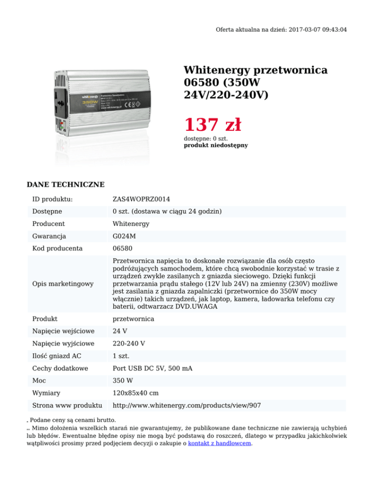 Oferta aktualna na dzień: 2017-03-07 09:43:04 Whitenergy przetwornica 06580 (350W 24V/220-240V) 137 zł dostępne: 0 szt. produkt niedostępny DANE TECHNICZNE ID produktu: ZAS4WOPRZ0014 Dostępne 0 szt. (dostawa w ciągu 24 godzin) Producent Whitenergy Gwarancja G024M Kod producenta 06580 Opis marketingowy Przetwornica napięcia to doskonałe rozwiązanie dla osób często podróżujących samochodem, które chcą swobodnie korzystać w trasie z urządzeń zwykle zasilanych z gniazda sieciowego. Dzięki funkcji przetwarzania prądu stałego (12V lub 24V) na zmienny (230V) możliwe jest zasilania z gniazda zapalniczki (przetwornice do 350W mocy włącznie) takich urządzeń, jak laptop, kamera, ładowarka telefonu czy baterii, odtwarzacz DVD.UWAGA Produkt przetwornica Napięcie wejściowe 24 V Napięcie wyjściowe 220-240 V Ilość gniazd AC 1 szt. Cechy dodatkowe Port USB DC 5V, 500 mA Moc 350 W Wymiary 120x85x40 cm Strona www produktu http://www.whitenergy.com/products/view/907 Podane ceny są cenami brutto. ** Mimo dołożenia wszelkich starań nie gwarantujemy, że publikowane dane techniczne nie zawierają uchybień lub błędów. Ewentualne błędne opisy nie mogą być podstawą do roszczeń, dlatego w przypadku jakichkolwiek wątpliwości prosimy przed podjęciem decyzji o zakupie o kontakt z handlowcem. * GALERIA