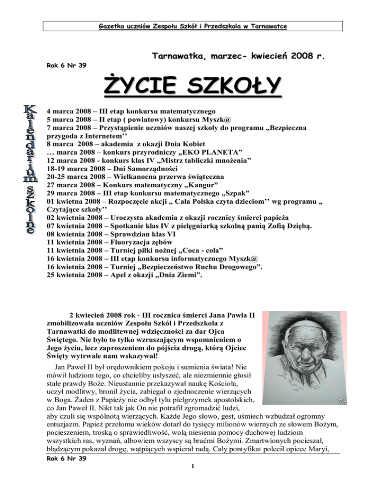 Gazetka uczniów Zespołu Szkół i Przedszkola w Tarnawatce Rok 6 Nr 39 Tarnawatka, marzec- kwiecień 2008 r. ŻYCIE SZKOŁY 4 marca 2008 – III etap konkursu matematycznego 5 marca 2008 – II etap ( powiatowy) konkursu Myszk@ 7 marca 2008 – Przystąpienie uczniów naszej szkoły do programu „Bezpieczna przygoda z Internetem’’ 8 marca 2008 – akademia z okazji Dnia Kobiet … marca 2008 – konkurs przyrodniczy „EKO PLANETA” 12 marca 2008 - konkurs klas IV ,,Mistrz tabliczki mnożenia” 18-19 marca 2008 – Dni Samorządności 20-25 marca 2008 – Wielkanocna przerwa świąteczna 27 marca 2008 – Konkurs matematyczny „Kangur” 29 marca 2008 – III etap konkursu matematycznego „Szpak” 01 kwietna 2008 – Rozpoczęcie akcji „ Cała Polska czyta dzieciom’’ wg programu „ Czytające szkoły’’ 02 kwietnia 2008 – Uroczysta akademia z okazji rocznicy śmierci papieża 07 kwietnia 2008 – Spotkanie klas IV z pielęgniarką szkolną panią Zofią Dziębą. 08 kwietnia 2008 – Sprawdzian klas VI 11 kwietnia 2008 – Fluoryzacja zębów 11 kwietnia 2008 – Turniej piłki nożnej „Coca - cola” 16 kwietnia 2008 – III etap konkursu informatycznego Myszk@ 16 kwietnia 2008 – Turniej „Bezpieczeństwo Ruchu Drogowego”. 25 kwietnia 2008 – Apel z okazji „Dnia Ziemi”. 2 kwiecień 2008 rok - III rocznica śmierci Jana Pawła II zmobilizowała uczniów Zespołu Szkół i Przedszkola z Tarnawatki do modlitewnej wdzięczności za dar Ojca Świętego. Nie było to tylko wzruszającym wspomnieniem o Jego życiu, lecz zaproszeniem do pójścia drogą, którą Ojciec Święty wytrwale nam wskazywał! Jan Paweł II był orędownikiem pokoju i sumienia świata! Nie mówił ludziom tego, co chcieliby usłyszeć, ale niezmiennie głosił stałe prawdy Boże. Nieustannie przekazywał naukę Kościoła, uczył modlitwy, bronił życia, zabiegał o zjednoczenie wierzących w Boga. Żaden z Papieży nie odbył tylu pielgrzymek apostolskich, co Jan Paweł II. Nikt tak jak On nie potrafił zgromadzić ludzi, aby czuli się wspólnotą wierzących. Każde Jego słowo, gest, uśmiech wzbudzał ogromny entuzjazm. Papież przełomu wieków dotarł do tysięcy milionów wiernych ze słowem Bożym, pocieszeniem, troską o sprawiedliwość, wolą niesienia pomocy duchowej ludziom wszystkich ras, wyznań, albowiem wszyscy są braćmi Bożymi. Zmartwionych pocieszał, błądzącym pokazał drogę, wątpiących wspierał radą. Cały pontyfikat polecił opiece Maryi, Rok 6 Nr 39 1 Gazetka uczniów Zespołu Szkół i Przedszkola w Tarnawatce mówiąc znane słowa: Totus Tuus” czyli cały Twój. Nie bał się pójść za głosem Chrystusa wołającego „ Pójdź za mną”. W roku Pańskim 2005 zastępca Jezusa Chrystusa, na oczach milionów ludzi na całym świecie, dźwigał swój ciężki krzyż, aby zakończyć ostatnią pielgrzymkę. 1 kwietnia Ojciec Święty wypowiedział jedno z ostatnich zdań : „ Szukałem was, a teraz wy przyszliście do mnie, dziękuję wam za to”. 2 kwietnia w wigilię Bożego Miłosierdzia o godzinie 21:37 nasz ukochany Ojciec Święty Jan Paweł II odszedł do domu Ojca. Jego ostatnim słowem było: „ Amen”. Kochany Ojcze Święty. Nie mogliśmy zatrzymać Cię na ziemi, lecz nigdy nie pozwolimy Ci odejść z naszych serc. Zostaniesz z nami zawsze. W naszych myślach, wspomnieniach, sercach. Nigdy nie zapomnimy Twojego dobrotliwego przenikliwego spojrzenia, budzącego ufność uśmiechu. Twojej twarzy pogodnej, mimo bólu, mimo cierpienia. Nie wytrzemy z pamięci ujmujących gestów i słów, które są dla nas jak najważniejszy testament. Do zobaczenia w Raju, Ojcze Święty! Montaż słowno- muzyczny przygotowali uczniowie pod kierunkiem pani Anety Pastuszek. 18 kwietnia 2008 roku w naszej szkole odbył się uroczysty apel z okazji Dnia Służby Zdrowia. Przedstawili go uczniowie klas 2 i 5b pod kierunkiem pani Jolanty Wołoszyn oraz pani Moniki Czerniak-Uchman. Jako goście do naszej szkoły przybyli pani stomatolog Sidorowicz, pielęgniarki pani Zofia Dzięba oraz pani Zofia Szymczuk. Apel był bardzo interesujący. Uświadomił nam że warto dbać o siebie i swoje zdrowie. Nie wolno się zaniedbywać! Pamiętajmy o tej przestrodze, którą tak pięknie przedstawili nam uczniowie. Zdrowie na wesoło W gabinecie rentgenologicznym Szpitala Wojskowego, dwóch techników ogląda, wykonane przed trzema zaledwie minutami, zdjęcie klatki piersiowej nałogowego palacza. - Kazik - pyta jeden - Co to za małe szkieleciki stojące jakby w szeregu na całym lewym płucu tego gościa?! Kazik przygląda się dłuższą chwilę, podnosi się, otwiera drzwi, wystawia głowę na zewnątrz, potem podchodzi do konsolety sterującej "aparatem" i mówi: - Trochę za dużą moc promieni nastawiliśmy. To dzieci z przedszkola "Jagódka", przyszły na szczepienie do gabinetu obok i czekają na korytarzu. Pacjent skarży sie doktorowi: - Panie doktorze, nie mogę usnąć. Przewracam sie z boku na bok i nic! - Tez bym nie zasnął jakbym sie tak wiercił. Rok 6 Nr 39 2 Gazetka uczniów Zespołu Szkół i Przedszkola w Tarnawatce U dentysty. - Co by mi pan radził zrobić przy moich żółtych zębach? - Najlepiej założyć brązowy krawat ! „Bezpieczna przygoda z Internetem” Co to jest e-learning? - sposób przekazywania wiedzy oparty na mediach elektronicznych; - nowoczesny sposób na dostarczenie wiedzy; - nauczanie z wykorzystaniem technologii informatycznych. 7 marca 2008 roku uczniowie naszej szkoły przystąpili do programu „Bezpieczna przygoda z Internetem’’ Rozpoczęliśmy od spotkania i prezentacji multimedialnej przygotowanej i przeprowadzonej przez p. Marka Czerwonkę. Następnie chętni uczniowie przystąpili do kursu i zdobywania kolejnych stopni wtajemniczenia. Cały kurs obejmuje 8 modułów w tym siedmiu stopni wtajemniczenia. Oto kolejne zdobywane przez uczniów stopnie wtajemniczenia: - Stopień 1 – O Internecie - Stopień 2 
