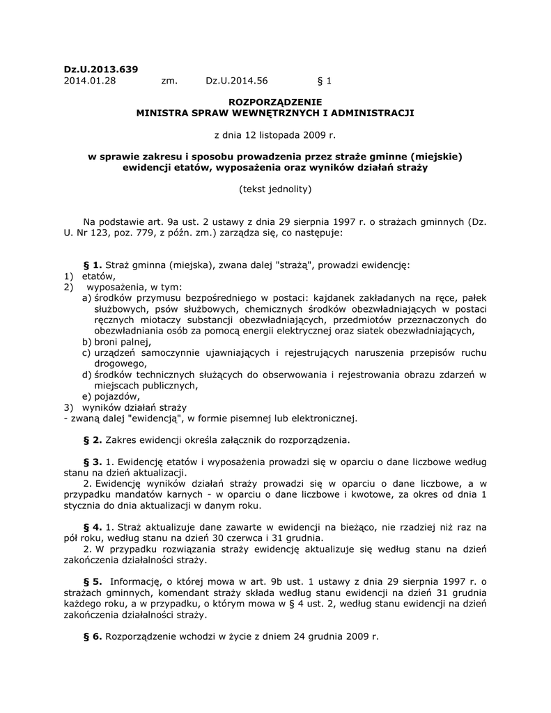 Dz.U.2013.639 2014.01.28 zm. Dz.U.2014.56 §1 ROZPORZĄDZENIE MINISTRA SPRAW WEWNĘTRZNYCH I ADMINISTRACJI z dnia 12 listopada 2009 r. w sprawie zakresu i sposobu prowadzenia przez straże gminne (miejskie) ewidencji etatów, wyposażenia oraz wyników działań straży (tekst jednolity) Na podstawie art. 9a ust. 2 ustawy z dnia 29 sierpnia 1997 r. o strażach gminnych (Dz. U. Nr 123, poz. 779, z późn. zm.) zarządza się, co następuje: § 1. Straż gminna (miejska), zwana dalej "strażą", prowadzi ewidencję: 1) etatów, 2) wyposażenia, w tym: a) środków przymusu bezpośredniego w postaci: kajdanek zakładanych na ręce, pałek służbowych, psów służbowych, chemicznych środków obezwładniających w postaci ręcznych miotaczy substancji obezwładniających, przedmiotów przeznaczonych do obezwładniania osób za pomocą energii elektrycznej oraz siatek obezwładniających, b) broni palnej, c) urządzeń samoczynnie ujawniających i rejestrujących naruszenia przepisów ruchu drogowego, d) środków technicznych służących do obserwowania i rejestrowania obrazu zdarzeń w miejscach publicznych, e) pojazdów, 3) wyników działań straży - zwaną dalej "ewidencją", w formie pisemnej lub elektronicznej. § 2. Zakres ewidencji określa załącznik do rozporządzenia. § 3. 1. Ewidencję etatów i wyposażenia prowadzi się w oparciu o dane liczbowe według stanu na dzień aktualizacji. 2. Ewidencję wyników działań straży prowadzi się w oparciu o dane liczbowe, a w przypadku mandatów karnych - w oparciu o dane liczbowe i kwotowe, za okres od dnia 1 stycznia do dnia aktualizacji w danym roku. § 4. 1. Straż aktualizuje dane zawarte w ewidencji na bieżąco, nie rzadziej niż raz na pół roku, według stanu na dzień 30 czerwca i 31 grudnia. 2. W przypadku rozwiązania straży ewidencję aktualizuje się według stanu na dzień zakończenia działalności straży. § 5. Informację, o której mowa w art. 9b ust. 1 ustawy z dnia 29 sierpnia 1997 r. o strażach gminnych, komendant straży składa według stanu ewidencji na dzień 31 grudnia każdego roku, a w przypadku, o którym mowa w § 4 ust. 2, według stanu ewidencji na dzień zakończenia działalności straży. § 6. Rozporządzenie wchodzi w życie z dniem 24 grudnia 2009 r. ZAŁĄCZNIK WZÓR EWIDENCJA ETATÓW, WYPOSAŻENIA ORAZ WYNIKÓW DZIAŁAŃ STRAŻY .............................................................................................. (nazwa straży gminnej/miejskiej i nazwa gminy/miasta) według stanu na dzień ............ r. Adres ................................................................................................................................. ........... Numery telefonów ........................................................................................................................ Numery faksów ............................................................................................................................ Adres poczty elektronicznej ......................................................................................................... Samodzielna jednostka organizacyjna/jednostka organizacyjna w strukturze urzędu gminy* Data powołania ............................................................................................................................ Część I Ewidencja etatów Stanowiska w straży gminnej (miejskiej) Liczba etatów na poszczególnych stanowiskach pełny etat komendant zastępca komendanta naczelnik zastępca naczelnika kierownik zastępca kierownika starszy inspektor inspektor młodszy inspektor starszy specjalista specjalista młodszy specjalista starszy strażnik strażnik młodszy strażnik 3 /4 etatu 1 /2 etatu 1 /4 etatu inny wymia etatu aplikant Razem strażnicy stanowiska urzędnicze stanowiska pomocnicze i obsługi Liczba etatów ogółem * Niepotrzebne skreślić. CZĘŚĆ II EWIDENCJA WYPOSAŻENIA Lp. Wyposażenie 1 kajdanki zakładane na ręce 2 pałki służbowe 3 psy służbowe 4 chemiczne środki obezwładniające obezwładniających w postaci ręcznych Liczba miotaczy substancji 5 przedmioty przeznaczone do obezwładniania osób za pomocą energii elektrycznej 6 siatki obezwładniające 7 broń palna 8 urządzenia samoczynnie ujawniające i rejestrujące naruszenia przepisów ruchu drogowego: a) stacjonarne urządzenia rejestrujące b) urządzenia rejestrujące przejazd na czerwonym świetle c) przenośne urządzenia rejestrujące 9 10 środki techniczne służące do obserwowania i rejestrowania obrazu zdarzeń w miejscach publicznych pojazdy: a) samochody b) motocykle c) motorowery d) rowery 11 konie Część III Ewidencja wyników działań straży Lp. Rodzaje wykroczeń zawartych w: Środki oddziaływania wychowawczego (art. 41 k.w.) Mandat liczba 1 Ustawie - Kodeks wykroczeń a) b) c) d) wykroczenia przeciwko porządkowi i spokojowi publicznemu wykroczenia przeciwko instytucjom państwowym, samorządowym i społecznym wykroczenia przeciwko bezpieczeństwu osób i mienia wykroczenia przeciwko bezpieczeństwu i porządkowi w komunikacji, w tym: - ujawnione przez urządzenia rejestrujące - pozostałe naruszenia e) f) g) h) i) j) k) wykroczenia przeciwko osobie wykroczenia przeciwko zdrowiu wykroczenia przeciwko mieniu wykroczenia przeciwko interesom konsumentów wykroczenia przeciwko obyczajności publicznej wykroczenia przeciwko urządzeniom użytku publicznego szkodnictwo leśne, polne i ogrodowe 2 przepisach wprowadzających Kodeks pracy 3 ustawie o wychowaniu w trzeźwości i przeciwdziałaniu alkoholizmowi 4 ustawie o ochronie zdrowia przed następstwami używania tytoniu i kwota Wnioski do sądu Sprawy przekazane innym organom lub instytucjom Raze wyrobów tytoniowych 5 ustawie o utrzymaniu czystości i porządku w gminach 6 ustawie o ochronie zwierząt 7 ustawie o odpadach 8 9 10 ustawie - Prawo ochrony środowiska ustawie - Prawo o miarach ustawie - Prawo wodne 11 ustawie o publicznym transporcie drogo