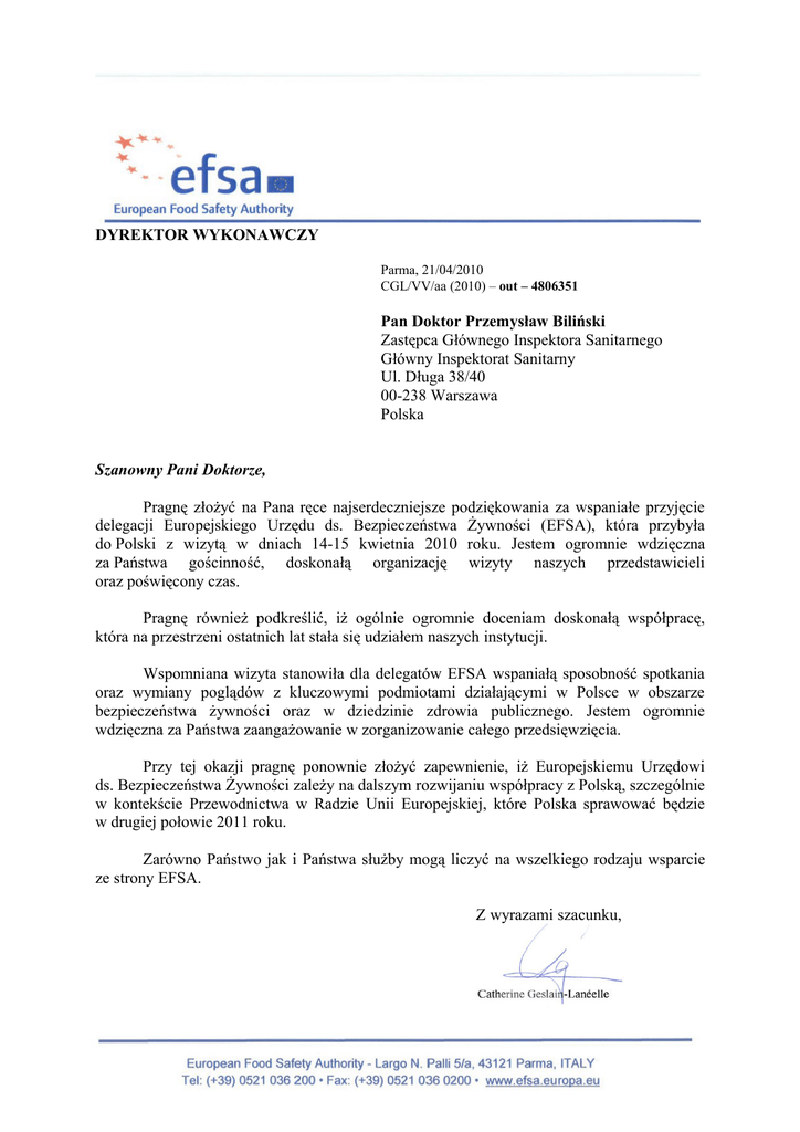 DYREKTOR WYKONAWCZY Parma, 21/04/2010 CGL/VV/aa (2010) – out – 4806351 Pan Doktor Przemysław Biliński Zastępca Głównego Inspektora Sanitarnego Główny Inspektorat Sanitarny Ul. Długa 38/40 00-238 Warszawa Polska Szanowny Pani Doktorze, Pragnę złożyć na Pana ręce najserdeczniejsze podziękowania za wspaniałe przyjęcie delegacji Europejskiego Urzędu ds. Bezpieczeństwa Żywności (EFSA), która przybyła do Polski z wizytą w dniach 14-15 kwietnia 2010 roku. Jestem ogromnie wdzięczna za Państwa gościnność, doskonałą organizację wizyty naszych przedstawicieli oraz poświęcony czas. Pragnę również podkreślić, iż ogólnie ogromnie doceniam doskonałą współpracę, która na przestrzeni ostatnich lat stała się udziałem naszych instytucji. Wspomniana wizyta stanowiła dla delegatów EFSA wspaniałą sposobność spotkania oraz wymiany poglądów z kluczowymi podmiotami działającymi w Polsce w obszarze bezpieczeństwa żywności oraz w dziedzinie zdrowia publicznego. Jestem ogromnie wdzięczna za Państwa zaangażowanie w zorganizowanie całego przedsięwzięcia. Przy tej okazji pragnę ponownie złożyć zapewnienie, iż Europejskiemu Urzędowi ds. Bezpieczeństwa Żywności zależy na dalszym rozwijaniu współpracy z Polską, szczególnie w kontekście Przewodnictwa w Radzie Unii Europejskiej, które Polska sprawować będzie w drugiej połowie 2011 roku. Zarówno Państwo jak i Państwa służby mogą liczyć na wszelkiego rodzaju wsparcie ze strony EFSA. Z wyrazami szacunku,