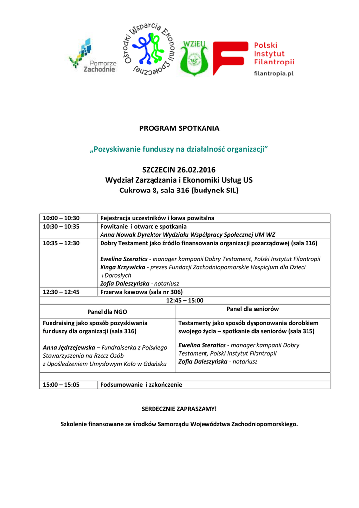 PROGRAM SPOTKANIA „Pozyskiwanie funduszy na działalność organizacji” SZCZECIN 26.02.2016 Wydział Zarządzania i Ekonomiki Usług US Cukrowa 8, sala 316 (budynek SIL) 10:00 – 10:30 10:30 – 10:35 10:35 – 12:30 12:30 – 12:45 Rejestracja uczestników i kawa powitalna Powitanie i otwarcie spotkania Anna Nowak Dyrektor Wydziału Współpracy Społecznej UM WZ Dobry Testament jako źródło finansowania organizacji pozarządowej (sala 316) Ewelina Szeratics - manager kampanii Dobry Testament, Polski Instytut Filantropii Kinga Krzywicka - prezes Fundacji Zachodniopomorskie Hospicjum dla Dzieci i Dorosłych Zofia Daleszyńska - notariusz Przerwa kawowa (sala nr 306) 12:45 – 15:00 Panel dla seniorów Panel dla NGO Fundraising jako sposób pozyskiwania funduszy dla organizacji (sala 316) Testamenty jako sposób dysponowania dorobkiem swojego życia – spotkanie dla seniorów (sala 315) Anna Jędrzejewska – Fundraiserka z Polskiego Stowarzyszenia na Rzecz Osób z Upośledzeniem Umysłowym Koło w Gdańsku Ewelina Szeratics - manager kampanii Dobry Testament, Polski Instytut Filantropii Zofia Daleszyńska - notariusz 15:00 – 15:05 Podsumowanie i zakończenie SERDECZNIE ZAPRASZAMY! Szkolenie finansowane ze środków Samorządu Województwa Zachodniopomorskiego.