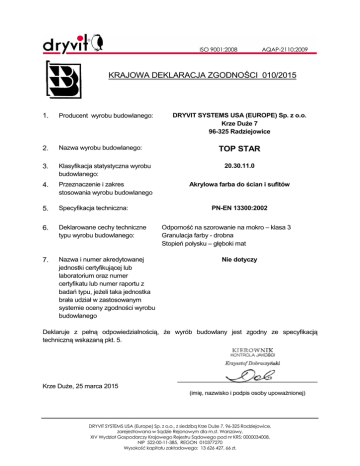 ISO 9001:2008 AQAP-2110:2009 KRAJOWA DEKLARACJA ZGODNOŚCI 010/2015 1. Producent wyrobu budowlanego: 2. Nazwa wyrobu budowlanego: 3. Klasyfikacja statystyczna wyrobu budowlanego: 20.30.11.0 4. Przeznaczenie i zakres stosowania wyrobu budowlanego Akrylowa farba do ścian i sufitów 5. Specyfikacja techniczna: 6. Deklarowane cechy techniczne typu wyrobu budowlanego: 7. Nazwa i numer akredytowanej jednostki certyfikującej lub laboratorium oraz numer certyfikatu lub numer raportu z badań typu, jeżeli taka jednostka brała udział w zastosowanym systemie oceny zgodności wyrobu budowlanego DRYVIT SYSTEMS USA (EUROPE) Sp. z o.o. Krze Duże 7 96-325 Radziejowice TOP STAR PN-EN 13300:2002 Odporność na szorowanie na mokro – klasa 3 Granulacja farby - drobna Stopień połysku – głęboki mat Nie dotyczy Deklaruje z pełną odpowiedzialnością, że wyrób budowlany jest zgodny ze specyfikacją techniczną wskazaną pkt. 5. ____________________________________ Krze Duże, 25 marca 2015 (imię, nazwisko i podpis osoby upoważnionej) DRYVIT SYSTEMS USA (Europe) Sp. z o.o., z siedzibą Krze Duże 7, 96-325 Radziejowice, zarejestrowana w Sądzie Rejonowym dla m.st. Warszawy, XIV Wydział Gospodarczy Krajowego Rejestru Sądowego pod nr KRS: 0000034008, NIP 522-00-11-385, REGON 010377270 Wysokość kapitału zakładowego: 13 626 427, 66 zł.