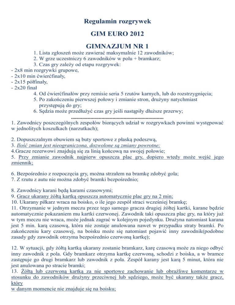 Regulamin rozgrywek GIM EURO 2012 GIMNAZJUM NR 1 1. Lista zgłoszeń może zawierać maksymalnie 12 zawodników; 2. W grze uczestniczy 6 zawodników w polu + bramkarz; 3. Czas gry zależy od etapu rozgrywek: - 2x8 min rozgrywki grupowe, - 2x10 min ćwierćfinały, - 2x15 półfinały, - 2x20 finał 4. Od ćwierćfinałów przy remisie seria 5 rzutów karnych, lub do rozstrzygnięcia; 5. Po zakończeniu pierwszej połowy i zmianie stron, drużyny natychmiast przystępują do gry; 6. Sędzia może przedłużyć czas gry jeśli nastąpiły dłuższe przerwy; ................................................................... 1. Zawodnicy poszczególnych zespołów biorących udział w rozgrywkach powinni występować w jednolitych koszulkach (narzutkach); 2. Dopuszczalnym obuwiem są buty sportowe z płaską podeszwą, 3. Ilość zmian jest nieograniczona, dozwolone są zmiany powrotne; 4.Gracze rezerwowi znajdują się za linią końcową na swojej połowie; 5. Przy zmianie zawodnik najpierw opuszcza plac gry, dopiero wtedy może wejść jego zmiennik; 6. Bezpośrednio z rozpoczęcia gry, można strzałem na bramkę zdobyć gola; 7. Z rzutu z autu nie można zdobyć bramki bezpośrednio; 8. Zawodnicy karani będą karami czasowymi; 9. Gracz ukarany żółtą kartką opuszcza automatycznie plac gry na 2 min; 10. Ukarany piłkarz wraca na boisko, o ile jego zespół straci wcześniej bramkę; 11. Otrzymanie w jednym meczu przez tego samego gracza drugiej żółtej kartki, karane będzie automatycznie pokazaniem mu kartki czerwonej. Zawodnik taki opuszcza plac gry, na który już w tym meczu nie wraca, może jednak zagrać w kolejnym pojedynku. Drużyna natomiast karana jest 5 min. karą czasową, która nie zostaje anulowana nawet w przypadku straty bramki. Po zakończeniu kary czasowej, na boisku może się natomiast pojawić inny zawodnik(podobne zasady gdy zawodnik otrzyma bezpośrednio czerwoną kartkę); 12. W sytuacji, gdy żółtą kartką ukarany zostanie bramkarz, karę czasową może za niego odbyć inny zawodnik z pola. Gdy bramkarz otrzyma kartkę czerwoną, schodzi z boiska, a w bramce zastępuje go drugi bramkarz lub zawodnik z pola. Zespół karany jest karą 5 minut, która nie jest anulowana po stracie bramki; 13. Żółtą lub czerwoną kartką za nie sportowe zachowanie lub obraźliwe komentarze w stosunku do zawodników drużyny przeciwnej lub sędziego, może być ukarany także gracz, który w danym momencie nie znajduje się na boisku; ........................................... 1. W zależności od przewinienia mogą być rzuty wolne pośrednie lub bezpośrednie i wykonujemy je na gwizdek; 2. Rzuty z autu wykonujemy nogą z linii bocznej lub z poza niej; 3. Piłka powinna stać nieruchomo; 4. Złe wykonanie rzutu z autu skutkuje przyznaniem piłki drużynie przeciwnej; 5. Rzut od bramki wykonujemy z pola bramkowego; 6. Przepisowa odległość przeciwnika od piłki podczas jej wprowadzania do gry, rzutów wolnych, autów oraz rzutów rożnych wynosi 5m. 7. Za zwycięstwo drużyna otrzymuje 3 pkt. 8. Za remis obie drużyny otrzymują 1 pkt. 9. Za przegraną drużyna otrzymuje 0 pkt. 10. Walkower karany jest przyznaniem 3 pkt. drużynie przeciwnej oraz wynikiem 3:0. 11. O końcowej klasyfikacji decydują kolejno: liczba punktów, bezpośredni pojedynek, bilans bramek strzelonych do straconych, .......................................... 1. Decyzje sędziego w czasie meczu są niepodważalne; 2. Nie obowiązuje przepis o spalonym; 3. Pozostałe przepisy jak w przepisach gry w piłkę nożną. 4.Interpretację regulaminu oraz rozstrzygnięcia spraw spornych zastrzega sobie organizator.