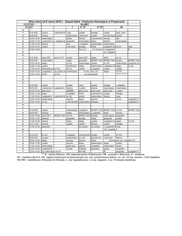 Plan lekcji od 8 marca 2010 r. Zespół Szkół - Publiczne Gimnazjum w Przytocznie GODZINY KLASY ZAJĘĆ I I II "a" II "b" III 0 1 8.15-9.00 j.ang.A biologia j.polski 2 9.05-9.50 chemia j.niemiecki B j.ang. matematyka j.niemiecki j.polski j.polski inf.chł/j.ang.dz.j.polski 3 10.00-10.45 matematyka histiria j.niemiecki/R chemia 4 10.50-11.35 j.niemiecki A j. angielski B geografia matematyka fizyka 5 11.55-12.40 historia wos j. angielski matematyka matematyka 6 13.00-13.45 j.polski j.niemiecki biologia WOS 7 13.50-14.35 historia R/w-f chł. historia godz. wych wdż matematyka j.angielski chł. inf.chł. W-f chł/indyw.zaj.dyd.wyr. 1 j.angielski P 8 wfdz. R 1/2 j. angielsk P 0 1 8.15-9.00 sport AGT j.polski sport AGT religia 2 9.05-9.50 matematyka sport A TG religia geografia SPORT TAG SPORT TAG historia WDŻ w-f dz. 3 10.00-10.45 religia w-f dz. matematyka j.polski 4 10.50-11.35 j.polski technika dz. religia matematyka j.angielski chł. religia 5 11.55-12.40 informatyka dz.w-f chł. inf. dz. j.polski j.angielski 6 13.00-13.45 j.angielski A zw j.polski art. matematyka 42 gr B w-f dz./ tech. chł. 7 13.50-14.35 inf chł /w-f dz zw matematyka 1 8.15-9.00 j.polski j.polski j.ang. j.polski biologia 2 9.05-9.50 j.niemiecki A j.angielski B historia j. polski historia matematyka matematyka 3 10.00-10.45 godz-wych sztuka godz.wych. godz.wych. godz.wych. 4 10.50-11.35 fizyka j.angielski WOS j.niemiecki R j.polski biologia 5 11.55-12.40 j.angielski A j.niemiecki B w-f dz. sztuka matematyka historia j.ang. 6 13.00-13.45 matematyka chemia fizyka chemia w-f dz. 7 13.50-14.35 w-f dz. j.niemiecki/R matematyka plastyka 1 8.15-9.00 j.polski matematyka j.angielski 2 9.05-9.50 biologia religia 3 10.00-10.45 sport GAT 4 10.50-11.35 plastyka geografia 5 11.55-12.40 historia 6 13.0-13.45 chemia 7 13.50-14.35 geografia w-f chł. j.polski religia SPORT TAG matematyka j.angielski dz. w-f dz. j.polski w-f chł. 4godz.w-f(cała kl.)(*) 8 9 0 j. angielski j. polski j.angielski P j.angielski P 8 0 SPORT TAG SPORT TAG w-f chł. matematyka j. angielski fizyka SPORT GAT biologia matematyka geografia biologia religia geografia fizyka religia j.polski j.angielski dz./ religia j.polski j.polski historia j.polski zw j.polski zw j.polski 1 j.angielski P j.ang. SPORT GAT w-f chł. 8 SPORT TAG chemia j.polski w-f chł biologia 1/2 j. angielsk P 0 1 8.15-9.00 w-f chł j.angielski. 2 9.05-9.50 muzyka matematyka w-f chł./ j.niemiecki/R j.polski technika dz. j.polski w-f chł. j.niemiecki 3 10.00-10.45 religia biologia historia fizyka historia 4 10.50-11.35 j.polski chemia fizyka matematyka religia 5 11.55-12.40 matematyka godz.wych. j.polski j.angielski matematyka sztuka 6 13.00-13.45 j.angielski B j.polski chemia geografia sztuka informatyka dz./j. angielski chł j.polski j.angielski w-f dz. R geografia j.angielski P 1/2 B - odwóz Blizocin, SW odwóz/przywóz Walentynów, SB - przywóz z Blizocina, S - świetlica, S0 - świetlica dla kl.0, KK- zajęcia korekcyjno-kompensacyjne,zw- zaj. wyrównawcze płatne, zw. art. 43-zaj. wyrówn. z KN niepłatne RO,RM - rewalidacja z Marysią lub Oktawią, L- zaj. logopedyczne, LJ-zaj. logoped. J-ny, Td-terapia-dysleksja 7 13.50-14.35 zw matematyka art.42