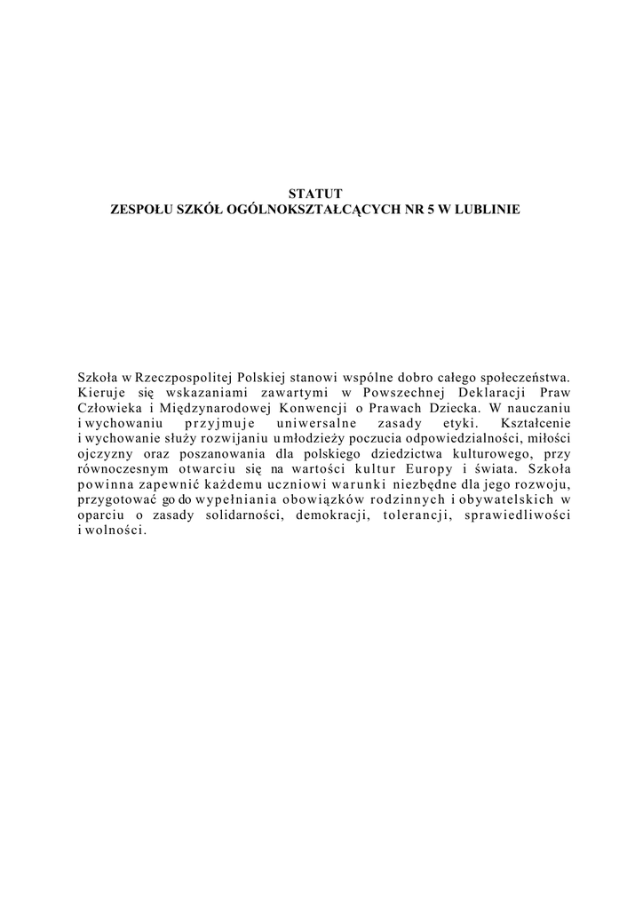STATUT ZESPOŁU SZKÓŁ OGÓLNOKSZTAŁCĄCYCH NR 5 W LUBLINIE Szkoła w Rzeczpospolitej Polskiej stanowi wspólne dobro całego społeczeństwa. Kieruje się wskazaniami zawartymi w Powszechnej Deklaracji Praw Człowieka i Międzynarodowej Konwencji o Prawach Dziecka. W nauczaniu i wychowaniu przyjmuje u ni w er s al n e zas ad y etyki. Kształcenie i wychowanie służy rozwijaniu u młodzieży poczucia odpowiedzialności, miłości ojczyzny oraz poszanowania dla polskiego dziedzictwa kulturowego, przy równoczesnym otwarciu się na wartości k u l t u r E u ro p y i świata. Szkoła p o w i n n a zapewn ić k aż d e m u uczn iow i w a r u n k i niezbędne dla jego rozwoju, przygotować go do w y p e ł n i a n i a o bo w i ązk ó w r o d z i n n y c h i ob yw at el ski ch w oparciu o zasady solidarności, demokracji, t o l er an cj i , sprawiedliwości i wolności. Spis treści Rozdział 1 POSTANOWIENIA OGÓLNE..................................................................................................3 Rozdział 2 CELE I ZADANIA ZESPOŁU SZKÓŁ.....................................................................................3 Rozdział 3 ORGANY ZESPOŁU SZKÓŁ...................................................................................................6 Rozdział 4 ORAGNIZACJA ZESPOŁU SZKÓŁ......................................................................................10 Rozdział 5 NAUCZYCIELE I INNI PRACOWNICY ZESPOŁU SZKÓŁ...............................................14 Rozdział 6 PRAWA I OBOWIĄZKI UCZNIA..........................................................................................22 SZKOLNY RZECZNIK PRAW UCZNIA...............................................................................28 Rozdział 7 WSPÓŁPRACA SZKOŁY Z RODZICAMI (PRAWNYMI OPIEKUNAMI) UCZNIÓW....28 Rozdział 8 PRZYJMOWANIE UCZNIÓW DO SZKOŁY........................................................................30 Rozdział 9 SYSTEM OCENIANIA WEWNĘTRZNEGO.........................................................................31 TRYB KLASYFIKOWANIA I PROMOWANIA...................................................................32 TRYB USTALANIA OCENY ZACHOWANIA.....................................................................40 Rozdział 10 POSTANOWIENIA KOŃCOWE............................................................................................46 Rozdział 1 POSTANOWIENIA OGÓLNE §1 1. Zespół Szkół Ogólnokształcących nr 5, zwany dalej zespołem szkół, jest publicznym zespołem szkół dla młodzieży, prowadzącym działalność na podstawie aktu założycielskiego Kuratora Oświaty w Lublinie nr WOK-014-3-EK/93 z dnia 19 marca 1993 r. §2 1. Zespół szkół ma swoją siedzibę w Lublinie, przy ulicy Rzeckiego 10. §3 1. Organem prowadzącym zespół szkół jest od dnia 1 stycznia 1994 roku Miasto Lublin. §4 1. Organem sprawującym nadzór pedagogiczny jest Lubelski Kurator Oświaty. §5 1. W skład zespołu szkół wchodzą: 1) Szkoła Podstawowa nr 22 im. Bolesława Prusa, zwana dalej szkołą podstawową, która jest sześcioletnią szkołą publiczną, bezpłatną, obowiązkową dla uczniów objętych obowiązkiem szkolnym. 2) XIX Liceum Ogólnokształcące im. Marii i Jerzego Kuncewiczów, zwane dalej liceum ogólnokształcącym, które jest trzyletnią szkołą ponadgimnazjalną dla młodzieży. §6 1. Pełne nazwy szkół, wchodzących w skład zespołu szkół są następujące: 1) Zespół Szkół Ogólnokształcących nr 5 w Lublinie Szkoła Podstawowa nr 22 im. Bolesława Prusa; 2) Zespół Szkół Ogólnokształcących nr 5 w Lublinie XIX Liceum Ogólnokształcące im. Marii i Jerzego Kuncewiczów. §7 1. Zespół szkół używa pieczęci urzędowej zgodnie z odrębnymi przepisami. Jest to pieczęć metalowa, okrągła z godłem państwowym w środku. W otoku znajduje się napis: Zespół Szkół Ogólnokształcących nr 5 w Lublinie. 2. Szkoła Podstawowa Nr 22 i XIX Liceum Ogólnokształcące używają pieczęci urzędowych. Pieczęcie szkół zawierają nazwę szkoły. Rozdział 2 CELE I ZADANIA ZESPOŁU SZKÓŁ §8 1. Szkoły, wchodzące w skład zespołu szkół, realizują cele i zadania określone w ustawie o systemie oświaty oraz w przepisach wydanych na jej podstawie, z uwzględnieniem własnych programów (wychowawczego i profilaktyki), dostosowane do potrzeb rozwojowych uczniów i potrzeb środowiska lokalnego i uwzględniające optymalne warunki rozwoju ucznia, zasady bezpieczeństwa oraz zasady promocji i ochrony zdrowia. §9 1. Szkoła Podstawowa nr 22 w szczególności: 1) umożliwia zdobycie wiedzy i umiejętności niezbędnych do uzyskania świadectwa ukończenia szkoły, 2) przygotowuje absolwentów do nauki w gimnazjum, 3) sprawuje opiekę nad uczniami odpowiednio do ich potrzeb oraz możliwości szkoły, 4) zapewnia opiekę nad uczniami z uwzględnieniem obowiązujących w szkołach przepisów bezpieczeństwa i higieny pracy, 5) w miarę możliwości finansowych organizuje pomoc materialną uczniom znajdującym się w szczególnie trudnej sytuacji, 6) organizuje zajęcia dodatkowe dla uczniów szkoły podstawowej z uwzględnieniem w szczególności ich potrzeb rozwojowych. § 10 1. XIX Liceum Ogólnokształcące w szczególności: 1) umożliwia zdobycie wiedzy i umiejętności niezbędnych do uzyskania świadectwa dojrzałości, 2) umożliwia wszechstronny rozwój ucznia, 3) rozbudza motywację do dalszej edukacji i przygotowuje do podejmowania decyzji dotyczących dalszego kształcenia, 4) przygotowuje do aktywnego udziału w życiu społecznym, 5) rozwija samodzielność, przedsiębiorczość i poczucie odpowiedzialności, 6) przygotowuje uczniów do współzawodnictwa na rynku pracy, 7) przygotowuje do życia w rodzinie, 8) kształtuje postawę tolerancji, wrażliwości na potrzeby innych i przestrzeganie zasad współżycia społecznego, 9) sprawuje opiekę nad uczniami stosownie do ich potrzeb oraz moż