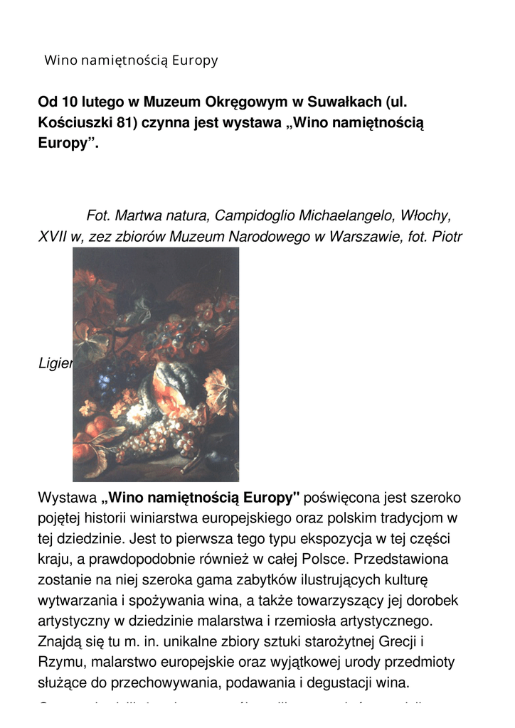 Wino namiętnością Europy Od 10 lutego w Muzeum Okręgowym w Suwałkach (ul. Kościuszki 81) czynna jest wystawa „Wino namiętnością Europy”. Fot. Martwa natura, Campidoglio Michaelangelo, Włochy, XVII w, zez zbiorów Muzeum Narodowego w Warszawie, fot. Piotr Ligier Wystawa „Wino namiętnością Europy" poświęcona jest szeroko pojętej historii winiarstwa europejskiego oraz polskim tradycjom w tej dziedzinie. Jest to pierwsza tego typu ekspozycja w tej części kraju, a prawdopodobnie również w całej Polsce. Przedstawiona zostanie na niej szeroka gama zabytków ilustrujących kulturę wytwarzania i spożywania wina, a także towarzyszący jej dorobek artystyczny w dziedzinie malarstwa i rzemiosła artystycznego. Znajdą się tu m. in. unikalne zbiory sztuki starożytnej Grecji i Rzymu, malarstwo europejskie oraz wyjątkowej urody przedmioty służące do przechowywania, podawania i degustacji wina. Grecy twierdzili, że wino to napój cywilizowany, który zrodził Grecy twierdzili, że wino to napój cywilizowany, który zrodził filozofię. Pasteur pisał: "Więcej jest filozofii w winie niż we wszystkich książkach". Pamiętać też należy, że z Dionizosem i winem wiążą się narodziny sztuki teatralnej. Wino łączy się niezmiennie z duchowością. Wszystkie tradycyjne wierzenia Starego Świata widziały w nim symbol i narzędzie wtajemniczenia. W średniowieczu cierpliwi i skrupulatni zakonnicy stali się prawdziwymi panami winnic i oświeconymi producentami wina, szerzącymi Ewangelię w Winnicy Pana. Wino stało się namiętnością Europy, łącząc nas przy jednym stole wspólnym cywilizacyjnym dziedzictwem. Historia winiarstwa staje się, więc znakomitym tematem na kanwie, którego przedstawić można wartości duchowe i materialne europejskiej kultury. Podczas trwania wystawy organizowane są spotkania poświęcone historii europejskiego winiarstwa oraz pokazy związane z technologia wytwarzania wina, przygotowane przez przedstawicieli Stowarzyszenia Winiarzy i Miodosytników Polskich. Przygotowana ekspozycja umożliwi poznanie dorobku europejskiego winiarstwa, stanie się również formą edukacji lokalnej społeczności. Prezentacja jednego z europejskich aspektów kulturowych, mający wymiar ponadnarodowy i ponadpaństwowy, pokaże, że już w starożytności i średniowieczu istniało coś, co na poziomie wspólnej kultury scalało wiele europejskich krajów. Wystawa powstała ze zbiorów: Fundacji XX Czartoryskich przy Muzeum Narodowym w Krakowie, Muzeum Narodowego w Gdańsku, Muzeum Narodowego w Warszawie, Muzeum Okręgowego w Suwałkach, Muzeum Okręgowego w Toruniu, Muzeum Okręgowego w Tarnowie, Muzeum Południowego Podlasia w Białej Podlaskiej, Muzeum Zamojskiego w Zamościu, Muzeum Ziemi Lubuskiej w Zielonej Górze, Muzeum gdzie istnieje jedyny w Polsce Dział Winiarski, Muzeum Podlaskiego w Białymstoku oraz kolekcji prywatnych. Autor tekstów i scenariusza wystawy: Krystyna Mazuruk, komisarze Autor tekstów i scenariusza wystawy: Krystyna Mazuruk, komisarze wystawy: Krystyna Mazuruk i Jerzy Siemaszko, aranżacja: Krystyna Mazuruk i Renata Maskowicz. Organizatorzy: Muzeum Okręgowe w Suwałkach i Muzeum Podlaskie w Białymstoku.