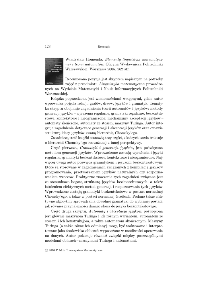 128 Recenzje Władysław Homenda, Elementy lingwistyki matematycznej i teorii automatów, Oficyna Wydawnicza Politechniki Warszawskiej, Warszawa 2005, 262 str. Recenzowana pozycja jest skryptem napisanym na potrzeby zajęć z przedmiotu Lingwistyka matematyczna prowadzonych na Wydziale Matematyki i Nauk Informacyjnych Politechniki Warszawskiej. Książka poprzedzona jest wiadomościami wstępnymi, gdzie autor wprowadza pojęcia relacji, grafów, drzew, języków i gramatyk. Tematyka skryptu obejmuje zagadnienia teorii automatów i języków: metody generacji języków – wyrażenia regularne, gramatyki regularne, bezkontekstowe, kontekstowe i nieograniczone; mechanizmy akceptacji języków – automaty skończone, automaty ze stosem, maszyny Turinga. Autor integruje zagadnienia dotyczące generacji i akceptacji języków oraz omawia strukturę klasy języków zwaną hierarchią Chomsky’ego. Zasadniczą treść książki stanowią trzy części, z których każda traktuje o hierarchii Chomsky’ego rozważanej z innej perspektywy. Część pierwsza, Gramatyki i generacja języków, jest poświęcona metodom generacji języków. Wprowadzone zostają wyrażenia i języki regularne, gramatyki bezkontekstowe, kontekstowe i nieograniczone. Najwięcej uwagi autor poświęca gramatykom i językom bezkontekstowym, które są stosowane w zagadnieniach związanych z kompilacją języków programowania, przetwarzaniem języków naturalnych czy rozpoznawaniem wzorców. Praktyczne znaczenie tych zagadnień związane jest ze stosunkowo bogatą strukturą języków bezkontekstowych, a także istnieniem efektywnych metod generacji i rozpoznawania tych języków. Wprowadzone zostają gramatyki bezkontekstowe w postaci normalnej Chomsky’ego, a także w postaci normalnej Greibach. Podano także efektywne algorytmy sprowadzania dowolnej gramatyki do wybranej postaci, jak również przynależności danego słowa do języka bezkontekstowego. Część druga skryptu, Automaty i akceptacja języków, poświęcona jest głównie maszynom Turinga i ich różnym wariantom, automatom ze stosem i ich konstrukcjom, a także automatom skończonym. Maszyny Turinga (a także różne ich odmiany) mogą być traktowane i interpretowane jako środowiska obliczeń wyposażone w możliwości operowania na danych. Autor pokazuje również związki między poszczególnymi modelami obliczeń – maszynami Turinga i automatami. c 2010 Polskie Towarzystwo Matematyczne Recenzje 129 Część trzecia, Języki, gramatyki, automaty, łączy zagadnienia z dwóch wcześniejszych części. Omawia właściwości domknięcia ze względu na różne operacje klas języków regularnych, bezkontekstowych rekurencyjnych i rekurencyjnie przeliczalnych, kontekstowych. Całość zamyka rozdział poświęcony hierarchii Chomsky’ego wraz z dowodami ścisłego zawierania się klas języków. Problematyka poruszana w książce należy do kanonu informatyki teoretycznej. Przy tworzeniu skryptu autor wybrał podstawowe tematy i problemy uznawane za elementarz opisywanej przez niego dziedziny. Książka ma charakter praktyczny – pojęcia, definicje i twierdzenia są bogato ilustrowane przykładami. Brakuje może trochę głębszej refleksji i uzasadnienia wagi niektórych problemów. Stosunkowo marginalnie zostały potraktowane problemy nierozstrzygalności i złożoności obliczeniowej – autor uczciwie jednak odsyła zainteresowanych do monografii i opracowań na wyżej wymienione tematy. Niewątpliwym atutem książki jest duża liczba przykładów i zadań, z których większość posiada szczegółowe i kompletne rozwiązania. Biorąc pod uwagę krąg odbiorców, do których książka jest adresowana – studentów kierunków informatycznych i technicznych – można stwierdzić, że spełnia ona swoje zadanie. Aleksandra Kiślak-Malinowska (Olsztyn) Franciszek Prus-Wiśniowski, Szeregi rzeczywiste, Wydawnictwo Naukowe Uniwersytetu Szczecińskiego, Szczecin 2005, 216 str. Książka jest rozszerzoną wersją notatek do wykładów, które Autor prowadził – jako zajęcia do wyboru – dla studentów starszych lat matematyki Uniwersytetu Szczecińskiego. Motywacją do wybrania tak klasycznych zagadnień jako tematu wykładów fakultatywnych były (relatywne) trudności rachunkowe (dla studentów pierwszego roku), jakie pojawiają się w teorii szeregów już na wstępie, a także czysto egzystencjalny charakter większości kryteriów zbieżności szeregów. Autor uznał zatem, że warto powrócić do nietrywialnych twierdzeń i przykładów, aby studiujący mieli okazję zapoznać się z klasyką (nierzadko zapomnianą) teorii szeregów. c 2010 Polskie Towarzystwo Matematyczne