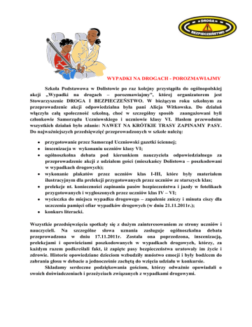 WYPADKI NA DROGACH - POROZMAWIAJMY Szkoła Podstawowa w Dolistowie po raz kolejny przystąpiła do ogólnopolskiej akcji „Wypadki na drogach – porozmawiajmy”, której organizatorem jest Stowarzyszenie DROGA I BEZPIECZEŃSTWO. W bieżącym roku szkolnym za przeprowadzenie akcji odpowiedzialna była pani Alicja Witkowska. Do działań włączyła całą społeczność szkolną, choć w szczególny sposób zaangażowani byli członkowie Samorządu Uczniowskiego i uczniowie klasy VI. Hasłem przewodnim wszystkich działań było zdanie: NAWET NA KRÓTKIE TRASY ZAPINAMY PASY. Do najważniejszych przedsięwzięć przeprowadzonych w szkole należą: przygotowanie przez Samorząd Uczniowski gazetki ściennej; inscenizacja w wykonaniu uczniów klasy VI; ogólnoszkolna debata pod kierunkiem nauczyciela odpowiedzialnego za przeprowadzenie akcji z udziałem gości (mieszkańcy Dolistowa – poszkodowani w wypadkach drogowych); wykonanie plakatów przez uczniów klas I-III, które były materiałem ilustracyjnym dla prelekcji przygotowanych przez uczniów ze starszych klas; prelekcje nt. konieczności zapinania pasów bezpieczeństwa i jazdy w fotelikach przygotowanych i wygłoszonych przez uczniów klas IV – VI; wycieczka do miejsca wypadku drogowego – zapalenie zniczy i minuta ciszy dla uczczenia pamięci ofiar wypadków drogowych (w dniu 21.11.2011r.); konkurs literacki. Wszystkie przedsięwzięcia spotkały się z dużym zainteresowaniem ze strony uczniów i nauczycieli. Na szczególne słowa uznania zasługuje ogólnoszkolna debata przeprowadzona w dniu 17.11.2011r. Została ona poprzedzona, inscenizacją, prelekcjami i opowieściami poszkodowanych w wypadkach drogowych, którzy, za każdym razem podkreślali fakt, iż zapięte pasy bezpieczeństwa uratowały im życie i zdrowie. Historie opowiedziane dzieciom wzbudziły mnóstwo emocji i były bodźcem do zabrania głosu w debacie a jednocześnie zachętą do wzięcia udziału w konkursie. Składamy serdeczne podziękowania gościom, którzy odważnie opowiadali o swoich doświadczeniach i przeżyciach związanych z wypadkami drogowymi.