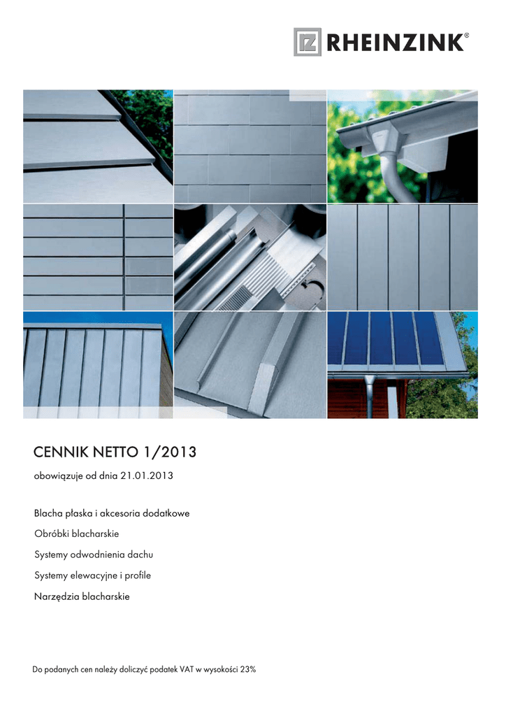 CENNIK NETTO 1/2013 Obróbki blacharskie Systemy odwodnienia dachu Systemy elewacyjne i profile 21.01.2013 LINIE PRODUKTOWE* PATINA PROTECT COLOR INTERIEUR PATINA LINE PROTECT LINE COLOR LINE INTERIEUR LINE OPIS żywy materiał nieograniczone możliwości trwała estetyka podkreślenie detali wnętrz RODZAJE POWIERZCHNI prePATINA walzblank prePATINA blaugrau prePATINA schiefergrau 1 Spodnia strona lakierowana na życzenie PROTECT blaugrau 1 PROTECT schiefergrau 1 2 Spodnia stronaĕćć COLOR perlgold 2 3 COLOR blau 2 3 COLOR ziegelrot 2 3 COLOR moosgrün 2 3 COLOR nussbraun 2 3 2 2 2 Spodnia stronaĕćć 3 Inne kolory na zapytanie -# $)5$)&¢+/$)¢+-*/ /¢*'*- ¢$)/ -$ 0-ćDŽ -# $)5$)&"#Ô&" INTERIEUR 2 blaugrau 2 INTERIEUR schiefergrau 2 Spodnia strona ĕćć PATINA PROTECT COLOR INTERIEUR WAŻNE INFORMACJE Norma PN-EN 988 PN-EN 988 PN-EN 988 PN-EN 988 Standard QUALITY ZINC TÜV Rheinland QUALITY ZINC TÜV Rheinland QUALITY ZINC TÜV Rheinland QUALITY ZINC TÜV Rheinland Grubość 0,6-x,00 mm RHEINZINK-prePATINA walzblank 0,70-1,0 mm RHEINZINK-PROTECT blaugrau, -# $)5$)&¢PROTECT 0,70-1,0 mm RHEINZINK-COLOR 0,70-1,0 mm RHEINZINK-INTERIEUR blaugrau, -# $)5$)&¢$)/ -$ 0 1000 mm RHEINZINK-prePATINA walzblank 1000 mm RHEINZINK-PROTECT blaugrau 1000 mm RHEINZINK-COLOR 1000 mm RHEINZINK-INTERIEUR blaugrau RHEINZINK-prePATINA blaugrau 700 mm RHEINZINK-PROTECT schiefergrau 0,65-1,0 mm RHEINZINK-prePATINA blaugrau 0,~-1,0 mm RHEINZINK-prePATINA schiefergrau Szerokość 700 mm RHEINZINK-prePATINA schiefergrau 700 mm RHEINZINK-INTERIEUR schiefergrau System rynnowy TAK - ponad 500 elementów w różnych rodzajach powierzchni Brak Brak Brak System pokrycia dachowego / System TAK Na zapytanie Na zapytanie Na zapytanie Podstawowa charakterystyka Na wszystkich produktach linii PATINA LINE z czasem tworzy się naturalna warstwa ochronna powierzchni: patyna. W przypadku powierzchni RHEINZINK-prePATINA wygląd patyny jest określony tylko przez wpływy środowiska. Innowacyjny proces wstępnego patynowania RHEINZINK, jako wynalazcy tej metody wyprzedza naturalną zmianę barwy powierzchni występującą przy naturalnym patynowaniu. Uzyskuje się w ten sposób szaroniebieską powierzchnie RHEINZINKprePATINA blaugrau oraz RHEINZINK-prePATINA schiefergrau o odcieniu grafitowym. Kolorystyka ta nie jest wynikiem powstania żadnej powłoki i zachowuje wszystkie korzystne właściwości patyny cynku. Przezroczyste zabezpieczenie powierzchni PROTECT LINE zapewnia trwałą ochronę patyny przy jej użytkowaniu. Kolorystyka oraz faktura patyny pozostaje niezmieniona, dzięki czemu jest możliwe zachowanie estetyki w szczególnych miejscach zastosowania, np. dolnej części elewacji lub w ekstremalnych warunkach klimatycznych, np. strefie tropikalnej. Po materiał RHEINZINK-PROTECT blaugrau o odcieniu szaroniebieskiej oraz RHEINZINK-PROTECT schiefergrau o odcieniu grafitowej patyny sięga się zawsze wtedy, gdy trzeba zapobiec niesprzyjającemu oddziaływaniu warunków otoczenia jako zastosowanie trwałego i estetycznego rozwiązania na bazie tytan-cynku. Powierzchnia RHEINZINK dostępna w prawie nieograniczonej palecie kolorów jako nowa linia powierzchni COLOR LINE. Korzystne właściwości tytan-cynku są całkowicie zachowane pod kolorową powłoką. Architekci, projektanci, wykonawcy i inwestorzy mają teraz nieograniczone możliwości wyboru kolorystyki – na podstawie katalogu kolorów albo całkowicie indywidualnie, na zamówienie. W każdym wypadku będzie to bezpieczny wybór zawsze 100% jakości RHEINZINK. Dzięki przezroczystej ochronie materiał nie tylko pozostaje trwale zabezpieczony przed czynnikami wynikającymi z użytkowania, ale i zachowuje niezmienioną fakturę oraz estetykę patyny RHEINZINK. Płaszczyzny wykonane z użyciem szaroniebieskiej blachy RHEINZINK -INTERIEUR blaurau i RHEINZINK-INTERIEUR schiefergrau, jako grafitowej jej odmiany, stwarzają unikatowe akcenty we wnętrzach budynków oraz we wzornictwie i przemyśle meblarskim. Zalety Q Naturalne patynowanie Q 25 lat doświadczeń RHEINZINK we wstępnym patynowaniu tytan-cynku Q Sprawdzone zastosowanie na dachach, fasadach, odwodnieniach oraz w detalach architektonicznych Q Odporność w różnych strefach klimatycznych Q Dostępność "od ręki" dzięki krótkim terminom dostaw Q Przezroczyste zabezpieczenie powierzchni patyny Q Odporność w różnych strefach klimatycznych Q Zachowanie charakterystycznej faktury patyny i jej kolorystyki przez ochronę powierzchni Q Stosowanie na dachach, elewacjach oraz przy wykonywaniu detali architektonicznych Q Szeroki asortyment obróbek wykonywanych pod system Q Sprawdzona technologia zastosowania – możliwość profilowania i gięcia Q Nowe właściwości powierzchni – znana jakość powłok PVDF Q Sprawdzona jakość materiału RHEINZINK Q Duży wybór kolorów na zamówienie Q Stosowanie na dachach, elewacjach oraz przy wykonywaniu detali architektonicznych Q Odporność w różnych strefach klimatycznych Q Wytrzymałość przy profilowaniu i zaginaniu Q Zastosowanie w podkreślaniu detali wnętrz i wzornictwie mebli Q Trwałe zabezpieczenie powierzchni dzięki transparentnej ochronie Q Zachowanie niezmienionej faktury oraz estetyki patyny RHEINZINK Q Powierzchnie poddane wstępnemu patynowaniu są dostępne w odcieniu szaroniebieskim lub grafitowym Q Estetyka i ponadczasowe piękno Blacha w arkuszach Blacha w rolkach Blacha perforowana AERO RHEINZINK Klick ENKE MultiProtect i Enkolit Mata strukturalna Klej do blachy Cyna lutownicza Blokada lodu 3 C ENNIK NETTO 1 /2013 z dnia 21.01.2013 Arkusz RHEINZINK, prePATINA walzblank obraz mm mm nr art. 0,60 1000 150 5018 prePATINA blaugrau prePATINA schiefergrau nr art. 17,21 nr art. 74,35 - - - 21,86 102,30 - - - 21,86 110,17 - - - - - - 0,65 1000 150 6014 17,21 80,54 450 6014 0,70 1000 150 7011 17,21 86,74 450 7011 0,80 1000 150 9013 17,21 99,13 450 9013 21,86 125,91 - - - 1,00 1000 151 3012 17,21 123,91 451 3012 21,86 157,39 - - - 0,70 700 