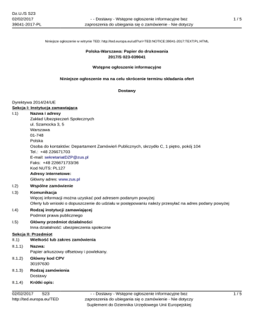 Dz.U./S S23 02/02/2017 39041-2017-PL - - Dostawy - Wstępne ogłoszenie informacyjne bez zaproszenia do ubiegania się o zamówienie - Nie dotyczy 1/5 Niniejsze ogłoszenie w witrynie TED: http://ted.europa.eu/udl?uri=TED:NOTICE:39041-2017:TEXT:PL:HTML Polska-Warszawa: Papier do drukowania 2017/S 023-039041 Wstępne ogłoszenie informacyjne Niniejsze ogłoszenie ma na celu skrócenie terminu składania ofert Dostawy Dyrektywa 2014/24/UE Sekcja I: Instytucja zamawiająca I.1) Nazwa i adresy Zakład Ubezpieczeń Społecznych ul. Szamocka 3, 5 Warszawa 01-748 Polska Osoba do kontaktów: Departament Zamówień Publicznych, skrzydło C, 1 piętro, pokój 104 Tel.: +48 226671703 E-mail: [email protected] Faks: +48 226671733/36 Kod NUTS: PL127 Adresy internetowe: Główny adres: www.zus.pl I.2) Wspólne zamówienie I.3) Komunikacja Więcej informacji można uzyskać pod adresem podanym powyżej Oferty lub wnioski o dopuszczenie do udziału w postępowaniu należy przesyłać na adres podany powyżej I.4) Rodzaj instytucji zamawiającej Podmiot prawa publicznego I.5) Główny przedmiot działalności Inna działalność: ubezpieczenia społeczne Sekcja II: Przedmiot II.1) Wielkość lub zakres zamówienia II.1.1) Nazwa: Papier arkuszowy offsetowy i powlekany. II.1.2) Główny kod CPV 30197630 II.1.3) Rodzaj zamówienia Dostawy II.1.4) Krótki opis: 02/02/2017 S23 http://ted.europa.eu/TED - - Dostawy - Wstępne ogłoszenie informacyjne bez zaproszenia do ubiegania się o zamówienie - Nie dotyczy Suplement do Dziennika Urzędowego Unii Europejskiej 1/5 Dz.U./S S23 02/02/2017 39041-2017-PL - - Dostawy - Wstępne ogłoszenie informacyjne bez zaproszenia do ubiegania się o zamówienie - Nie dotyczy 2/5 Papier arkuszowy offsetowy i powlekany Papier offsetowy o gr. 70 Papier offsetowy o gr. 80 Papier offsetowy o gr. 100 Papier powlekany o gr.115 Papier powlekany o gr.250. II.1.5) Szacunkowa całkowita wartość Wartość bez VAT: 693 264.26 EUR II.1.6) Informacje o częściach To zamówienie podzielone jest na części: tak Oferty można składać w odniesieniu do wszystkich części II.2) Opis II.2.1) Nazwa: Papier offsetowy o gr. 70 Część nr: 1 II.2.2) Dodatkowy kod lub kody CPV 30197630 II.2.3) Miejsce świadczenia usług Kod NUTS: PL II.2.4) Opis zamówienia: Papier offsetowy o gr. 70. II.2.5) Kryteria udzielenia zamówienia II.2.6) Szacunkowa wartość Wartość bez VAT: 233 684.58 EUR II.2.7) Okres obowiązywania zamówienia, umowy ramowej lub dynamicznego systemu zakupów II.2.10) Informacje o ofertach wariantowych II.2.11) Informacje o opcjach II.2.13) Informacje o funduszach Unii Europejskiej Zamówienie dotyczy projektu/programu finansowanego ze środków Unii Europejskiej: nie II.2.14) Informacje dodatkowe II.2) Opis II.2.1) Nazwa: Papier offsetowy o gr. 80 Część nr: 2 II.2.2) Dodatkowy kod lub kody CPV 30197630 II.2.3) Miejsce świadczenia usług Kod NUTS: PL II.2.4) Opis zamówienia: Papier offsetowy o gr. 80. II.2.5) Kryteria udzielenia zamówienia 02/02/2017 S23 http://ted.europa.eu/TED - - Dostawy - Wstępne ogłoszenie informacyjne bez zaproszenia do ubiegania się o zamówienie - Nie dotyczy Suplement do Dziennika Urzędowego Unii Europejskiej 2/5 Dz.U./S S23 02/02/2017 39041-2017-PL - - Dostawy - Wstępne ogłoszenie informacyjne bez zaproszenia do ubiegania się o zamówienie - Nie dotyczy II.2.6) Szacunkowa wartość Wartość bez VAT: 60 368.52 EUR II.2.7) Okres obowiązywania zamówienia, umowy ramowej lub dynamicznego systemu zakupów II.2.10) Informacje o ofertach wariantowych II.2.11) Informacje o opcjach II.2.13) Informacje o funduszach Unii Europejskiej Zamówienie dotyczy projektu/programu finansowanego ze środków Unii Europejskiej: nie II.2.14) Informacje dodatkowe II.2) Opis II.2.1) Nazwa: Papier offsetowy o gr. 100 Część nr: 3 II.2.2) Dodatkowy kod lub kody CPV 30197630 II.2.3) Miejsce świadczenia usług Kod NUTS: PL II.2.4) Opis zamówienia: Papier offsetowy o gr. 100. II.2.5) Kryteria udzielenia zamówienia II.2.6) Szacunkowa wartość Wartość bez VAT: 233 684.58 EUR II.2.7) Okres obowiązywania zamówienia, umowy ramowej lub dynamicznego systemu zakupów II.2.10) Informacje o ofertach wariantowych II.2.11) Informacje o opcjach II.2.13) Informacje o funduszach Unii Europejskiej Zamówienie dotyczy projektu/programu finansowanego ze środków Unii Europejskiej: nie II.2.14) Informacje dodatkowe II.2) Opis II.2.1) Nazwa: Papier powlekany o gr. 115 Część nr: 4 II.2.2) Dodatkowy kod lub kody CPV 30197630 II.2.3) Miejsce świadczenia usług Kod NUTS: PL II.2.4) Opis zamówienia: Papier powlekany o gr. 115. II.2.5) Kryteria udzielenia zamówienia II.2.6) Szacunkowa wartość Wartość bez VAT: 116 842.29 EUR 02/02/2017 S23 http://ted.europa.eu/TED - - Dostawy - Wstępne ogłoszenie informacyjne bez zaproszenia do ubiegania się o zamówienie - Nie dotyczy Suplement do Dziennika Urzędowego Unii Europejskiej 3/5 3/5 Dz.U./S S23 02/02/2017 39041-2017-PL - - Dostawy - Wstępne ogłoszenie informacyjne bez zaproszenia do ubiegania się o zamówienie - Nie dotyczy II.2.7) Okres obowiązywania zamówienia, umowy ramowej lub dynamicznego systemu zakupów II.2.10) Informacje o ofertach wariantowych II.2.11) Informacje o opcjach II.2.13) Informacje o funduszach Unii Europejskiej Zamówienie dotyczy projektu/programu finansowanego ze środków Unii Europejskiej: nie II.2.14) Informacje dodatkowe II.2) Opis II.2.1) Nazwa: Papier powlekany o gr. 250 Część nr: 5 II.2.2) Dodatkowy kod lub kody CPV 30197630 II.2.3) Miejsce świadczenia usług Kod NUTS: PL II.2.4) Opis zamówienia: Papier powlekany o gr. 250. II.2.5) Kryteria udzielenia zamówienia II.2.6) Szacunkowa wartość Wartość bez VAT: 48 684.29 EUR II.2.7) Okres obowiązywania zamówienia, umowy ramowej lub dynamicznego systemu zakupów II.2.10) Informacje o ofertach wariantowych II.2.11) Informacje o opcjach II.2.13) Informacje o funduszach Unii Europejskiej Zamówienie dotyczy projektu/programu finansowane