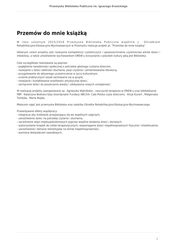 Przemyska Biblioteka Publiczna im. Ignacego Krasickiego Przemów do mnie książką W roku szkolnym 2015/2016 Przemyska Biblioteka Publiczna wspólnie z Ośrodkiem Rehabilitacyjno-Edukacyjno-Wychowawczym w Przemyślu realizuje projekt pt. "Przemów do mnie książką". Głównym celem projektu jest rozwijanie kompetencji czytelniczych i upowszechnianie czytelnictwa wśród dzieci i młodzieży, a także umożliwienie wychowankom OREW-u korzystanie z placówki kultury jaką jest Biblioteka. Cele szczegółowe realizowane są poprzez: - pogłębienie świadomości społecznej o potrzebie głośnego czytania dzieciom, - rozwijanie u dzieci zdolności słuchania, pasji czytania i zainteresowania literaturą, - przygotowanie do aktywnego uczestniczenia w życiu kulturalnym, - uczenie praktycznych zasad zachowania się w grupie, - rozwijanie i kształtowanie wrażliwości artystycznej dzieci, - zachęcenie dzieci do poszerzania wiedzy i zdobywania nowych umiejętności. W realizację projektu zaangażowane są: Agnieszka Wątróbska – nauczyciel terapeuta w OREW-u oraz bibliotekarze PBP: Katarzyna Bednarz-Soja (koordynator Fundacji ABCXXI- Cała Polska czyta dzieciom), Alicja Kunert , Małgorzata Tomków, Marta Wajda. Miejscem zajęć jest przemyska Biblioteka oraz siedziba Ośrodka Rehabilitacyjno-Edukacyjno-Wychowawczego. Przewidywane efekty współpracy: - integracja oby środowisk przejawiająca się we wspólnych zajęciach, - uwrażliwienie dzieci na potrzebę czytania i słuchania, - zacieśnienie więzi międzypokoleniowych poprzez wspólne działania dzieci i dorosłych, - wykorzystanie książek do celów terapeutycznych, wspomaganie dzieci niepełnosprawnych fizycznie i intelektualnie, - uwrażliwienie i łamanie stereotypów na temat niepełnosprawności, - wymiana doświadczeń zawodowych. 1
