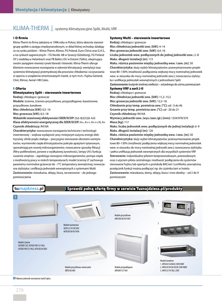 Wentylacja i klimatyzacja | Klimatyzatory KLIMA-THERM | systemy klimatyzacyjne Split, Multi, VRF ❚ O firmie Systemy Multi – sterowanie inwerterowe Klima-Therm to firma założona w 1996 roku w Polsce, która obecnie stanowi grupę spółek o zasięgu międzynarodowym, w skład której wchodzą: działające na rynku polskim – Klima-Therm, Klimor, FG Poland, Euro-Clima oraz G.A.S., a na rynkach zagranicznych – FG Nordic AB w Szwecji (Göteborg), FG Finland OY z siedzibą w Helsinkach oraz FB Baltics OU w Estonii (Tallin), obejmująca swoim zasięgiem również rynek litewski i łotewski. Klima-Therm oferuje klientom nowoczesne rozwiązania w zakresie klimatyzacji, wentylacji oraz systemów klimatyzacji przemysłowej dla procesów chłodzenia i oczyszczania w oparciu o urządzenia renomowanych marek, w tym m.in.: Fujitsu General, Clint, Klimor, Aerial i HB Cotes. Rodzaj: chłodzące i grzewcze Moc chłodnicza jednostki zew. [kW]: 4–14 Moc grzewcza jednostki zew. [kW]: 4,4–16 Liczba jednostek wew. podłączonych do jednej jednostki zew.: 2–8 Maks. długość instalacji [m]: 115 Maks. różnica poziomów między jednostką wew. i zew. [m]: 30 Charakterystyka: duży wybór klimatyzatorów; przewymiarowanie projektowe 80–130% (możliwość podłączenia większej mocy nominalnej jednostek wew. w stosunku do mocy nominalnej jednostki zew.); nowoczesna stylistyka i unifikacja jednostek wewnętrznych z jednostkami Split Zastosowanie: budynki średniej wielkości – od jednego do ośmiu pomieszczeń ❚ Oferta Klimatyzatory Split – sterowanie inwerterowe Rodzaj: chłodzące i grzewcze Modele: ścienne, ścienno-przysufitowe, przypodłogowe, kasetonowe, przysufitowe, kanałowe Moc chłodnicza [kW]: 0,5–16 Moc grzewcza [kW]: 0,5–18 Wskaźniki sezonowej efektywności SEER/SCOP: (5,6–8,5)/(3,8–4,4) Klasa efektywności energetycznej dla SEER/SCOP: A+, A++, A+++/A, A+ Czynnik chłodniczy: R410A Charakterystyka: nowoczesne rozwiązania techniczne i technologii inwerterowej – większa wydajność przy mniejszym zużyciu energii elektrycznej; silniki prądu stałego – precyzyjne sterowanie obrotami wentylatorów; wymienniki ciepła klimatyzatorów pokryte apatytem tytanowym, spowalniającym rozwój mikroorganizmów; nowoczesne sposoby filtracji (filtry polifenolowe, jonowe o wydłużonej żywotności, lampy UV); funkcja suszenia wnętrza – zapobiega rozwojowi mikroorganizmów; pompa ciepła z możliwością pracy w niskich temperaturach; model ścienny LT zachowuje parametry nominalne grzewcze do –7°C temperatury zewnętrznej; nowoczesna stylistyka i unifikacja jednostek wewnętrznych z systemami Multi Zastosowanie: mieszkania, sklepy, biura, serwerownie – do jednego pomieszczenia Systemy VRF z serii J-II Rodzaj: chłodzące i grzewcze Moc chłodnicza jednostki zew. [kW]: 11,2–15,5 Moc grzewcza jednostki zew. [kW]: 12,5–18 Chłodzenie przy temp. powietrza zew. [°C]: od –5 do 46 Grzanie przy temp. powietrza zew. [°C]: od –20 do 21 Czynnik chłodniczy: R410A Wymiary jednostki zew. (wys./szer./gł.) [mm]: 1334/970/370 Masa [kg]: 117 Maks. liczba jednostek wew. podłączonych do jednej instalacji: 6–9 Maks. długość instalacji [m]: 120 Maks. różnica poziomów między jednostką wew. i zew. [m]: 30 Charakterystyka: duży wybór klimatyzatorów; przewymiarowanie projektowe 80–130% (możliwość podłączenia większej mocy nominalnej jednostek wew. w stosunku do mocy nominalnej jednostki zew.); nowoczesna stylistyka i pełna unifikacja jednostek wewnętrznych dla wszystkich systemów VRF Sterowanie: indywidualne pilotem bezprzewodowym, przewodowym oraz z użyciem pilota centralnego; możliwość podłączenia do systemów sterowania Fujitsu lub opartych o protokoły BACnet i LonWorks; zewnętrzny przełącznik funkcji można podłączyć np. do czytnika kart w hotelu Zastosowanie: mieszkania, domy, sklepy, biura i inne obiekty – od 2 do 9 pomieszczeń ❱ Sprawdź pełną ofertę firmy w serwisie Tuznajdziesz.pl/produkty 1 1 Modele przysufitowe ABYG30/36/45/54LR 2 Modele kasetonowe AUYG12/14/18/24LV AUYG30/36/45/54LR Modele ścienne ASYG09/12LT, ASYG07/09/12/14LU, ASYG07/09/12/14LE, ASYG18/24/30LF 3 Modele przysufitowo-uniwersalne ABYG18/24LV 1 Wybrane jednostki wewnętrzne marki Fujitsu 278 Modele przypodłogowe ABYG09/12/14LV Modele kanałowe 1. ARYG45/54/60LH 230V/400V 2. ARYG24/30/36/45LM 230V/400V 3. ARYG12/14/18LL 230V Systemy VRF z serii V-II Rodzaj: chłodzące i grzewcze Moc chłodnicza jednostki zew. [kW]: 22,4–135 Moc grzewcza jednostki zew. [kW]: 25–150 Chłodzenie przy temp. powietrza zew. [°C]: od –15 do 46 Grzanie przy temp. powietrza zew. [°C]: od –20 do 21 Czynnik chłodniczy: R410A Wymiary jednostki zew. (wys./szer./gł.) [mm]: od 1690/930/765 do 1690/1240/765 Masa [kg]: 220 lub 326 Maks. liczba jednostek wew. podłączonych do jednej instalacji: 48 Maks. długość instalacji [m]: 1000 Maks. różnica poziomów między jednostką wew. i zew. [m]: 50 Charakterystyka: sterowanie inwerterowe sprężarek DC; możliwość wyboru jednostek wew. w zakresie mocy nominalnej od 1,1 do 25 kW i różnego typu; przewymiarowanie projektowe od 50 do 150% dla mocy nominalnych jednostek wew. i zew.; nowoczesna stylistyka i pełna unifikacja jednostek wewnętrznych dla wszystkich systemów VRF Sterowanie: sterowniki grupowe i centralne – sterowniki centralne zarządzają pracą od 100 do 1600 jednostek wew.; możliwość rozdziału zużycia energii elektrycznej na poszczególne pomieszczenia; oprogramowanie do zdalnego monitorowania przez internet lub linię telefoniczną; oprogramowanie serwisowe oraz możliwość podłączenia sterowania systemami do BMS w standardzie BACnet lub LonWorks Zastosowanie: apartamenty, domy, sklepy, biurowce i inne obiekty – od 2 do 48 pomieszczeń Czynnik chłodniczy: R410A Wymiary jednostki zew. (wys./szer./gł.) [mm]: od 1690/930/765 do 1690/1240/765 Masa [kg]: od 220 do 320 Maks. liczba jednostek wew. pod