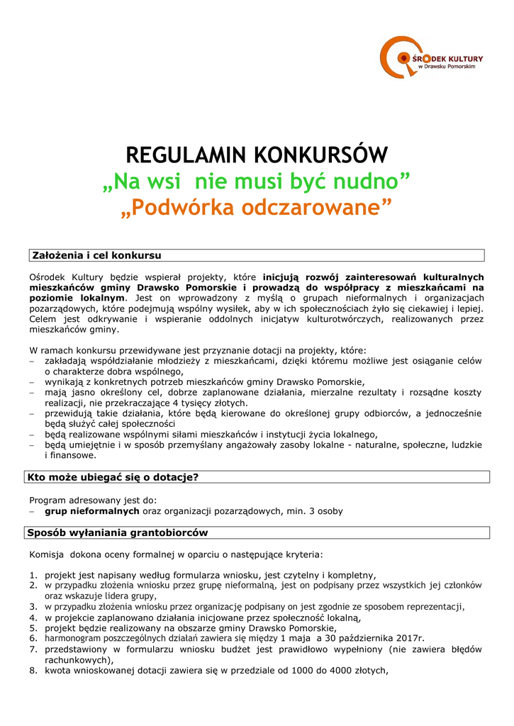 REGULAMIN KONKURSÓW „Na wsi nie musi być nudno” „Podwórka odczarowane” Założenia i cel konkursu Ośrodek Kultury będzie wspierał projekty, które inicjują rozwój zainteresowań kulturalnych mieszkańców gminy Drawsko Pomorskie i prowadzą do współpracy z mieszkańcami na poziomie lokalnym. Jest on wprowadzony z myślą o grupach nieformalnych i organizacjach pozarządowych, które podejmują wspólny wysiłek, aby w ich społecznościach żyło się ciekawiej i lepiej. Celem jest odkrywanie i wspieranie oddolnych inicjatyw kulturotwórczych, realizowanych przez mieszkańców gminy. W ramach konkursu przewidywane jest przyznanie dotacji na projekty, które: zakładają współdziałanie młodzieży z mieszkańcami, dzięki któremu możliwe jest osiąganie celów o charakterze dobra wspólnego, wynikają z konkretnych potrzeb mieszkańców gminy Drawsko Pomorskie, mają jasno określony cel, dobrze zaplanowane działania, mierzalne rezultaty i rozsądne koszty realizacji, nie przekraczające 4 tysięcy złotych. przewidują takie działania, które będą kierowane do określonej grupy odbiorców, a jednocześnie będą służyć całej społeczności będą realizowane wspólnymi siłami mieszkańców i instytucji życia lokalnego, będą umiejętnie i w sposób przemyślany angażowały zasoby lokalne - naturalne, społeczne, ludzkie i finansowe. Kto może ubiegać się o dotacje? Program adresowany jest do: grup nieformalnych oraz organizacji pozarządowych, min. 3 osoby Sposób wyłaniania grantobiorców Komisja dokona oceny formalnej w oparciu o następujące kryteria: 1. projekt jest napisany według formularza wniosku, jest czytelny i kompletny, 2. w przypadku złożenia wniosku przez grupę nieformalną, jest on podpisany przez wszystkich jej członków 3. 4. 5. 6. 7. oraz wskazuje lidera grupy, w przypadku złożenia wniosku przez organizację podpisany on jest zgodnie ze sposobem reprezentacji, w projekcie zaplanowano działania inicjowane przez społeczność lokalną, projekt będzie realizowany na obszarze gminy Drawsko Pomorskie, harmonogram poszczególnych działań zawiera się między 1 maja a 30 października 2017r. przedstawiony w formularzu wniosku budżet jest prawidłowo wypełniony (nie zawiera błędów rachunkowych), 8. kwota wnioskowanej dotacji zawiera się w przedziale od 1000 do 4000 złotych, 9. projekt wyklucza prowadzenie działalności gospodarczej. 10. Z otrzymanej dotacji finansować nie można: udzielania pożyczek, celów religijnych i politycznych oraz uprawiania kultu religijnego, działań sportowych zakupu środków trwałych Wnioski, które spełnią wszystkie powyższe wymagania formalne, zostaną przekazane do oceny merytorycznej do Komisji Projektowej powołanej przez Dyrektora Ośrodka Kultury w Drawsku Pomorskim. W skład komisji wchodzą liderzy grup, którzy złożyli wnioski w konkursie. Posiedzenie komisji odbędzie się pomiędzy1-10.04.2017r. Ocena wniosków odbędzie się na zasadzie tajnego głosowania w oparciu o kartę oceny. Wybrane zostanie od 3 do 7 projektów, których łączna kwota budżetowa nie przekroczy 20 000 zł. Dyrektor Ośrodka Kultury w Drawsku Pomorskim ma prawo do redukcji kosztów projektu. Wyniki posiedzenia Komisji będą zamieszczone na stronie www.kulturadrawsko.pl. Komisja wybierze te projekty, które w najwyższym stopniu spełnią następujące kryteria: 1. odpowiadają celom projektu. 2. angażują mieszkańców. 3. opierają się na współpracy. 4. mają budżet adekwatny do zaplanowanych działań. Ośrodek Kultury w Drawsku Pomorskim ma prawo przyznać dofinansowanie w pełnej lub niepełnej kwocie wnioskowanej przez grupę nieformalną. W przypadku równej liczby punktów, głos decydujący ma przewodniczący komisji. Działania finansowe (zakupy, umowy zlecenia, umowy o dzieło) będą realizowane lub pilotowane przez wyznaczonego pracownika OK. Składanie wniosków 1. Wnioski (w 1 egzemplarzu) powinny być złożone osobiście do Centrum Kultury , ul. Dworcowa 2, 78-500 Drawsko Pomorskie , w godz. 7.00-15.00 2. Wnioski nie spełniające kryteriów formalnych nie będą rozpatrywane. 3. Wnioski będą przyjmowane do 20.03.2017r. 4. Wnioskodawca o decyzji będzie poinformowany telefonicznie w terminie 7 dni od złożenia wniosku. 5. Decyzje o przyznaniu środków finansowych są nieodwołalne i ostateczne.