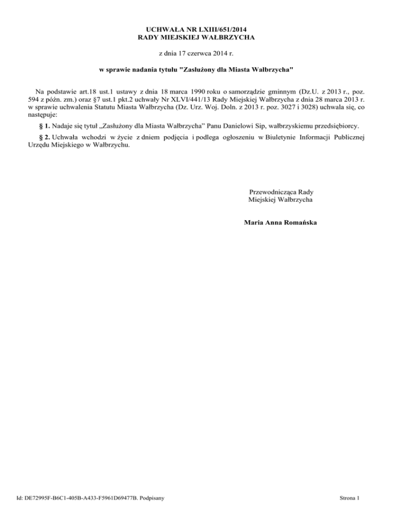 UCHWAŁA NR LXIII/651/2014 RADY MIEJSKIEJ WAŁBRZYCHA z dnia 17 czerwca 2014 r. w sprawie nadania tytułu "Zasłużony dla Miasta Wałbrzycha" Na podstawie art.18 ust.1 ustawy z dnia 18 marca 1990 roku o samorządzie gminnym (Dz.U. z 2013 r., poz. 594 z późn. zm.) oraz §7 ust.1 pkt.2 uchwały Nr XLVI/441/13 Rady Miejskiej Wałbrzycha z dnia 28 marca 2013 r. w sprawie uchwalenia Statutu Miasta Wałbrzycha (Dz. Urz. Woj. Doln. z 2013 r. poz. 3027 i 3028) uchwala się, co następuje: § 1. Nadaje się tytuł „Zasłużony dla Miasta Wałbrzycha” Panu Danielowi Sip, wałbrzyskiemu przedsiębiorcy. § 2. Uchwała wchodzi w życie z dniem podjęcia i podlega ogłoszeniu w Biuletynie Informacji Publicznej Urzędu Miejskiego w Wałbrzychu. Przewodnicząca Rady Miejskiej Wałbrzycha Maria Anna Romańska Id: DE72995F-B6C1-405B-A433-F5961D69477B. Podpisany Strona 1 Uzasadnienie Daniel Sip urodził się 11 marca 1940 roku we Francji, w 1946 roku przyjechał do Polski. W 1954 roku rozpoczął pracę w Katowickim Przedsiębiorstwie Budownictwa Przemysłu Węglowego, a w 1957 roku we Wrocławskim Przedsiębiorstwie Budownictwa Przemysłowego. W międzyczasie uzupełnił wykształcenie techniczne. Po przepracowaniu 30 lat w jednym przedsiębiorstwie na różnych stanowiskach od betoniarza, majstra, zastępcy kierownika do kierownika Zakładu Prefabrykacji, rozpoczął własną działalność gospodarczą. Obecnie jest właścicielem 3 firm w branży budowlanej, handlowej i hotelarskiej. Prowadzone firmy pod nazwą SIRBUD MINARI SA., Centrum Budowlane SIRBUD oraz Sp. jawna oraz PPB Sp. z o.o. świadczą usługi w zakresie budownictwa mieszkaniowego, przemysłowego i sakralnego na terenie całego regionu wałbrzyskiego oraz poza nim. Firma nie jest dużo hektarowa lecz ogromna potencjałem ludzkim, profesjonalizmem, spektakularnymi dokonaniami i wielkością zwykłych, także tych prostych prac budowlanych. Obecnie we wszystkich spółkach zatrudnionych jest ponad 300 pracowników w różnych branżach. Zatrudniając tak liczną grupę fachowców firma wykonuje bardzo wiele różnorodnych zadań – począwszy od betonowych mostów w Golińsku, Czarnym Borze, po wielkoprzemysłowe hale Marketu TEDY SMITH, AUCHAN, hale sportowe, szkoły, domy i bloki mieszkalne. W/w firma budowała również budynki mieszkalne w dzielnicy Piaskowa Góra i Podzamcze. Firma ta brała udział w budowie Szpitala im. Sokołowskiego w Wałbrzychu. Jest również budowniczym wielu kościołów między innymi Piotr i Pawła, Podwyższenia Krzyża na Podzamczu, Świętej Rodziny na ul. Bema i innych. W bieżącym roku Pan Daniel Sip będzie obchodzić 60-lecie swojej pracy zawodowej. Za swą długoletnią działalność uzyskał wiele prestiżowych nagród i odznaczeń.: – I miejsce w województwie wałbrzyskim nominacja i VI miejsce w Polsce w konkursie „Pracodawca roku 2001 „ ogłoszonym przez Krajowy Związek Pracodawców Budownictwa, – II miejsce w województwie dolnośląskim dla najbardziej dynamicznie rozwijającej się firmy w konkursie ogłoszonym przez dziennik „Puls Biznesu” w 2005 roku pod hasłem „GAZELE BIZNESU” oraz włączenie do elitarnego Klubu Gazel Biznesu, – II miejsce w konkursie organizowanym przez Panoramę Wałbrzyską i „Wyrwidąb – człowiek roku 2003”, – II miejsce w konkursie na „Najlepszego Pracodawcę” organizowanego przez Panoramę Wałbrzyską w roku 2012, – I miejsce i statuetkę w „Muflonach 2012” w kategorii Firma odpowiedzialnegoBiznesu. Odznaczenia medalami: – Ludziom Dobrej Roboty WojewództwaWałbrzyskiego, – Zasłużony dl Powiatu Wałbrzyskiego, – odznaczenie z okazji 40-lecia WyzwoleniaWałbrzycha, – Honorowa Srebrna Odznaka Polskiego Związku Inżynierów i TechnikówBudowlanych w 2012 roku, – srebrne i złote odznaczenia z okazji 30-lecia i 40-lecia PRL, – dyplomy za szczególne osiągnięcia w rozwoju przedsiębiorstw w PBU w latach 1970-1974. Od chwili rozpoczęcia działalności gospodarczej Pan Daniel Sip niesie pomoc i wspiera różnorodne instytucje np. domy dziecka, przedszkola, szkoły publiczne, fundacje oraz osoby indywidualne. W miarę możliwości przekazywane są materiały budowlane, środki pieniężne oraz udzielana jest fachowa pomoc przy realizacji np. prac remontowych. Roztacza również szeroką opiekę nad wałbrzyskimi instytucjami kultury, wspiera organizacje charytatywne poprzez organizowanie dobroczynnych imprez. W wyniku szerokiej działalności charytatywnej otrzymał wiele dyplomów,medali i odznaczeń np.: – w roku 2000 Przewodniczący Rady Miejskiej Wałbrzycha w imieniu kapituły nadał tytuł „Złote Słońce 99” za wrażliwość na problemy innych ludzi i niesienieim pomocy, – w 2004 roku II miejsce w konkursie „Filantrop roku regionu wałbrzyskiego”, Id: DE72995F-B6C1-405B-A433-F5961D69477B. Podpisany Strona 1 – medal pamiątkowy za wybitne zasługi w budowie Pomnika Pamięci Górnictwa Wałbrzyskiegow 2007 roku, – Podziękowania i dyplomy – Hufiec Ziemi Wałbrzyskiej za bieżącą pomoc w pracach remontowych Bazy Obozowej ZHP w Wilczu. Pan Daniel Sip wyremontował również wiele mieszkań biednym rodzinom, niepełnosprawnym osobom z własnych środków. Za działalność charytatywną związaną z budową i rozbudową budynków sakralnych uzyskał wiele odznaczeń i podziękowań między innymi: – Złoty Krzyż Zasługi od Diecezji Legnickiej nadany przez Biskupa LegnickiegoTadeusza Rybaka, – Krzyż Św. Stanisława oraz Srebrny Pierścień w uznaniu zasług od Diecezji Świdnickiej nadany przez Biskupa ŚwidnickiegoIgnacego Deca, – Złoty Krzyż Papieża Leona XII nadany w Jerozolimie za pomoc w pracach remontowych i renowacyjnych w Sanktuarium Palm Betfage w Jerozolimie. Przewodnicząca Rady Miejskiej Wałbrzycha Maria Anna Romańska Id: DE72995F-B6C1-405B-A433-F5961D69477B. Podpisany Strona 2