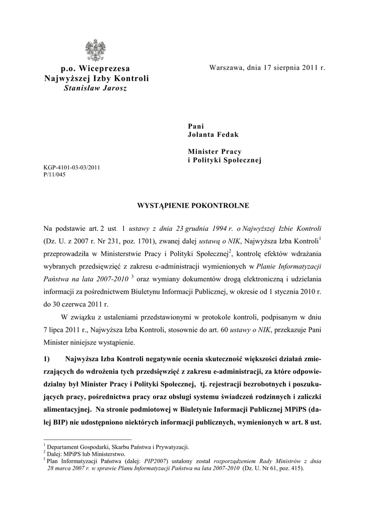 p.o. Wiceprezesa Najwyższej Izby Kontroli Warszawa, dnia 17 sierpnia 2011 r. Stanisław Jarosz Pani Jolanta Fedak Minister Pracy i Polityki Społecznej KGP-4101-03-03/2011 P/11/045 WYSTĄPIENIE POKONTROLNE Na podstawie art. 2 ust. 1 ustawy z dnia 23 grudnia 1994 r. o Najwyższej Izbie Kontroli (Dz. U. z 2007 r. Nr 231, poz. 1701), zwanej dalej ustawą o NIK, Najwyższa Izba Kontroli1 przeprowadziła w Ministerstwie Pracy i Polityki Społecznej2, kontrolę efektów wdrażania wybranych przedsięwzięć z zakresu e-administracji wymienionych w Planie Informatyzacji Państwa na lata 2007-2010 3 oraz wymiany dokumentów drogą elektroniczną i udzielania informacji za pośrednictwem Biuletynu Informacji Publicznej, w okresie od 1 stycznia 2010 r. do 30 czerwca 2011 r. W związku z ustaleniami przedstawionymi w protokole kontroli, podpisanym w dniu 7 lipca 2011 r., Najwyższa Izba Kontroli, stosownie do art. 60 ustawy o NIK, przekazuje Pani Minister niniejsze wystąpienie. 1) Najwyższa Izba Kontroli negatywnie ocenia skuteczność większości działań zmie- rzających do wdrożenia tych przedsięwzięć z zakresu e-administracji, za które odpowiedzialny był Minister Pracy i Polityki Społecznej, tj. rejestracji bezrobotnych i poszukujących pracy, pośrednictwa pracy oraz obsługi systemu świadczeń rodzinnych i zaliczki alimentacyjnej. Na stronie podmiotowej w Biuletynie Informacji Publicznej MPiPS (dalej BIP) nie udostępniono niektórych informacji publicznych, wymienionych w art. 8 ust. 1 Departament Gospodarki, Skarbu Państwa i Prywatyzacji. Dalej: MPiPS lub Ministerstwo. 3 Plan Informatyzacji Państwa (dalej: PIP2007) ustalony został rozporządzeniem Rady Ministrów z dnia 28 marca 2007 r. w sprawie Planu Informatyzacji Państwa na lata 2007-2010 (Dz. U. Nr 61, poz. 415). 2 3 ustawy z dnia 6 września 2001 r. o dostępie do informacji publicznej4, a ponadto informacji o funkcjonowaniu Elektronicznej Skrzynki Podawczej (dalej ESP). Nieprawidłowości w zakresie zawartości BIP zostały usunięte jeszcze w trakcie trwania kontroli. 2) Osoby bezrobotne i poszukujące pracy do czasu zakończenia kontroli faktycznie nie miały możliwości zarejestrowania się w urzędzie pracy przy wykorzystaniu wyłącznie drogi elektronicznej. Dla zadania nr 14 w PIP2007 Proces rejestracji bezrobotnych i poszukujących pracy wyróżniono dwie funkcjonalności: złożenie wniosku o rejestrację oraz informacje o aktualnym stanie załatwiania wniosku. Stworzona w 2005 r. aplikacja eForm umożliwiała wprawdzie wypełnienie formularzy wniosków o rejestrację znajdujących się na stronie internetowej według ścieżki wyznaczonej przez oprogramowanie oraz ich wysłanie do właściwego miejscowo powiatowego urzędu pracy, nie eliminowała jednak konieczności osobistego stawiennictwa zainteresowanego w urzędzie. Nie było bowiem możliwe opatrzenie takiego wniosku podpisem elektronicznym ani załączenie do niego wymaganych dokumentów. Faktyczna rejestracja – zgodnie z § 4 ust. 1 rozporządzenia Ministra Gospodarki i Pracy z dnia 26 listopada 2004 r. w sprawie rejestracji bezrobotnych i poszukujących pracy5 - następowała po poświadczeniu własnoręcznym podpisem przez bezrobotnego lub poszukującego pracy prawdziwości danych i oświadczeń zamieszczonych w karcie rejestracyjnej oraz po przedłożeniu urzędnikowi wymaganych dokumentów, o których mowa w § 3 ust. 1 i 2 powyższego rozporządzenia. Informacje o aktualnym stanie załatwiania wniosku można było uzyskać tylko dla wniosków zgłoszonych elektronicznie, za pośrednictwem aplikacji eForm. Funkcjonalność ta nie obejmowała wniosków złożonych w urzędzie w formie papierowej. Umowę na wykonanie aplikacji eForm za 1 012,2 tys. zł zawarło w dniu 6 lipca 2005 r. ówczesne Ministerstwo Gospodarki i Pracy. Zrealizowano ją w ramach projektu Powstanie Systemu Informacyjnego Publicznych Służb Zatrudnienia Syriusz i sfinansowano ze środków Europejskiego Funduszu Społecznego oraz Funduszu Pracy. Aplikacją administrowali pracownicy Ministerstwa w ramach obowiązków służbowych. Od lutego 2006 r. do stycznia 2011 r. za jej pośrednictwem zarejestrowano 444 sprawy realizowane przez 73 spośród 258 urzędów pracy, przy czym prawie 68% wszystkich spraw realizowało 10 urzędów. W ocenie NIK, świadczy to o niewielkim zainteresowaniu tą aplikacją zarówno przez bezrobotnych 4 5 Dz. U. Nr 112, poz. 1198 ze zm. Dz. U. Nr 262, poz. 2607 ze zm., weszło w życie z dniem 25 grudnia 2004 r. 2 oraz poszukujących pracy, jak i urzędy pracy i to pomimo prowadzonych przez Ministerstwo działań popularyzatorskich. Dyrektor Biura Dyrektora Generalnego – Pani Marzenna Kołodziejak wyjaśniła6, że zaimplementowana i udostępniona do eksploatacji funkcjonalność oprogramowania eForm była zgodna z przepisami przywołanego wyżej rozporządzenia z dnia 26 listopada 2004 r. Celem tych przepisów było zapobieganie nadużyciom (np. pobieraniu świadczeń przez osoby przebywające za granicą albo za osoby nieżyjące), które miały miejsce przed dniem wejścia w życie rozporządzenia, gdy osobisty kontakt bezrobotnego lub poszukującego pracy z urzędem nie był wymagany. Zdaniem wyjaśniającej, wymóg przedłożenia dokumentów na potwierdzenie informacji bezrobotnych oraz potwierdzenie własnoręcznym podpisem prawdziwości danych i oświadczeń zapewnia, aczkolwiek tylko w pewnym zakresie, eliminację nadużyć i nieprawidłowości. Przedstawione powyżej okoliczności wskazują, że przewidziana w Planie Informatyzacji Państwa możliwość złożenia przez bezrobotnego lub osobę poszukującą pracy wniosku o rejestrację w formie elektronicznej nie mogła zostać zrealizowana wskutek niezapewnienia przez Ministra Pracy i Polityki Społecznej niezbędnych po temu warunków, w drodze wprowadzenia stosownych zmian przepisów rozporządzenia z dnia 26 listopada 2004 r. (usunięcia barier proceduralnych dla dokonania rejestracji)