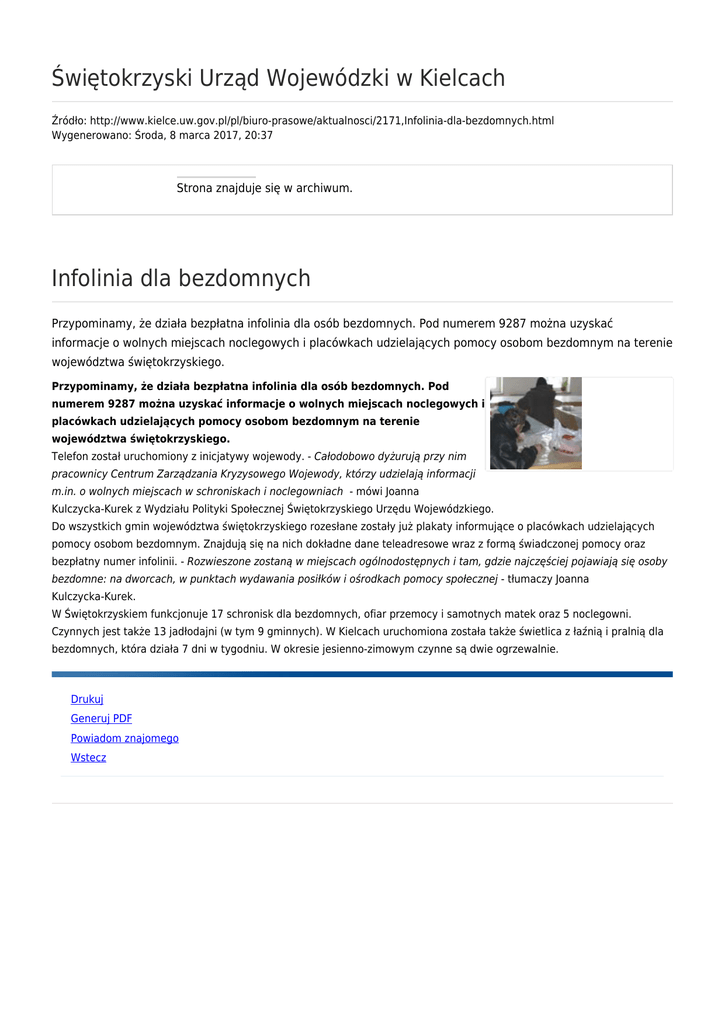 Świętokrzyski Urząd Wojewódzki w Kielcach Infolinia dla bezdomnych