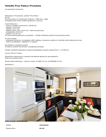 Osiedle Przy Pałacu Pruszków [na sprzedaż] mieszkania Mieszkanie w Pruszkowie, osiedle "Przy Pałacu" 64 m2 Pierwsze piętro w IV piętrowym budynku z 2009 roku, cegła. W budynku jest winda, osiedle ogrodzone z ochroną. Lokal składa się z: - salonu z aneksem kuchennym ( 26,09 m2) - sypialni ( 12,54 m2) - sypialni ( 9,27 m2) - łazienki razem z WC ( 6,55 m2) - kabina prysznicowa. - przedpokoju ( 9,91 m2) - balkonu ( 12,32 m2) W chwili obecnej połączone są sypialnie - istnieje możliwość powrotu do pierwotnej wersji. W cenie zostaje: - zabudowa kuchenna ( ze sprzętem AGD: lodówka, zmywarka, piekarnik, mikrofala, płyta elektryczna) oraz - szafa w przedpokoju , bibliotece i w sypialni. Na podłodze w pokojach panele. W salonie, aneksie kuchennym i przedpokoju terakota. Istnieje możliwość dokupienia miejsca postojowego w garażu podziemnym ( + 29 000 zł). Czynsz: 550 zł/ 2 osoby Mieszkanie wykończone w wysokim standardzie gotowe do wprowadzenia. Wolne od września 2016 Bardzo dobra lokalizacja - centrum miasta. do WKD 10 min, do PKP/SKM 10 min. POLECAM !!! Informacje dodatkowe Rodzaj mieszkania Powierzchnia 64 m2 Powierzchnia działki nie dotyczy Liczba pięter nie dotyczy Pokoje 3 Piętro 1 Adres ogłoszenia http://czterysciany.net/osiedle-przy-palacu-pruszkow,o142 Kontakt Mail: [email protected] Telefon: 500 000 000 Lokalizacja , Pruszków Mazowieckie (Polska) Ogłoszenie dodano: 2016-06-04 19:06:55 Ogłoszenie wygasa: 2016-12-03 19:06:55 Powered by TCPDF (www.tcpdf.org)