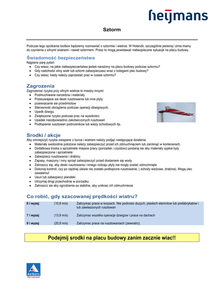 Sztorm Podczas tego spotkania toolbox będziemy rozmawiać o sztormie i wietrze. W Holandii, szczególnie jesienią i zima mamy do czynienia z silnymi wiatrami i nawet sztormem. Przez to mogą powstawać niebezpieczne sytuacje na placu budowy. Świadomość bezpieczeństwa Najpierw parę pytań: Czy wiesz, na jakie niebezpieczeństwa jesteś narażony na placu bodowy podczas sztormu? Gdy nadchodzi silny wiatr lub sztorm zabezpieczasz wraz z kolegami plac budowy? Czy wiesz, kiedy należy zaprzestać prac w czasie sztormu? Zagrozenia Zagrozenia/ ryzyka przy silnym wietrze to miedzy innymi: Podmuchiwane narzedzia i materialy Przesuwajace sie deski rusztowania lub inne plyty przewracanie sie przedmiotow Sterowność obciążenia podczas operacji dźwigowych; Upadk dzwigu Zwiększone ryzyko podczas prac na wysokości; Upadek nieodpowiednio zakotwiczonych rusztowań Podtopienie rusztowan podnosnikow lub wiezy schodowych itp. Srodki / akcje Aby zmniejszyć ryzyka związane z burza i wiatrem należy podjąć następujące działania: Materiały swobodnie położone należy zabezpieczyć przed ich zdmuchnięciem lub zamknąć w kontenerach. Dodatkowa troska o sprzatniete miejsce pracy (porzadek i czystosc) postaraj sie aby materialy sypkie byly zabezpieczone i sprzatniete Zabezpiecz rusztowania i drabiny. Zapasy, maszyny i inny sprzęt zabezpieczyć przed dostaniem się wody Zatroszcz się, aby deski rusztowania i innego rodzaju płyty nie mogły zostać zdmuchnięte Dokonaj kontroli, czy po ciężkiej ulewie nie zostało podtopione rusztowanie, ( schody wieżowe, drabina). Mogą ulec zawaleniu! Usun lub zabezpiecz plandeki Utrzymaj drogi przechodnie w porzadku Zatroszcz sie aby ogrodzenia sa stabilne, aby uniknac ich zdmuchniecia Co robić, gdy szacowanej prędkości wiatru? 6 i wyzej (10,8 m/s) Zatrzymac prace w koszach. Nie podnosic duzych, plaskich elemntow lub prefabrykatow i lub zawieszonych rusztowan 7 i wyzej (13,9 m/s) Zatrzymac wszelka operacje dzwigow i prace na dachach 9 i wyzej (20,8 m/s) Zatrzymac prace na rusztowaniach (zewnatrz). Podejmij srodki na placu budowy zanim zacznie wiac!!