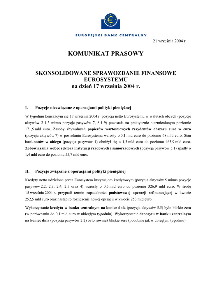 21 września 2004 r. KOMUNIKAT PRASOWY SKONSOLIDOWANE SPRAWOZDANIE FINANSOWE EUROSYSTEMU na dzień 17 września 2004 r. I. Pozycje niezwiązane z operacjami polityki pieniężnej W tygodniu kończącym się 17 września 2004 r. pozycja netto Eurosystemu w walutach obcych (pozycje aktywów 2 i 3 minus pozycje pasywów 7, 8 i 9) pozostała na praktycznie niezmienionym poziomie 171,5 mld euro. Zasoby zbywalnych papierów wartościowych rezydentów obszaru euro w euro (pozycja aktywów 7) w posiadaniu Eurosystemu wzrosły o 0,1 mld euro do poziomu 68 mld euro. Stan banknotów w obiegu (pozycja pasywów 1) obniżył się o 1,3 mld euro do poziomu 463,9 mld euro. Zobowiązania wobec sektora instytucji rządowych i samorządowych (pozycja pasywów 5.1) spadły o 1,4 mld euro do poziomu 55,7 mld euro. II. Pozycje związane z operacjami polityki pieniężnej Kredyty netto udzielone przez Eurosystem instytucjom kredytowym (pozycja aktywów 5 minus pozycje pasywów 2.2, 2.3, 2.4, 2.5 oraz 4) wzrosły o 0,5 mld euro do poziomu 326,9 mld euro. W środę 15 września 2004 r. przypadł termin zapadalności podstawowej operacji refinansującej w kwocie 252,5 mld euro oraz nastąpiło rozliczenie nowej operacji w kwocie 253 mld euro. Wykorzystanie kredytu w banku centralnym na koniec dnia (pozycja aktywów 5.5) było bliskie zeru (w porównaniu do 0,1 mld euro w ubiegłym tygodniu). Wykorzystanie depozytu w banku centralnym na koniec dnia (pozycja pasywów 2.2) było również bliskie zeru (podobnie jak w ubiegłym tygodniu). 2 III. Stan rachunków bieżących instytucji kredytowych obszaru euro W wyniku wszystkich operacji stan rachunków bieżących instytucji kredytowych w Eurosystemie (pozycja pasywów 2.1) wzrósł o 1,1 mld euro do poziomu 138,4 mld euro. Europejski Bank Centralny Dział Prasy i Informacji Kaiserstrasse 29, D-60311 Frankfurt am Main tel.: +49 69 1344 7455, faks: +49 69 1344 7404 Internet: http://www.ecb.int Przedruk dozwolony z podaniem źródła. Skonsolidowane tygodniowe sprawozdanie finansowe Eurosystemu na dzień 17.09.04 (w milionach EUR) Aktywa Stan na dzień 17.09.04 1 Złoto i należności w złocie Różnica wobec zeszłego tygodnia z tytułu operacji 127.382 2 Należności od nierezydentów obszaru euro w walutach obcych 2.1 Należności od MFW 2.2 Rachunki w bankach i inwestycje w papiery wartościowe, udzielone kredyty oraz inne aktywa zagraniczne 3 Należności od rezydentów obszaru euro w walutach obcych 4 Należności od nierezydentów obszaru euro w euro Rachunki w bankach, inwestycje w papiery wartościowe oraz udzielone 4.1 kredyty Należności z tytułu instrumentów kredytowych w ramach europejskiego 4.2 mechanizmu kursowego ERM II 0 27.502 60 140.207 167.709 105 165 17.521 -82 7.556 -312 Podstawowe operacje refinansujące Dłuższe operacje refinansujące Dostrajające operacje z przyrzeczeniem odkupu Strukturalne operacje z przyrzeczeniem odkupu Kredyt w banku centralnym na koniec dnia 5.6 Kredyty związane ze zmianą wartości depozytu zabezpieczającego 6 Pozostałe należności od instytucji kredytowych obszaru euro w euro 0 7.556 -312 253.000 74.999 0 0 3 499 0 0 0 -48 6 3 328.008 454 1.573 63 67.981 8 Należności od sektora instytucji rządowych i samorządowych w euro 463.944 -1.338 2 Zobowiązania wobec instytucji kredytowych obszaru euro z tytułu operacji polityki pieniężnej w euro 2.1 Rachunki bieżące (w tym rachunki rezerw obowiązkowych) 2.2 Depozyt w banku centralnym na koniec dnia 2.3 Depozyty terminowe 2.4 Dostrajające operacje z przyrzeczeniem odkupu 138.434 21 0 0 1.056 1 0 0 0 138.455 1.057 125 0 1.054 0 55.676 5.900 61.576 -1.398 101 -1.297 9.122 35 384 62 7.430 -13 2.5 Depozyty związane ze zmianą wartości depozytu zabezpieczającego 3 Pozostałe zobowiązania wobec instytucji kredytowych obszaru euro w euro 4 Zobowiązania z tytułu emisji dłużnych papierów wartościowych 5 Zobowiązania wobec pozostałych rezydentów obszaru euro w euro 5.1 Zobowiązania wobec sektora instytucji rządowych i samorządowych 5.2 Pozostałe zobowiązania 6 Zobowiązania wobec nierezydentów obszaru euro w euro 7 Zobowiązania wobec rezydentów obszaru euro w walutach obcych Aktywa ogółem Poszczególne pozycje mogą nie sumować się ze względu na zaokrąglenia. 118 42.089 0 115.429 232 875.248 0 8 Zobowiązania wobec nierezydentów obszaru euro w walutach obcych 8.2 Zobowiązania z tytułu instrumentów kredytowych w ramach europejskiego mechanizmu kursowego ERM II 0 0 7.430 -13 5.896 0 10 Pozostałe pasywa 57.283 2.131 11 Różnice z aktualizacji wyceny 70.205 0 12 Fundusze i rezerwy 59.774 1 875.248 638 9 Zobowiązania wobec MFW z tytułu specjalnych praw ciągnienia (SDR) 9 Pozostałe aktywa Różnica wobec zeszłego tygodnia z tytułu operacji 1 Banknoty w obiegu 8.1 Zobowiązania z tytułu depozytów, prowadzonych rachunków oraz pozostałe zobowiązania 7 Papiery wartościowe rezydentów obszaru euro w euro Stan na dzień 17.09.04 0 5 Należności od instytucji kredytowych obszaru euro z tytułu udzielonych kredytów związanych z operacjami polityki pieniężnej w euro 5.1 5.2 5.3 5.4 5.5 Pasywa 638 Pasywa ogółem Wydział Prasy i Informacji, Kaiserstrasse 29, D-60311 Frankfurt am Main, tel.: +49 69-13 44-74 55, faks: +49 69-13 44-74 04
