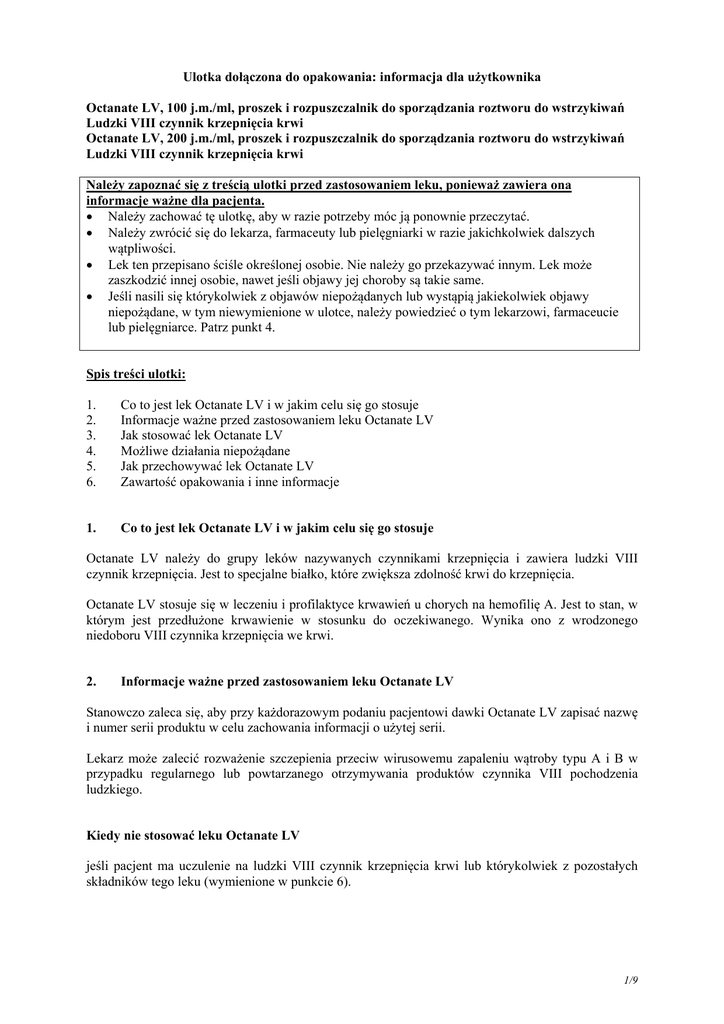 Ulotka dołączona do opakowania: informacja dla użytkownika Octanate LV, 100 j.m./ml, proszek i rozpuszczalnik do sporządzania roztworu do wstrzykiwań Ludzki VIII czynnik krzepnięcia krwi Octanate LV, 200 j.m./ml, proszek i rozpuszczalnik do sporządzania roztworu do wstrzykiwań Ludzki VIII czynnik krzepnięcia krwi Należy zapoznać się z treścią ulotki przed zastosowaniem leku, ponieważ zawiera ona informacje ważne dla pacjenta. Należy zachować tę ulotkę, aby w razie potrzeby móc ją ponownie przeczytać. Należy zwrócić się do lekarza, farmaceuty lub pielęgniarki w razie jakichkolwiek dalszych wątpliwości. Lek ten przepisano ściśle określonej osobie. Nie należy go przekazywać innym. Lek może zaszkodzić innej osobie, nawet jeśli objawy jej choroby są takie same. Jeśli nasili się którykolwiek z objawów niepożądanych lub wystąpią jakiekolwiek objawy niepożądane, w tym niewymienione w ulotce, należy powiedzieć o tym lekarzowi, farmaceucie lub pielęgniarce. Patrz punkt 4. Spis treści ulotki: 1. 2. 3. 4. 5. 6. Co to jest lek Octanate LV i w jakim celu się go stosuje Informacje ważne przed zastosowaniem leku Octanate LV Jak stosować lek Octanate LV Możliwe działania niepożądane Jak przechowywać lek Octanate LV Zawartość opakowania i inne informacje 1. Co to jest lek Octanate LV i w jakim celu się go stosuje Octanate LV należy do grupy leków nazywanych czynnikami krzepnięcia i zawiera ludzki VIII czynnik krzepnięcia. Jest to specjalne białko, które zwiększa zdolność krwi do krzepnięcia. Octanate LV stosuje się w leczeniu i profilaktyce krwawień u chorych na hemofilię A. Jest to stan, w którym jest przedłużone krwawienie w stosunku do oczekiwanego. Wynika ono z wrodzonego niedoboru VIII czynnika krzepnięcia we krwi. 2. Informacje ważne przed zastosowaniem leku Octanate LV Stanowczo zaleca się, aby przy każdorazowym podaniu pacjentowi dawki Octanate LV zapisać nazwę i numer serii produktu w celu zachowania informacji o użytej serii. Lekarz może zalecić rozważenie szczepienia przeciw wirusowemu zapaleniu wątroby typu A i B w przypadku regularnego lub powtarzanego otrzymywania produktów czynnika VIII pochodzenia ludzkiego. Kiedy nie stosować leku Octanate LV jeśli pacjent ma uczulenie na ludzki VIII czynnik krzepnięcia krwi lub którykolwiek z pozostałych składników tego leku (wymienione w punkcie 6). 1/9 Ostrzeżenia i środki ostrożności Przed rozpoczęciem przyjmowania Octanate LV należy zwrócić się do lekarza, farmaceuty lub pielęgniarki. Octanate LV zawiera śladowe ilości innych ludzkich białek. Każdy lek, który zawiera białka i który jest wstrzyknięty do żyły (podany dożylnie) może wywoływać reakcje alergiczne (patrz punkt 4. Możliwe działania niepożądane). U pacjentów z hemofilią A może dochodzić do powstawania inhibitorów czynnika VIII (przeciwciał neutralizujących) (patrz punkt 4. Możliwe działania niepożądane). Informacje odnośnie krwi i osocza użytych do wytwarzania Octanate LV Podczas wytwarzania leków z ludzkiej krwi lub osocza, podejmowane są określone środki działania, mające na celu zapobieganie przenoszeniu zakażeń na pacjentów. Obejmują one staranny dobór dawców krwi i osocza, aby zapewnić wykluczenie dawców mogących być nosicielami zakażeń, jak również badania wszystkich pobranych próbek i puli osocza, w celu wykrycia obecności wirusów/zakażeń. Wytwórcy tych produktów wdrożyli do procesu przetwarzania krwi lub osocza etapy mające na celu inaktywację lub usunięcie wirusów. Mimo tych działań, w przypadku podawania leków przygotowanych z ludzkiej krwi lub osocza, nie można całkowicie wykluczyć możliwości przeniesienia zakażenia. Dotyczy to również nieznanych lub pojawiających się od niedawna wirusów, lub innych rodzajów infekcji. Podejmowane środki są uważane za skuteczne wobec wirusów otoczkowych, takich jak wirus ludzkiego niedoboru odporności (HIV), wirus zapalenia wątroby typu B (HBV) i wirus zapalenia wątroby typu C (HCV) oraz bezotoczkowego wirusa zapalenia wątroby typu A (HAV). Zastosowane metody mogą mieć ograniczoną skuteczność w stosunku do wirusów bezotoczkowych takich, jak parwowirus B19. Zakażenie parwowirusem B19 może być groźne dla kobiet w ciąży (zakażenie dziecka) oraz u osób, których układ odpornościowy jest stłumiony lub, którzy chorują na niektóre rodzaje niedokrwistości (np. niedokrwistość sierpowatokrwinkową lub nieprawidłowy rozpad krwinek czerwonych). Inne leki i Octanate LV Należy powiedzieć lekarzowi lub farmaceucie o wszystkich lekach przyjmowanych obecnie lub ostatnio, a także o lekach, które pacjent planuje przyjmować, również tych, które wydawane są bez recepty. Nie są znane interakcje ludzkiego VIII czynnika krzepnięcia z innymi produktami leczniczymi. Jednakże nie należy mieszać Octanate LV z innymi lekami podczas infuzji. Ciąża i karmienie piersią Przed zastosowaniem każdego leku należy poradzić się lekarza lub farmaceuty. Prowadzenie pojazdów i obsługiwanie maszyn Nie obserwowano wpływu na zdolność prowadzenia pojazdów i obsługiwania maszyn. Lek Octanate LV zawiera do 1,75 mmol sodu (40 mg) na dawkę w jednej fiolce 500 j.m. i 1000 j.m. Należy to uwzględnić u pacjentów na diecie z ograniczeniem sodu. 2/9 3. Jak stosować lek Octanate LV Octanate LV powinien być podawany dożylnie po rekonstytucji w załączonym rozpuszczalniku. Leczenie należy rozpoczynać pod nadzorem medycznym. Dawkowanie w zapobieganiu krwawieniom: W długoterminowej profilaktyce krwawień u pacjentów z ciężką postacią hemofilii A powinno podawać się czynnik VIII w dawce 20 do 40 j.m. na kilogram masy ciała w odstępach 2 do 3 dni. Dawkę należy dostosować do odpowiedzi klinicznej. W niektórych przypadkach konieczne może być podawanie leku w krótszych odstępach czasu lub w większych dawkach. Obliczanie dawki: Octanate LV na
