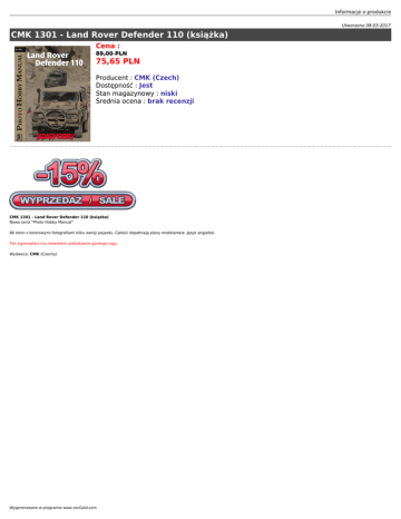 Informacje o produkcie Utworzono 08-03-2017 CMK 1301 - Land Rover Defender 110 (książka) Cena : 89,00 PLN 75,65 PLN Producent : CMK (Czech) Dostępność : Jest Stan magazynowy : niski Średnia ocena : brak recenzji CMK 1301 - Land Rover Defender 110 (książka) Nowa seria "Photo Hobby Manual" 86 stron z kolorowymi fotografiami kilku wersji pojazdu. Całości dopełniają plany modelarskie. Język angielski. Ten egzemplarz ma niewielkie uszkodzenie górnego rogu. Wydawca: CMK (Czechy) Wygenerowano w programie www.oscGold.com Informacje o produkcie Wygenerowano w programie www.oscGold.com Informacje o produkcie Wygenerowano w programie www.oscGold.com