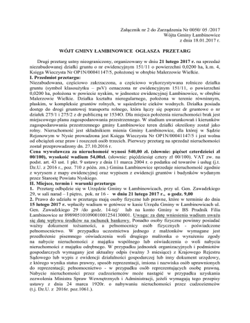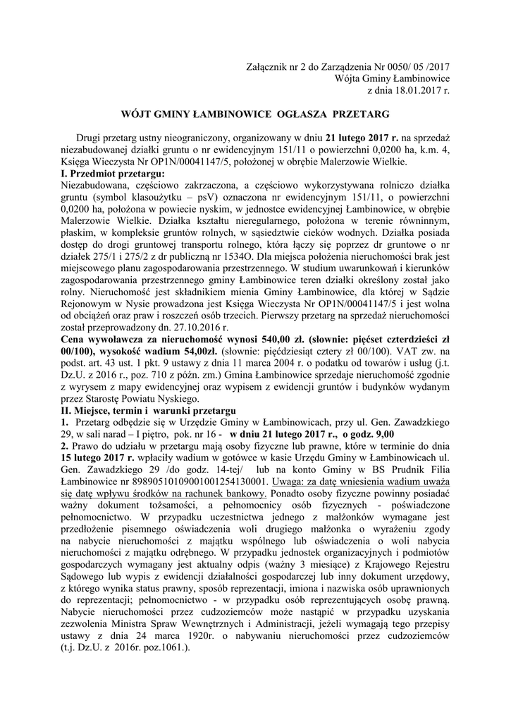 Załącznik nr 2 do Zarządzenia Nr 0050/ 05 /2017 Wójta Gminy Łambinowice z dnia 18.01.2017 r. WÓJT GMINY ŁAMBINOWICE OGŁASZA PRZETARG Drugi przetarg ustny nieograniczony, organizowany w dniu 21 lutego 2017 r. na sprzedaż niezabudowanej działki gruntu o nr ewidencyjnym 151/11 o powierzchni 0,0200 ha, k.m. 4, Księga Wieczysta Nr OP1N/00041147/5, położonej w obrębie Malerzowie Wielkie. I. Przedmiot przetargu: Niezabudowana, częściowo zakrzaczona, a częściowo wykorzystywana rolniczo działka gruntu (symbol klasoużytku – psV) oznaczona nr ewidencyjnym 151/11, o powierzchni 0,0200 ha, położona w powiecie nyskim, w jednostce ewidencyjnej Łambinowice, w obrębie Malerzowie Wielkie. Działka kształtu nieregularnego, położona w terenie równinnym, płaskim, w kompleksie gruntów rolnych, w sąsiedztwie cieków wodnych. Działka posiada dostęp do drogi gruntowej transportu rolnego, która łączy się poprzez dr gruntowe o nr działek 275/1 i 275/2 z dr publiczną nr 1534O. Dla miejsca położenia nieruchomości brak jest miejscowego planu zagospodarowania przestrzennego. W studium uwarunkowań i kierunków zagospodarowania przestrzennego gminy Łambinowice teren działki określony został jako rolny. Nieruchomość jest składnikiem mienia Gminy Łambinowice, dla której w Sądzie Rejonowym w Nysie prowadzona jest Księga Wieczysta Nr OP1N/00041147/5 i jest wolna od obciążeń oraz praw i roszczeń osób trzecich. Pierwszy przetarg na sprzedaż nieruchomości został przeprowadzony dn. 27.10.2016 r. Cena wywoławcza za nieruchomość wynosi 540,00 zł. (słownie: pięćset czterdzieści zł 00/100), wysokość wadium 54,00zł. (słownie: pięćdziesiąt cztery zł 00/100). VAT zw. na podst. art. 43 ust. 1 pkt. 9 ustawy z dnia 11 marca 2004 r. o podatku od towarów i usług (j.t. Dz.U. z 2016 r., poz. 710 z późn. zm.) Gmina Łambinowice sprzedaje nieruchomość zgodnie z wyrysem z mapy ewidencyjnej oraz wypisem z ewidencji gruntów i budynków wydanym przez Starostę Powiatu Nyskiego. II. Miejsce, termin i warunki przetargu 1. Przetarg odbędzie się w Urzędzie Gminy w Łambinowicach, przy ul. Gen. Zawadzkiego 29, w sali narad – I piętro, pok. nr 16 - w dniu 21 lutego 2017 r., o godz. 9,00 2. Prawo do udziału w przetargu mają osoby fizyczne lub prawne, które w terminie do dnia 15 lutego 2017 r. wpłaciły wadium w gotówce w kasie Urzędu Gminy w Łambinowicach ul. Gen. Zawadzkiego 29 /do godz. 14-tej/ lub na konto Gminy w BS Prudnik Filia Łambinowice nr 89890510109001001254130001. Uwaga: za datę wniesienia wadium uważa się datę wpływu środków na rachunek bankowy. Ponadto osoby fizyczne powinny posiadać ważny dokument tożsamości, a pełnomocnicy osób fizycznych - poświadczone pełnomocnictwo. W przypadku uczestnictwa jednego z małżonków wymagane jest przedłożenie pisemnego oświadczenia woli drugiego małżonka o wyrażeniu zgody na nabycie nieruchomości z majątku wspólnego lub oświadczenia o woli nabycia nieruchomości z majątku odrębnego. W przypadku jednostek organizacyjnych i podmiotów gospodarczych wymagany jest aktualny odpis (ważny 3 miesiące) z Krajowego Rejestru Sądowego lub wypis z ewidencji działalności gospodarczej lub inny dokument urzędowy, z którego wynika status prawny, sposób reprezentacji, imiona i nazwiska osób uprawnionych do reprezentacji; pełnomocnictwo - w przypadku osób reprezentujących osobę prawną. Nabycie nieruchomości przez cudzoziemców może nastąpić w przypadku uzyskania zezwolenia Ministra Spraw Wewnętrznych i Administracji, jeżeli wymagają tego przepisy ustawy z dnia 24 marca 1920r. o nabywaniu nieruchomości przez cudzoziemców (t.j. Dz.U. z 2016r. poz.1061.). -23. Wadium wniesione w pieniądzu przez uczestnika przetargu, który przetarg wygrał, zalicza się na poczet ceny nabycia nieruchomości. Pozostałym uczestnikom przetargu wadium zostaje zwrócone bezpośrednio po odwołaniu lub zamknięciu przetargu, jednak nie później niż przed upływem trzech dni od dnia odwołania lub zamknięcia przetargu. 4. Uczestnicy przetargu składają pisemne oświadczenia o znajomości przedmiotu sprzedaży i granic nieruchomości, braku zastrzeżeń do przedmiotu sprzedaży, kupna w stanie istniejącym, oraz o nabywaniu nieruchomości na podstawie dokumentów wydanych z ewidencji gruntów i budynków (druki pełnej treści oświadczeń dostępne przed otwarciem przetargu). 5. Dowód wpłaty wadium podlega przedłożeniu komisji przetargowej przed otwarciem przetargu. 6.Wadium przepada na rzecz sprzedawcy w razie uchylania się nabywcy od zawarcia umowy przenoszącej własność nieruchomości. 7.Ustalony w przetargu nabywca zobowiązany jest do dokonania wpłaty ceny nabycia nie później niż na dzień przed zawarciem umowy notarialnej przenoszącej własność oraz pokrycia wszelkich opłat związanych ze sporządzeniem umowy. O terminie i miejscu zawarcia umowy nabywca zostanie powiadomiony w odrębnej korespondencji. 8.Wójt Gminy Łambinowice zastrzega sobie prawo odwołania przetargu jedynie z ważnych powodów, informując o tym niezwłocznie w formie właściwej dla ogłoszenia o przetargu i podając przyczynę odwołania przetargu. 9. Wydanie (przejęcie nieruchomości) nastąpi w dniu podpisania aktu notarialnego. 10.Ogłoszenie o przetargu jest umieszczone na tablicach ogłoszeń w siedzibie Urzędu Gminy w Łambinowicach oraz w sołectwie Malerzowie Wielkie, na stronie internetowej Urzędu: www.lambinowice.pl, a także w Biuletynie Informacji Publicznej pod adresem: www.bip.lambinowice.pl. 11. Szczegółowe informacje można uzyskać w siedzibie Urzędu Gminy Łambinowice, ul. Gen. Zawadzkiego 29, pok. nr 2 I piętro, lub telefonicznie - 077 4311300, 301, wew. 211. Wójt /-/ Tomasz Karpiński Łambinowice, 18.01.2017 r. Wyk.EP.