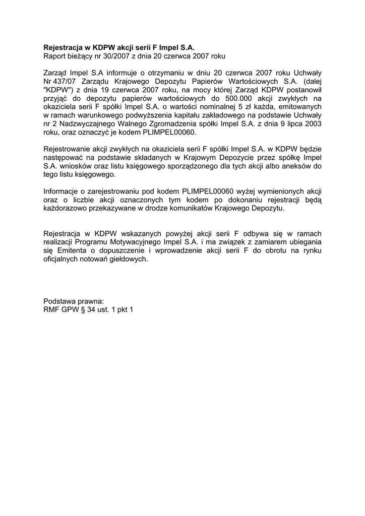 Rejestracja w KDPW akcji serii F Impel S.A. Raport bieżący nr 30/2007 z dnia 20 czerwca 2007 roku Zarząd Impel S.A informuje o otrzymaniu w dniu 20 czerwca 2007 roku Uchwały Nr 437/07 Zarządu Krajowego Depozytu Papierów Wartościowych S.A. (dalej "KDPW") z dnia 19 czerwca 2007 roku, na mocy której Zarząd KDPW postanowił przyjąć do depozytu papierów wartościowych do 500.000 akcji zwykłych na okaziciela serii F spółki Impel S.A. o wartości nominalnej 5 zł każda, emitowanych w ramach warunkowego podwyższenia kapitału zakładowego na podstawie Uchwały nr 2 Nadzwyczajnego Walnego Zgromadzenia spółki Impel S.A. z dnia 9 lipca 2003 roku, oraz oznaczyć je kodem PLIMPEL00060. Rejestrowanie akcji zwykłych na okaziciela serii F spółki Impel S.A. w KDPW będzie następować na podstawie składanych w Krajowym Depozycie przez spółkę Impel S.A. wniosków oraz listu księgowego sporządzonego dla tych akcji albo aneksów do tego listu księgowego. Informacje o zarejestrowaniu pod kodem PLIMPEL00060 wyżej wymienionych akcji oraz o liczbie akcji oznaczonych tym kodem po dokonaniu rejestracji będą każdorazowo przekazywane w drodze komunikatów Krajowego Depozytu. Rejestracja w KDPW wskazanych powyżej akcji serii F odbywa się w ramach realizacji Programu Motywacyjnego Impel S.A. i ma związek z zamiarem ubiegania się Emitenta o dopuszczenie i wprowadzenie akcji serii F do obrotu na rynku oficjalnych notowań giełdowych. Podstawa prawna: RMF GPW § 34 ust. 1 pkt 1