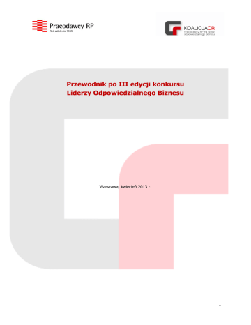 Przewodnik po III edycji konkursu Liderzy Odpowiedzialnego Biznesu Warszawa, kwiecień 2013 r. 1 Spis treści ZAŁOŻENIA KONKURSU ................................................................................................................. 3 WARUNKI UDZIAŁU W KONKURSIE ................................................................................................ 3 FORMULARZ ZGŁOSZENIOWY DO KONKURSU ................................................................................ 4 JAK WYPEŁNIĆ CZĘŚĆ MERYTORYCZNĄ FORMULARZA ZGŁOSZENIOWEGO? WSKAZÓWKI ................ 6 I. WYZNACZANIE STANDARDÓW I EDUKACJA W ZAKRESIE ODPOWIEDZIALNEGO BIZNESU .......... 6 II. WSPIERANIE ROZWOJU GOSPODARCZEGO I SPOŁECZNEGO ................................................... 7 III. POSZANOWANIE PRACOWNIKÓW, ZAPEWNIENIE GODNYCH WARUNKÓW PRACY ................... 9 IV. BUDOWANIE KULTURY ORGANIZACYJNEJ W OPARCIU O WARTOŚCI I INDYWIDUALNE POTRZEBY ................................................................................................................................10 V. DBANIE O ZDROWIE I BEZPIECZEŃSTWO PRACOWNIKÓW ORAZ ODBIORCÓW PRODUKTÓW/USŁUG ................................................................................................................11 VI. PROWADZENIE DZIAŁALNOŚCI BIZNESOWEJ W OPARCIU O ZAUFANIE I PARTNERSTWO .......12 VII. RZETELNA KOMUNIKACJA MARKETINGOWA I DZIAŁANIA SPRZEDAŻOWE .............................13 VIII. TWORZENIE I ROZWIJANIE PRODUKTÓW W OPARCIU O POTRZEBY SPOŁECZNE I ŚRODOWISKOWE .....................................................................................................................14 IX. ODPOWIEDZIALNOŚĆ FIRMY ZA ŚRODOWISKO NATURALNE .................................................14 2 ZAŁOŻENIA KONKURSU Celem konkursu Liderzy Odpowiedzialnego Biznesu jest wyłonienie i nagrodzenie tych firm, które na tle swojej branży wyróżniają się szczególną dbałością o przestrzeganie standardów odpowiedzialnego biznesu (ang. Corporate Responsibility). W naszym rozumieniu Lider Odpowiedzialnego Biznesu to firma, która postrzega działania CR jako kluczowy element strategii zarządzania przedsiębiorstwem. Lider dąży do ciągłego doskonalenia w tym zakresie i odpowiada na pojawiające się wyzwania, by efektem tych działań było tworzenie wspólnej wartości społeczno-ekonomicznej. Do udziału w konkursie zapraszamy firmy bez względu na reprezentowaną branżę czy wielkość przedsiębiorstwa. Zwycięzcy zostaną nagrodzeni podczas Gali, która odbędzie się jesienią 2013 r. WARUNKI UDZIAŁU W KONKURSIE Do konkursu mogą się zgłosić firmy, które posiadają zarejestrowaną siedzibę na terenie Polski i prowadzą działalność w kraju. Warunki udziału: Pobranie formularza zgłoszeniowego ze strony internetowej, uzupełnienie i podpisanie go; Podpisanie Deklaracji przestrzegania zasad Kodeksu Odpowiedzialnego Biznesu; Przygotowanie wymaganych dodatkowych dokumentów, które w formularzu oznaczone zostały tzw. gwiazdką (*) – o ile zostały opracowane i mogą być udostępnione (jeśli są powody, dla których nie jest możliwe przesłanie wymaganych dokumentów, prosimy o zaznaczenie tego przy odpowiednim pytaniu w formularzu); Wysłanie zgłoszenia do organizatora w terminie do 31 maja 2013 r. 3 FORMULARZ ZGŁOSZENIOWY DO KONKURSU Formularz zgłoszeniowy został opracowany w oparciu o Kodeks Odpowiedzialnego Biznesu – kompleksowe narzędzie do weryfikacji stopnia wdrożenia czy rozwoju zasad i standardów etycznych, uznanych przez opiniotwórcze organizacje międzynarodowe za najbardziej istotne dla prowadzenia biznesu. Kodeks powstał w ramach projektu Koalicja CR, bazując na następujących standardach i wytycznych: ISO 26000, Global Compact, OECD, Global Reporting Initiative. Zakres pytań w formularzu zgłoszeniowym obejmuje dziewięć sfer działalności biznesowej firmy, kompatybilnych z zasadami Kodeksu. Dzięki takiemu rozwiązaniu konkurs obejmuje kluczowe wymiary działalności firmy, a struktura formularza umożliwia dokonanie porównań między zgłoszonymi przedsiębiorstwami. Poniżej znajduje się lista zasad Kodeksu Odpowiedzialnego Biznesu wraz z ich wyjaśnieniem: Nr zasady Zasada Opis zasady Zasada I Wyznaczamy standardy i edukujemy w zakresie odpowiedzialnego biznesu Zasada II Wspieramy rozwój społeczny i gospodarczy Zasada III Szanujemy naszych pracowników, zapewniając im godne warunki pracy Zasada IV Budujemy kulturę organizacyjną w oparciu o wartości i indywidualne potrzeby pracowników Zasada V Dbamy o zdrowie i bezpieczeństwo pracowników oraz odbiorców naszych produktów i usług Zasada VI Prowadzimy działalność biznesową w oparciu o zaufanie i partnerstwo Firma edukuje pracowników i interesariuszy w kwestiach odpowiedzialnego prowadzenia biznesu, oczekuje od swoich partnerów biznesowych, że będą prowadzili działalność w sposób odpowiedzialny, dzieli się dobrymi praktykami i swoim doświadczeniem. Firma podejmuje działania na rzecz lokalnej społeczności, edukuje, prowadzi działalność pro publico bono. Wpływa na rozwój gospodarczy poprzez tworzenie nowych miejsc pracy, współpracę z lokalnymi dostawcami, inwestycje w innowacje technologiczne. Firma przestrzega przepisów prawa, związanych z zatrudnianiem, odpowiednim traktowaniem i zwalnianiem pracowników. Nie narusza praw człowieka, jest otwarta na dialog i inicjatywy pracowników. Firma stwarza pracownikom możliwości rozwoju, organizuje szkolenia, wspiera talenty. Nie dyskryminuje nikogo ze względu na płeć, wiek, rasę czy inne wymiary różnorodności. Swoją działalność opiera na etyce oraz wyznawanych w firmie wartościach. Firma dba o bezpieczeństwo produktu, w całym cyklu jego wytwarzania i użytkowania. Odpowiednio chroni dane i informacje, zwłaszcza dotyczące klientów. Szkoli pracowników i podejmuje działania prewencyjne oraz naprawcze, zapewniające pracownikom b