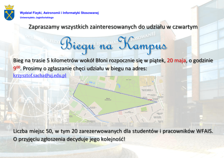 Wydział Fizyki, Astronomii i Informatyki Stosowanej Uniwersytetu Jagiellońskiego Zapraszamy wszystkich zainteresowanych do udziału w czwartym Biegu na Kampus Bieg na trasie 5 kilometrów wokół Błoni rozpocznie się w piątek, 20 maja, o godzinie 900. Prosimy o zgłaszanie chęci udziału w biegu na adres: [email protected] Liczba miejsc 50, w tym 20 zarezerwowanych dla studentów i pracowników WFAIS. O przyjęciu zgłoszenia decyduje jego kolejność!