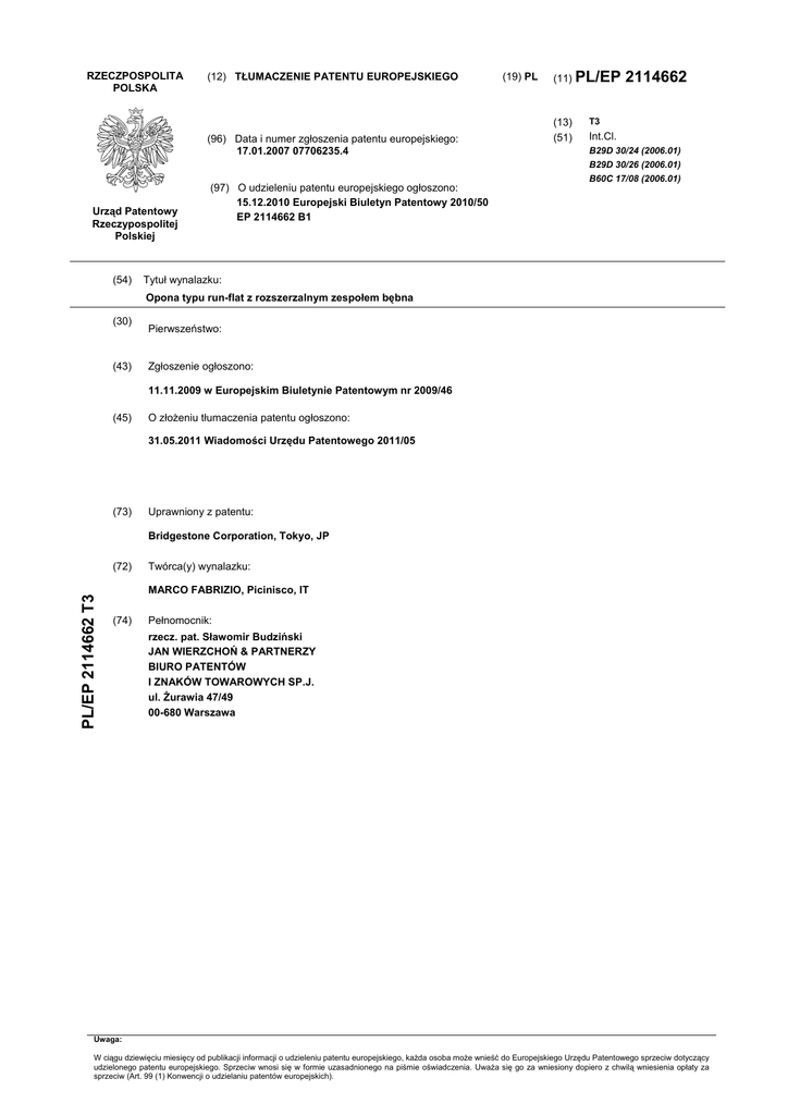 RZECZPOSPOLITA POLSKA (12) TŁUMACZENIE PATENTU EUROPEJSKIEGO (96) Data i numer zgłoszenia patentu europejskiego: 17.01.2007 07706235.4 (19) PL (11) PL/EP (13) (51) 2114662 T3 Int.Cl. B29D 30/24 (2006.01) B29D 30/26 (2006.01) Urząd Patentowy Rzeczypospolitej Polskiej (54) (97) O udzieleniu patentu europejskiego ogłoszono: 15.12.2010 Europejski Biuletyn Patentowy 2010/50 EP 2114662 B1 B60C 17/08 (2006.01) Tytuł wynalazku: Opona typu run-flat z rozszerzalnym zespołem bębna (30) (43) Pierwszeństwo: Zgłoszenie ogłoszono: 11.11.2009 w Europejskim Biuletynie Patentowym nr 2009/46 (45) O złożeniu tłumaczenia patentu ogłoszono: 31.05.2011 Wiadomości Urzędu Patentowego 2011/05 (73) Uprawniony z patentu: Bridgestone Corporation, Tokyo, JP PL/EP 2114662 T3 (72) Twórca(y) wynalazku: MARCO FABRIZIO, Picinisco, IT (74) Pełnomocnik: rzecz. pat. Sławomir Budziński JAN WIERZCHOŃ & PARTNERZY BIURO PATENTÓW I ZNAKÓW TOWAROWYCH SP.J. ul. Żurawia 47/49 00-680 Warszawa Uwaga: W ciągu dziewięciu miesięcy od publikacji informacji o udzieleniu patentu europejskiego, każda osoba może wnieść do Europejskiego Urzędu Patentowego sprzeciw dotyczący udzielonego patentu europejskiego. Sprzeciw wnosi się w formie uzasadnionego na piśmie oświadczenia. Uważa się go za wniesiony dopiero z chwilą wniesienia opłaty za sprzeciw (Art. 99 (1) Konwencji o udzielaniu patentów europejskich). 12010/11/P-RO/BS/MA EP 2 114 662 Opona typu run-flat z rozszerzalnym zespołem bębna Opis DZIEDZINA TECHNIKI [0001] Niniejszy wynalazek dotyczy zespołu bębna dla opon typu run-flat (tj. opona, którą można używać nawet, gdy zejdzie z niej powietrze, przy niskich prędkościach i na ograniczonym dystansie) wyposażonej w dwa wkłady wzmacniające zgodnie z Zastrzeżeniem 1. [0002] Zespół bębna tego typu znany jest z np. EPA- 0 634 266 lub US-A- 6 488 797. STAN TECHNIKI [0003] Rozszerzalny bęben montażowy dla opony składa się z cylindrycznej powłoki zewnętrznej, która z kolei składa się z wielu współosiowych pierścieni ustawionych obok siebie. Każdy pierścień bębna składa się z wielu sektorów ułożonych kolejno w okrąg, zamontowanych na wewnętrznym siłowniku, który przesuwa sektory osiowo zmieniając średnicę zewnętrzną pierścienia. [0004] W rzeczywistości, wkładka wewnętrzna i warstwa zewnętrzna oplecione są wokół bębna montażowego, który następnie jest rozszerzany powodując rozszerzenie wkładki wewnętrznej i warstwy zewnętrznej w taki sposób, że wkładka wewnętrzna przylega do warstwy zewnętrznej. [0005] Opona typu run-flat różni się od zwykłej opony ponieważ składa się z dwóch pierścieniowych wkładek wzmacniających wewnątrz ścianek bocznych opony. Dwa pośrednie pierścienie rozszerzalnego zespołu bębna dla opony typu run-flat posiadają tym samym pierścieniowe gniazda utworzone przez właściwe ukształtowanie odpowiadających im sektorów, przytrzymujących pierścieniowe wkładki wzmacniające w wymaganej pozycji. Przykład rozszerzalnego zespołu bębna dla opony typu run-flat opisany jest w US6488797B1, EP1512524A1 i EP0634266A2. [0006] Grubość, szerokość i umiejscowienie każdej wkładki wzmacniającej różni się w zależności od wielkości i charakterystyki wyprodukowanej opony. Ponieważ taki sam pierścień pośredni może mieścić w sobie wkładki wzmacniające różnych wielkości, to nawet najmniejsze odchylenie (rzędu 1 mm) szerokości lub pozycji wkładek wzmacniających, wymaga zmiany pierścienia pośredniego na taki, który posiada gniazdo pierścieniowe właściwej wielkości. Dla każdego rozszerzalnego zespołu bębna, należy wyprodukować dużą ilość pierścieni wzmacniających, z których każdy składa się z wielu sektorów, zaprojektowanych do wytworzenia określonej opony typu run-flat. Wytwarzanie pary pierścieni pośrednich jest kosztowne i czasochłonne. Ponadto, praca związana z dużą ilością tylko nieco różniących się od siebie pierścieni pośrednich (różnica w danym momencie może być niedostrzegalna) stanowi problem związany z magazynowaniem i zwiększa ryzyko zamontowania niewłaściwej pary pierścieni. [0007] US4292112A1 i DE2551285A przedstawia bęben montażowy dla opony typu opisanego w niniejszym wynalazku. OPIS WYNALAZKU [0008] Celem niniejszego wynalazku jest przedstawienie rozszerzalnego zespołu bębna dla opony typu run-flat zaprojektowanego w celu wyeliminowania powyższych wad, a który w szczególności jest tani i łatwy do wytworzenia. [0009] Zgodnie z bieżącym wynalazkiem, powyższy cel osiągnięty jest dzięki zespołowi bębna opisanemu w Zastrzeżeniu 1. [0010] Poszczególne przykłady wynalazku stanowią przedmiot zależnych zastrzeżeń. KRÓTKI OPIS RYSUNKÓW [0011] Nieograniczający przykład niniejszego wynalazku opisany zostanie na podstawie przykładu odnoszącego się do odpowiednich rysunków, z których: Figura 1, po usunięciu części dla zapewnienia przejrzystości, przedstawia w sposób schematyczny widok rozszerzalnego zespołu bębna dla opony typu run-flat zgodnie z niniejszym wynalazkiem; Figura 2 przedstawia widok w większej skali od strony sektora pierścienia pośredniego przedstawionego na Figurze 1; Figura 3 przedstawia widok schematyczny czterech różnych konfiguracji sektora przedstawionego na Figurze 2; Figura 4 przedstawia schematyczne przekroje poprzeczne opony typu run-flat przedstawionej na Figurze 1. KORZYSTNE PRZYKŁADY WYNALAZKU [0012] Numer 1 na Figurze 1 przedstawia w całości rozszerzalny zespół bębna dla opony typu run-flat 2 (pokazano na Figurze 4). [0013] Jak pokazano na Figurze 4, opona 2 składa się z toroidalnej warstwy zewnętrznej 3 posiadającej dwa zgrubienia pierścieniowe 4 i wsporczy bieżnik 5. Pas bieżnika 6 składający się z wielu warstw bieżnikowych włożony jest pomiędzy warstwę zewnętrzną 3 a bieżnik 5. Warstwa zewnętrzna 3 wspiera dwie ścianki boczne 7 pomiędzy bieżnikiem 