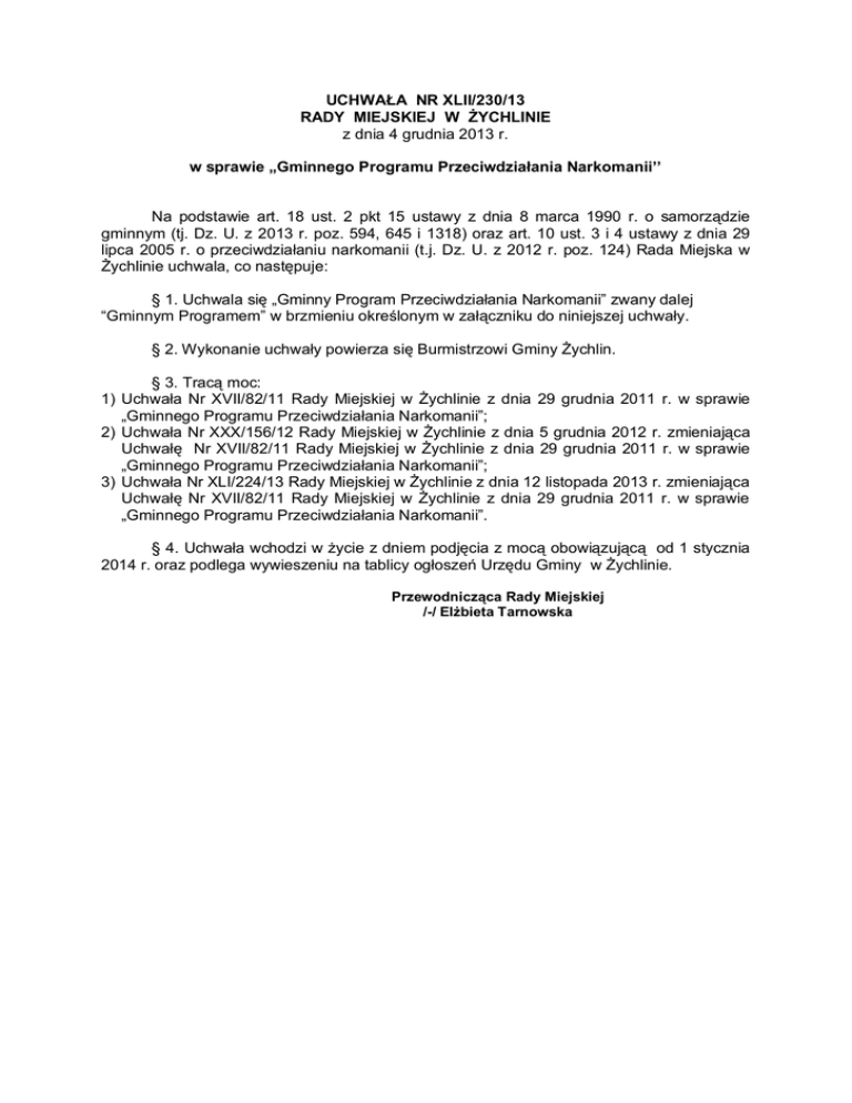 UCHWAŁA NR XLII/230/13 RADY MIEJSKIEJ W ŻYCHLINIE z dnia 4 grudnia 2013 r. w sprawie „Gminnego Programu Przeciwdziałania Narkomanii’’ Na podstawie art. 18 ust. 2 pkt 15 ustawy z dnia 8 marca 1990 r. o samorządzie gminnym (tj. Dz. U. z 2013 r. poz. 594, 645 i 1318) oraz art. 10 ust. 3 i 4 ustawy z dnia 29 lipca 2005 r. o przeciwdziałaniu narkomanii (t.j. Dz. U. z 2012 r. poz. 124) Rada Miejska w Żychlinie uchwala, co następuje: § 1. Uchwala się „Gminny Program Przeciwdziałania Narkomanii” zwany dalej “Gminnym Programem” w brzmieniu określonym w załączniku do niniejszej uchwały. § 2. Wykonanie uchwały powierza się Burmistrzowi Gminy Żychlin. § 3. Tracą moc: 1) Uchwała Nr XVII/82/11 Rady Miejskiej w Żychlinie z dnia 29 grudnia 2011 r. w sprawie „Gminnego Programu Przeciwdziałania Narkomanii”; 2) Uchwała Nr XXX/156/12 Rady Miejskiej w Żychlinie z dnia 5 grudnia 2012 r. zmieniająca Uchwałę Nr XVII/82/11 Rady Miejskiej w Żychlinie z dnia 29 grudnia 2011 r. w sprawie „Gminnego Programu Przeciwdziałania Narkomanii”; 3) Uchwała Nr XLI/224/13 Rady Miejskiej w Żychlinie z dnia 12 listopada 2013 r. zmieniająca Uchwałę Nr XVII/82/11 Rady Miejskiej w Żychlinie z dnia 29 grudnia 2011 r. w sprawie „Gminnego Programu Przeciwdziałania Narkomanii”. § 4. Uchwała wchodzi w życie z dniem podjęcia z mocą obowiązującą od 1 stycznia 2014 r. oraz podlega wywieszeniu na tablicy ogłoszeń Urzędu Gminy w Żychlinie. Przewodnicząca Rady Miejskiej /-/ Elżbieta Tarnowska Załącznik do Uchwały Nr XLII/230/13 Rady Miejskiej w Żychlinie z dnia 4 grudnia 2013 r. GMINNY PROGRAM PRZECIWDZIAŁANIA NARKOMANII Rozdział 1. Wprowadzenie. Aspekty prawne i finansowe. Uzależnienie – to kompleks zjawisk fizjologicznych, behawioralnych i poznawczych, wśród których zachowania związane z przyjmowaniem substancji psychoaktywnych uzyskują wyraźną przewagę nad innymi, które były charakterystyczne dla danej osoby. Jest to zespół określonych objawów i zachowań, wywołanych nieodpartym pragnieniem przyjmowania substancji psychoaktywnych (głód psychiczny). W języku potocznym narkotyk, substancja psychoaktywna, środek odurzający, używka – to określenia o podobnym znaczeniu. W medycynie „narkotykami” określa się te substancje psychoaktywne, które działają m.in. przeciwbólowo poprzez określone receptory mózgowe (opioidowe). Pojęcie narkomanii wywodzi się od słowa "narcos" co oznacza odurzenie, senność, uśpienie. Substancje psychoaktywne: wpływają na centralny układ nerwowy; przyjmowane są w celu doznania przyjemności, zmiany świadomości, uzyskania określonego nastroju, przeżycia ekstremalnych doznań; wpływają na organizm człowieka powodując w różnym stopniu zmiany psychiczne (np. euforię, zmieniony odbiór rzeczywistości, iluzje, omamy, zaburzenia pamięci) oraz fizyczne (np. wzrost ciśnienia krwi, przyspieszenie tętna, pobudzenie); przewlekle przyjmowane mogą prowadzić do uzależnienia, które często nazywane też jest narkomanią czy toksykomanią; mają pochodzenie naturalne lub syntetyczne; często, szczególnie w publikacjach popularnych są dzielone na tzw. narkotyki miękkie (jako bezpieczne, mało szkodliwe) oraz twarde (niebezpieczne, groźne). Za „narkotyk miękki" uznawana jest np. marihuana. Określenia te są mylące, nieprawdziwe, dają złudne poczucie bezpieczeństwa np. przy stosowaniu marihuany. W Polsce obowiązuje podział substancji psychoaktywnych na trzy główne grupy: alkohol, opiaty, leki uspokajające i nasenne (działające głównie rozluźniająco, uspokajająco, nasennie); kanabinole i inne substancje halucynogenne, lotne rozpuszczalniki (działające głównie euforycznie, powodujące omamy, urojenia); kokaina i inne substancje stymulujące, nikotyna (działające pobudzająco, podwyższające nastrój). Podstawowym aktem prawnym odnoszącym się do przeciwdziałania narkomanii w Polsce jest ustawa z dnia 29 lipca 2005r. o przeciwdziałaniu narkomanii ( t.j. Dz. U. z 2012 r. poz. 124). Podstawę działań w zakresie przeciwdziałania narkomanii stanowi Krajowy Program Przeciwdziałania Narkomanii. Program jest finansowany z dochodów uzyskanych z opłat za zezwolenia na sprzedaż napojów alkoholowych (Art. 182 ustawy o wychowaniu w trzeźwości i przeciwdziałaniu alkoholizmowi). Rozdział 2. Diagnoza problemów społecznych z uwzględnieniem problemu uzależnienia od narkotyków na terenie Gminy Żychlin 2.1. Skala problemów występujących w Polsce 2 Problem istnienia narkotyków w Polsce pojawił się w latach 70, a od początku lat 90-tych obserwujemy w naszym kraju znaczny jego wzrost.. Krajowe Biuro ds. Przeciwdziałania Narkomanii prowadzi monitoring używania narkotyków. Nadto prowadzi się ogólnopolskie badania wśród młodzieży szkolnej. Na podstawie przeprowadzonych badań do używania narkotyków w 1992r. przyznało się 5% ankietowanych, w 2003r. aż 24% ankietowanych. W 2008r. kontakt z narkotykami zadeklarowało 15% ankietowanych. Wyniki badań wskazują, że najbardziej rozpowszechnionymi substancjami urywanymi przez młodzież jest marihuana i haszysz, leki uspokajające i nasenne oraz amfetamina. O używanie chociaż raz w życiu: „dopalaczy” przyznało się 3,5% badanych, grzybów halucynogennych 3,6%, sterydów anabolicznych 3,4% oraz leków przeciwkaszlowych 3,2%. Rozpowszechnione jest zjawisko łączenia używania marihuany z alkoholem -17,3% oraz tabletek z alkoholem 12,2%. Odnotowano stabilizację, a nawet tendencję spadkową używania narkotyków przez młodzież szkolną. Wśród młodzieży, która spróbowała chociaż raz w życiu w 2007r. odnotowano spadek w porównaniu z 2003 r. o 3 pkt % używania konopi, o 4 pkt % używania amfetaminy i ecstasy, o 2 pkt % grzybów halucynogennych. Badania przeprowadzone w populacji respondentów w wieku 15-75 lat wykazały, że 7% miało kontakt z marihuaną (dla porównania w 2006r. -9%), 3%