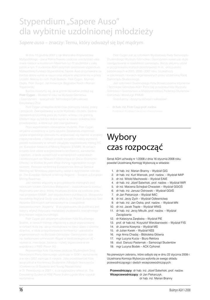 Stypendium „Sapere Auso” dla wybitnie uzdolnionej młodzieży Sapere auso – znaczy: Temu, który odważył się być mądrym W dniu 12 grudnia 2007 z rąk Marszałka Województwa Małopolskiego – pana Marka Nawary podczas uroczystości jaka miała miejsce w Auditorium Maximum UJ 70 studentów z całej polski w tym 7 studentów AGH otrzymało prestiżowe stypendium Małopolskiej Fundacji Stypendialnej Sapere Auso przyznawane za bardzo dobre wyniki w nauce oraz aktywne włączanie się w pracę Uczelni. Należą do nich: Piotr Białecki, Piotr Cygan, Szymon Depta, Piotr Gurgul, Jan Krawczyk, Bogusław Reich i Roman Trojanowski Bardzo cieszymy się, że w gronie laureatów znalazł się Piotr Cygan – Student IV roku na Wydziale Górnictwa i Geoinżynierii – specjalność Technologia Odkrywkowej Eksploatacji Złóż. Piotr Cygan umiejętnie dzieli czas pomiędzy naukę, pracę i przyjaciół. Zaangażowany w życie Wydziału i Uczelni. Godnie reprezentuje Uczelnię poza jej murami, w kraju i za granicą. Efektem tego są bardzo dobre wyniki w nauce i pokaźna lista przedsięwzięć, w które był i jest zaangażowany. Poza wypełnianiem obowiązków studenta, Piotr Cygan aktywnie uczestniczy w życiu Uczelni. Doskonała znajomość języka angielskiego pozwala mu angażować się również w projekty międzynarodowe, z których przede wszystkim należy wymienić projekt realizowany w ramach inicjatywy wspólnotowej Intereg IIIC pn. European Network of Mining Regions (ENMR). W ramach projektu brał udział w organizowaniu konferencji, warsztatów i spotkań, a także uczestniczył w europejskich warsztatach i konferencjach we Włoszech (Workshops on Socio–Economic Effects) i w Wielkiej Brytanii (Post–mining regeneration trough tourism). Podczas konferencji Europamines Annual General Meeting we Wrocławiu poproszony został o wygłoszenie referatu pt. The European Network of Mining Regions – Towards a European Mining Roadmap. Jest również włączony w przygotowanie monografii pod roboczym tytułem Górnictwo Małopolski – uwarunkowania rozwoju. Regionalny plan akcji, której inicjatywa zrodziła się podczas prac nad projektem ENMR. Jest współautorem publikacji pt. Malopolska Voivodship Regional Study oraz artykułu pt. Projekt Europejska Sieć Rejonów Górniczych zamieszczonym w czasopiśmie specjalistycznym „Kopaliny”. W przygotowaniu do publikacji jest kolejny artykuł dotyczący rewitalizacji zwałowiska zewnętrznego przy kopalni węgla brunatnego. Piotr Cygan jest aktywnym członkiem Koła Naukowego Skalnik, w ramach którego włącza się w akcje organizowane w ramach Koła (np. akcja mikołajkowa na rzecz dzieci z domów dziecka), a także przygotowywanie konferencji i warsztatów organizowanych na Wydziale Górnictwa i Geoinżynierii ujak np. barbórkowe seminarium Węgiel w elektroenergetyce UE – wyzwania, inwestycje, badania i rozwój organizowane we współpracy z RWE Power AG. Reprezentuje Koło Naukowe podczas Studenckich Sesji Naukowych Pionu Górniczego uzyskując w 2006 r. wyróżnienie, a w roku 2007 zajmując II miejsce. Jako przedstawiciel Koła wziął udział w Konferencji Studentów i Młodych Naukowców (Conference of Students and Young Researchers) w St. Petersburgu w 2007 r., a za wygłoszony referat pt. The Dewatering System at RWE Power Inden Lignite Mine uzyskał wyróżnienie. 16 Piotr Cygan jest jej członkiem Wydziałowej Rady Samorządu Studenckiego Wydziału Górnictwa i Geoinżynierii wykazując duże zaangażowanie w działalność samorządu. Bierze aktywny udział w przygotowaniu licznych przedsięwzięć m.in.: uroczystości barbórkowych w 2005, 2006 i 2007 roku. Uczestniczy w szkoleniach i kursach organizowanych przez Uczelnianą Radę Samorządu Studenckiego. Jest członkiem Studenckiego Koła Stowarzyszenia Inżynierów i Techników Górnictwa AGH. Pełni rolę przedstawiciela Wydziału Górnictwa i Geoinżynierii w Międzynarodowej Federacji Studentów Górnictwa i Metalurgii IFMMS. Gratulujemy i życzymy dalszych sukcesów! dr hab. inż. Piotr Czaja prof. nadzw. Prodziekan Wydziału Górnictwa i Geoinżynierii Wybory czas rozpocząć Senat AGH uchwałą nr 1/2008 z dnia 16 stycznia 2008 roku powołał Uczelnianą Komisję Wyborczą w składzie: 1. 2. 3. 4. 5. 6. 7. 8. 9. 10. 11. 12. 13. 14. 15. 16. 17. 18. 19. dr hab. inż. Marian Branny – Wydział GiG dr hab. inż. Kurt Wiencek, prof. nadzw. – Wydział IMiIP dr inż. Witold Machowski – Wydział EAIiE dr hab. inż. Józef Salwiński, prof. nadzw. – Wydział IMiR dr inż. Marzena Schejbal-Chwastek – Wydział GGiOŚ dr hab. inż. Janusz Ostrowski – Wydział GGiIŚ dr Jan Piekarczyk – Wydział IMiC dr inż. Jerzy Zych – Wydział Odlewnictwa dr hab. inż. Jan Osika, prof. nadzw. – Wydział MN dr inż. Jacek Traple – Wydział WNiG dr hab. inż. Jerzy Mikulik, prof. nadzw. – Wydział Zarządzania dr Katarzyna Zarębska – Wydział PiE prof. dr hab.inż. Krzysztof Wierzbanowski – Wydział FiIS dr Joanna Kowynia – Wydział MS dr Julian Kwiek – Wydział NSS mgr Anna Chadaj – Biblioteka Główna mgr Lucyna Kucia – Biuro Rektora stud. Dariusz Pasternak – Samorząd Studentów mgr Lucyna Bodek – ACK Cyfronet Na pierwszym zebraniu, które odbyło się w dniu 22 stycznia 2008 r. Uczelniana Komisja Wyborcza wyłoniła ze swego składu przewodniczącego i dwóch wiceprzewodniczących: Przewodniczący: dr hab. inż. Józef Salwiński, prof. nadzw. Wiceprzewodniczący: dr Jan Piekarczyk, dr hab. inż. Marian Branny Biuletyn AGH 1-2008