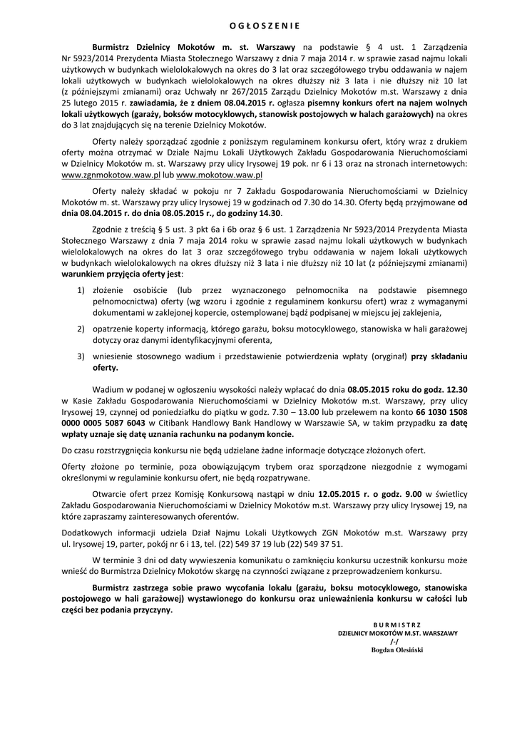 OGŁOSZENIE Burmistrz Dzielnicy Mokotów m. st. Warszawy na podstawie § 4 ust. 1 Zarządzenia Nr 5923/2014 Prezydenta Miasta Stołecznego Warszawy z dnia 7 maja 2014 r. w sprawie zasad najmu lokali użytkowych w budynkach wielolokalowych na okres do 3 lat oraz szczegółowego trybu oddawania w najem lokali użytkowych w budynkach wielolokalowych na okres dłuższy niż 3 lata i nie dłuższy niż 10 lat (z późniejszymi zmianami) oraz Uchwały nr 267/2015 Zarządu Dzielnicy Mokotów m.st. Warszawy z dnia 25 lutego 2015 r. zawiadamia, że z dniem 08.04.2015 r. ogłasza pisemny konkurs ofert na najem wolnych lokali użytkowych (garaży, boksów motocyklowych, stanowisk postojowych w halach garażowych) na okres do 3 lat znajdujących się na terenie Dzielnicy Mokotów. Oferty należy sporządzać zgodnie z poniższym regulaminem konkursu ofert, który wraz z drukiem oferty można otrzymać w Dziale Najmu Lokali Użytkowych Zakładu Gospodarowania Nieruchomościami w Dzielnicy Mokotów m. st. Warszawy przy ulicy Irysowej 19 pok. nr 6 i 13 oraz na stronach internetowych: www.zgnmokotow.waw.pl lub www.mokotow.waw.pl Oferty należy składać w pokoju nr 7 Zakładu Gospodarowania Nieruchomościami w Dzielnicy Mokotów m. st. Warszawy przy ulicy Irysowej 19 w godzinach od 7.30 do 14.30. Oferty będą przyjmowane od dnia 08.04.2015 r. do dnia 08.05.2015 r., do godziny 14.30. Zgodnie z treścią § 5 ust. 3 pkt 6a i 6b oraz § 6 ust. 1 Zarządzenia Nr 5923/2014 Prezydenta Miasta Stołecznego Warszawy z dnia 7 maja 2014 roku w sprawie zasad najmu lokali użytkowych w budynkach wielolokalowych na okres do lat 3 oraz szczegółowego trybu oddawania w najem lokali użytkowych w budynkach wielolokalowych na okres dłuższy niż 3 lata i nie dłuższy niż 10 lat (z późniejszymi zmianami) warunkiem przyjęcia oferty jest: 1) złożenie osobiście (lub przez wyznaczonego pełnomocnika na podstawie pisemnego pełnomocnictwa) oferty (wg wzoru i zgodnie z regulaminem konkursu ofert) wraz z wymaganymi dokumentami w zaklejonej kopercie, ostemplowanej bądź podpisanej w miejscu jej zaklejenia, 2) opatrzenie koperty informacją, którego garażu, boksu motocyklowego, stanowiska w hali garażowej dotyczy oraz danymi identyfikacyjnymi oferenta, 3) wniesienie stosownego wadium i przedstawienie potwierdzenia wpłaty (oryginał) przy składaniu oferty. Wadium w podanej w ogłoszeniu wysokości należy wpłacać do dnia 08.05.2015 roku do godz. 12.30 w Kasie Zakładu Gospodarowania Nieruchomościami w Dzielnicy Mokotów m.st. Warszawy, przy ulicy Irysowej 19, czynnej od poniedziałku do piątku w godz. 7.30 – 13.00 lub przelewem na konto 66 1030 1508 0000 0005 5087 6043 w Citibank Handlowy Bank Handlowy w Warszawie SA, w takim przypadku za datę wpłaty uznaje się datę uznania rachunku na podanym koncie. Do czasu rozstrzygnięcia konkursu nie będą udzielane żadne informacje dotyczące złożonych ofert. Oferty złożone po terminie, poza obowiązującym trybem oraz sporządzone niezgodnie z wymogami określonymi w regulaminie konkursu ofert, nie będą rozpatrywane. Otwarcie ofert przez Komisję Konkursową nastąpi w dniu 12.05.2015 r. o godz. 9.00 w świetlicy Zakładu Gospodarowania Nieruchomościami w Dzielnicy Mokotów m.st. Warszawy przy ulicy Irysowej 19, na które zapraszamy zainteresowanych oferentów. Dodatkowych informacji udziela Dział Najmu Lokali Użytkowych ZGN Mokotów m.st. Warszawy przy ul. Irysowej 19, parter, pokój nr 6 i 13, tel. (22) 549 37 19 lub (22) 549 37 51. W terminie 3 dni od daty wywieszenia komunikatu o zamknięciu konkursu uczestnik konkursu może wnieść do Burmistrza Dzielnicy Mokotów skargę na czynności związane z przeprowadzeniem konkursu. Burmistrz zastrzega sobie prawo wycofania lokalu (garażu, boksu motocyklowego, stanowiska postojowego w hali garażowej) wystawionego do konkursu oraz unieważnienia konkursu w całości lub części bez podania przyczyny. BURMISTRZ DZIELNICY MOKOTÓW M.ST. WARSZAWY /-/ Bogdan Olesiński WYKAZ GARAŻY, BOKSÓW MOTOCYKLOWYCH, STANOWISK POSTOJOWYCH W HALACH GARAŻOWYCH PRZEZNACZONYCH DO KONKURSU OFERT 1. adres: E. J. Abramowskiego 9 stanowisko postojowe nr 43 powierzchnia w m2: 26,99 m2 położenie: stanowisko postojowe w hali garażowej na poziomie -1 wyposażenie: Instalacja elektryczna ogólnodostępna w hali minimalna stawka czynszu netto za 1 m2 powierzchni: 8,00 PLN wadium: 216,00 PLN stan techniczny: stan dostateczny przeznaczenie: do parkowania samochodu osobowego dz. ew.33/3, 69, 70 obręb 1-02-16 2. adres: al. Niepodległości 92/98 garaż nr 1 powierzchnia w m2: 16,89 m2 położenie: garaż w zespole garaży wolnostojących wyposażenie: brak instalacji technicznych minimalna stawka czynszu netto za 1 m2 powierzchni: 11,50 PLN wadium: 195,00 PLN stan techniczny: do remontu bieżącego przeznaczenie: do parkowania samochodu osobowego dz. ew. 172/5 obręb 1-01-19 3. adres: Jadźwingów 14 garaż nr 16 powierzchnia w m2: 15,48 m2 położenie: garaż w zespole garaży wolnostojących wyposażenie: brak instalacji technicznych minimalna stawka czynszu netto za 1 m2 powierzchni: 8,00 PLN wadium: 124,00 PLN stan techniczny: do remontu bieżącego przeznaczenie: do parkowania samochodu osobowego dz. ew. 42/26 obręb 1-04-19 4. adres: Kazimierzowska 50 garaż nr 4 powierzchnia w m2: 11,85 m2 położenie: garaż w zespole garaży wolnostojących wyposażenie: instalacja elektryczna minimalna stawka czynszu netto za 1 m2 powierzchni: 11,50 PLN wadium: 137,00 PLN stan techniczny: do remontu bieżącego przeznaczenie: do parkowania samochodu osobowego dz. ew. 7 obręb 1-01-20 5. adres: Wiktorska 90/92 garaż nr 2 powierzchnia w m2: 15,00 m2 położenie: garaż w zespole dwóch garaży wolnostojących wyposażenie: brak instalacji technicznych minimalna stawka czynszu netto za 1 m2 powierzchni: 11,50 PLN wadium: 173,00 PLN stan techniczny: do remontu bieżącego przeznaczenie: do parkowania samochodu osobowego dz. ew. 21 obręb 1-0