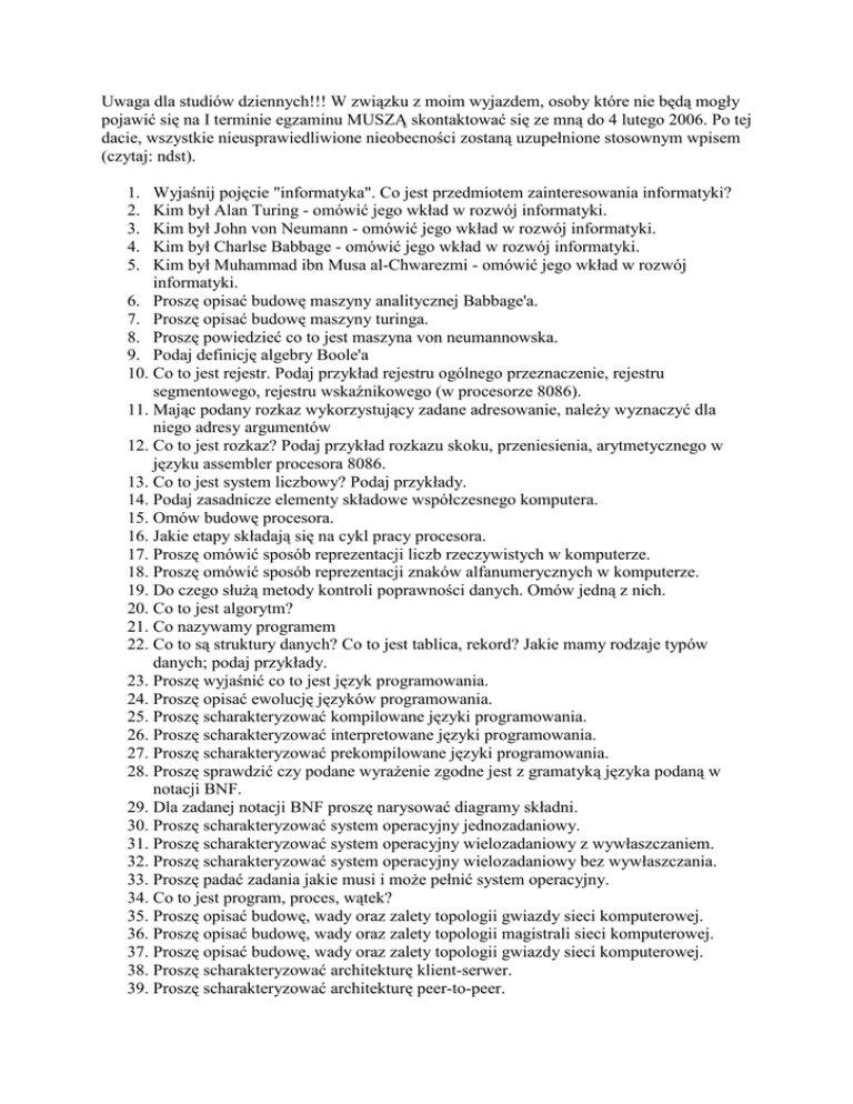 Uwaga dla studiów dziennych!!! W związku z moim wyjazdem, osoby które nie będą mogły pojawić się na I terminie egzaminu MUSZĄ skontaktować się ze mną do 4 lutego 2006. Po tej dacie, wszystkie nieusprawiedliwione nieobecności zostaną uzupełnione stosownym wpisem (czytaj: ndst). 1. 2. 3. 4. 5. Wyjaśnij pojęcie "informatyka". Co jest przedmiotem zainteresowania informatyki? Kim był Alan Turing - omówić jego wkład w rozwój informatyki. Kim był John von Neumann - omówić jego wkład w rozwój informatyki. Kim był Charlse Babbage - omówić jego wkład w rozwój informatyki. Kim był Muhammad ibn Musa al-Chwarezmi - omówić jego wkład w rozwój informatyki. 6. Proszę opisać budowę maszyny analitycznej Babbage'a. 7. Proszę opisać budowę maszyny turinga. 8. Proszę powiedzieć co to jest maszyna von neumannowska. 9. Podaj definicję algebry Boole'a 10. Co to jest rejestr. Podaj przykład rejestru ogólnego przeznaczenie, rejestru segmentowego, rejestru wskaźnikowego (w procesorze 8086). 11. Mając podany rozkaz wykorzystujący zadane adresowanie, naleŜy wyznaczyć dla niego adresy argumentów 12. Co to jest rozkaz? Podaj przykład rozkazu skoku, przeniesienia, arytmetycznego w języku assembler procesora 8086. 13. Co to jest system liczbowy? Podaj przykłady. 14. Podaj zasadnicze elementy składowe współczesnego komputera. 15. Omów budowę procesora. 16. Jakie etapy składają się na cykl pracy procesora. 17. Proszę omówić sposób reprezentacji liczb rzeczywistych w komputerze. 18. Proszę omówić sposób reprezentacji znaków alfanumerycznych w komputerze. 19. Do czego słuŜą metody kontroli poprawności danych. Omów jedną z nich. 20. Co to jest algorytm? 21. Co nazywamy programem 22. Co to są struktury danych? Co to jest tablica, rekord? Jakie mamy rodzaje typów danych; podaj przykłady. 23. Proszę wyjaśnić co to jest język programowania. 24. Proszę opisać ewolucję języków programowania. 25. Proszę scharakteryzować kompilowane języki programowania. 26. Proszę scharakteryzować interpretowane języki programowania. 27. Proszę scharakteryzować prekompilowane języki programowania. 28. Proszę sprawdzić czy podane wyraŜenie zgodne jest z gramatyką języka podaną w notacji BNF. 29. Dla zadanej notacji BNF proszę narysować diagramy składni. 30. Proszę scharakteryzować system operacyjny jednozadaniowy. 31. Proszę scharakteryzować system operacyjny wielozadaniowy z wywłaszczaniem. 32. Proszę scharakteryzować system operacyjny wielozadaniowy bez wywłaszczania. 33. Proszę padać zadania jakie musi i moŜe pełnić system operacyjny. 34. Co to jest program, proces, wątek? 35. Proszę opisać budowę, wady oraz zalety topologii gwiazdy sieci komputerowej. 36. Proszę opisać budowę, wady oraz zalety topologii magistrali sieci komputerowej. 37. Proszę opisać budowę, wady oraz zalety topologii gwiazdy sieci komputerowej. 38. Proszę scharakteryzować architekturę klient-serwer. 39. Proszę scharakteryzować architekturę peer-to-peer. 40. Proszę wyjaśnić co to jest TCP/IP. 41. Proszę podać zadania jakie spełnia sieć komputerowa. (Jakie cechy musi spełniać) 42. Co to jest protokół; podaj przykład.