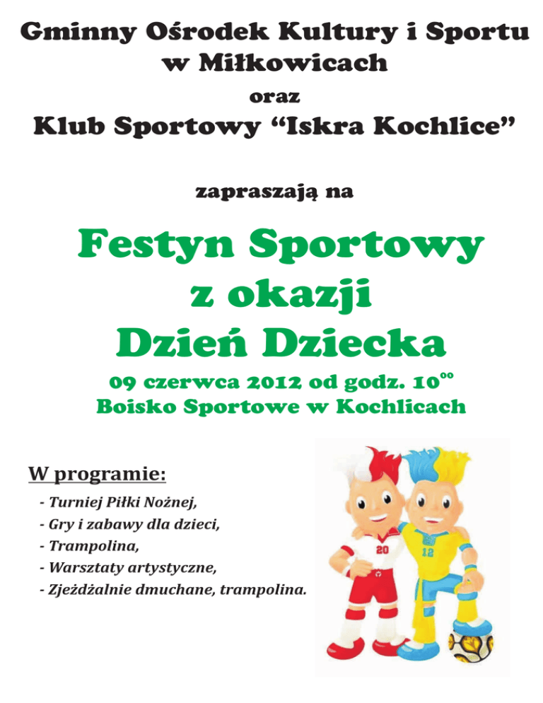 Gminny Oœrodek Kultury i Sportu w Mi³kowicach oraz Klub Sportowy “Iskra Kochlice” zapraszaj¹ na Festyn Sportowy z okazji Dzieñ Dziecka 00 09 czerwca 2012 od godz. 10 Boisko Sportowe w Kochlicach W programie: - Turniej Pi³ki No¿nej, - Gry i zabawy dla dzieci, - Trampolina, - Warsztaty artystyczne, - Zje¿d¿alnie dmuchane, trampolina.