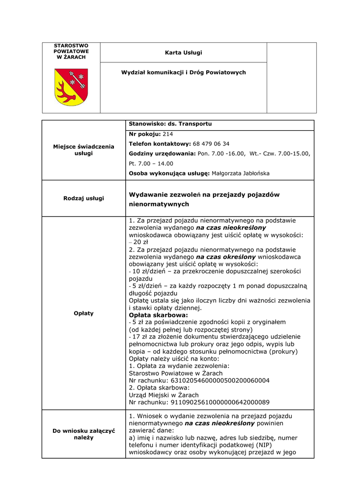 STAROSTWO POWIATOWE W ŻARACH Karta Usługi Wydział komunikacji i Dróg Powiatowych Stanowisko: ds. Transportu Nr pokoju: 214 Miejsce świadczenia usługi Telefon kontaktowy: 68 479 06 34 Godziny urzędowania: Pon. 7.00 -16.00, Wt.- Czw. 7.00-15.00, Pt. 7.00 – 14.00 Osoba wykonująca usługę: Małgorzata Jabłońska Rodzaj usługi Wydawanie zezwoleń na przejazdy pojazdów nienormatywnych Opłaty Do wniosku załączyć należy 1. Za przejazd pojazdu nienormatywnego na podstawie zezwolenia wydanego na czas nieokreślony wnioskodawca obowiązany jest uiścić opłatę w wysokości: – 20 zł 2. Za przejazd pojazdu nienormatywnego na podstawie zezwolenia wydanego na czas określony wnioskodawca obowiązany jest uiścić opłatę w wysokości: - 10 zł/dzień – za przekroczenie dopuszczalnej szerokości pojazdu - 5 zł/dzień – za każdy rozpoczęty 1 m ponad dopuszczalną długość pojazdu Opłatę ustala się jako iloczyn liczby dni ważności zezwolenia i stawki opłaty dziennej. Opłata skarbowa: - 5 zł za poświadczenie zgodności kopii z oryginałem (od każdej pełnej lub rozpoczętej strony) - 17 zł za złożenie dokumentu stwierdzającego udzielenie pełnomocnictwa lub prokury oraz jego odpis, wypis lub kopia – od każdego stosunku pełnomocnictwa (prokury) Opłaty należy uiścić na konto: 1. Opłata za wydanie zezwolenia: Starostwo Powiatowe w Żarach Nr rachunku: 63102054600000500200060004 2. Opłata skarbowa: Urząd Miejski w Żarach Nr rachunku: 91109025610000000642000089 1. Wniosek o wydanie zezwolenia na przejazd pojazdu nienormatywnego na czas nieokreślony powinien zawierać dane: a) imię i nazwisko lub nazwę, adres lub siedzibę, numer telefonu i numer identyfikacji podatkowej (NIP) wnioskodawcy oraz osoby wykonującej przejazd w jego imieniu, a także numer identyfikacyjny w krajowym rejestrze urzędowym podmiotów gospodarki narodowej (REGON) lub numer ewidencyjny powszechnego elektronicznego systemu ewidencji ludności (PESEL) wnioskodawcy oraz osoby wykonującej przejazd w jego imieniu, jeżeli zostały nadane; b) markę, typ i numer rejestracyjny pojazdu; c) szerokość pojazdu nienormatywnego. 2. Wniosek o wydanie zezwolenia na przejazd pojazdu nienormatywnego na czas określony powinien zawierać dane: a) o których mowa w ust. 1 pkt a; b) markę, typ i numer rejestracyjny pojazdu; c) długość i szerokość pojazdu nienormatywnego. 3. Pełnomocnictwo (tylko gdy strona działa przez ustawowego lub statutowego przedstawiciela). Wzór wniosku pokój nr 214 Dodatkowe informacje dla interesanta Zezwolenie na przejazd pojazdu nienormatywnego na czas określony wydaje się na przejazdy po drogach publicznych pojazdu nienormatywnego, którego długość jest większa od dopuszczalnej, określonej w § 2 ust. 1 rozporządzenia Ministra Infrastruktury z dnia 31 grudnia 2002 r. w sprawie warunków technicznych pojazdów oraz zakresu ich niezbędnego wyposażenia (Dz. U. z 2003 r. Nr 32, poz. 262 z późniejszymi zmianami), nie więcej niż 2 m, a szerokość nie przekracza 3,2 m, natomiast masa całkowita, naciski osi i wysokość pojazdu są normatywne. Zezwolenie to wydaje na okres nie dłuższy niż 12 miesięcy Zezwolenie na przejazd pojazdu nienormatywnego na czas nieokreślony wydaje się na przejazdy po drogach publicznych nienormatywnego pojazdu wolnobieżnego, ciągnika rolniczego lub pojazdu specjalnego, których szerokość nie przekracza 3,5 m, natomiast masa całkowita, naciski osi, długość i wysokość są normatywne. Normatywne długości pojazdów: - pojazd samochodowy, z wyjątkiem autobusu – 12,00 m - przyczepy, z wyjątkiem naczepy – 12,00 m - pojazdu członowego – 16,50 m - zespołu złożonego z pojazdu silnikowego i przyczepy – 18,75 m Uwagi Wymaganych opłat można dokonać w punkcie kasowym zlokalizowanym na parterze w budynku Starostwa.