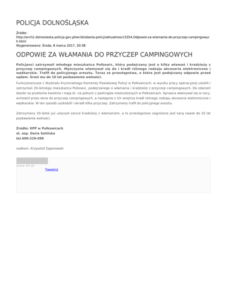 POLICJA DOLNOŚLĄSKA Źródło: http://arch2.dolnoslaska.policja.gov.pl/wr/dzialania-policji/aktualnosci/3354,Odpowie-za-wlamania-do-przyczep-campingowyc h.html Wygenerowano: Środa, 8 marca 2017, 20:38 ODPOWIE ZA WŁAMANIA DO PRZYCZEP CAMPINGOWYCH Policjanci zatrzymali młodego mieszkańca Polkowic, który podejrzany jest o kilka włamań i kradzieży z przyczep campingowych. Mężczyzna włamywał się do i kradł różnego rodzaju akcesoria elektroniczne i wędkarskie. Trafił do policyjnego aresztu. Teraz za przestępstwa, o które jest podejrzany odpowie przed sądem. Grozi mu do 10 lat pozbawienia wolności. Funkcjonariusze z Wydziału Kryminalnego Komendy Powiatowej Policji w Polkowicach, w wyniku pracy operacyjnej ustalili i zatrzymali 20-letniego mieszkańca Polkowic, podejrzanego o włamania i kradzieże z przyczep campingowych. Do zdarzeń doszło na przełomie kwietnia i maja br. na jednym z parkingów niestrzeżonych w Polkowicach. Sprawca włamywał się w nocy, wchodził przez okna do przyczep campingowych, a następnie z ich wnętrza kradł różnego rodzaju akcesoria elektroniczne i wędkarskie. W ten sposób uszkodził i okradł kilka przyczep. Zatrzymany trafił do policyjnego aresztu. Zatrzymany 20-latek już usłyszał zarzut kradzieży z włamaniem, a to przestępstwo zagrożone jest karą nawet do 10 lat pozbawienia wolności. Źródło: KPP w Polkowicach st. asp. Daria Solińska tel.600-229-096 nadkom. Krzysztof Zaporowski Ocena: 0/5 (0) Tweetnij