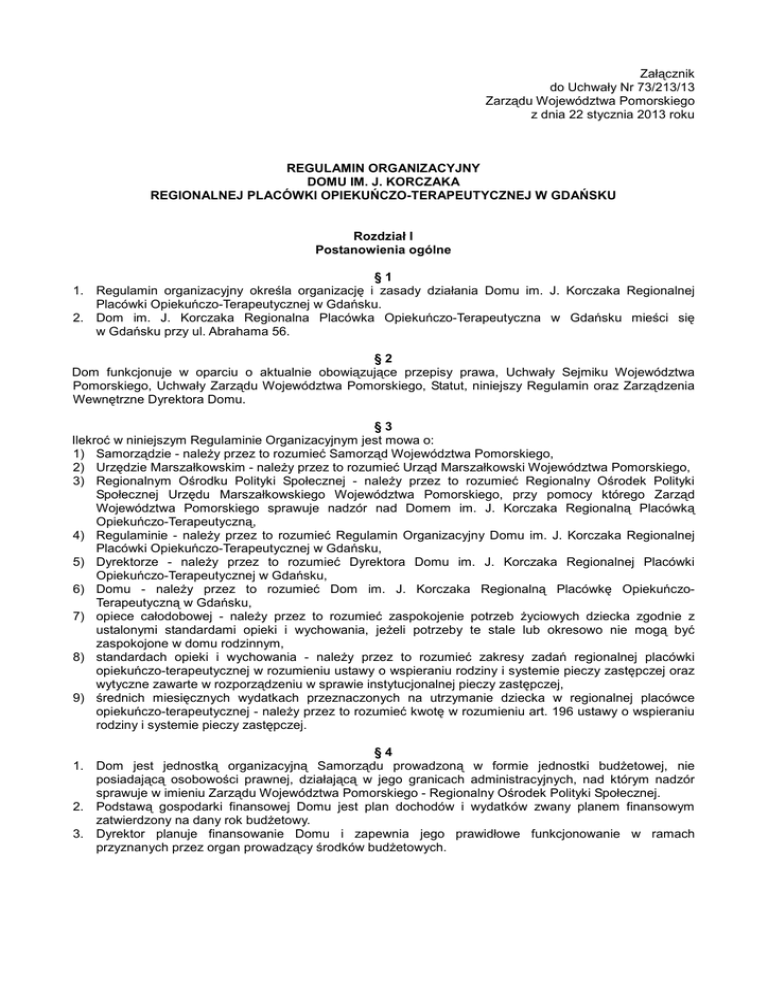 Załącznik do Uchwały Nr 73/213/13 Zarządu Województwa Pomorskiego z dnia 22 stycznia 2013 roku REGULAMIN ORGANIZACYJNY DOMU IM. J. KORCZAKA REGIONALNEJ PLACÓWKI OPIEKUŃCZO-TERAPEUTYCZNEJ W GDAŃSKU Rozdział I Postanowienia ogólne §1 1. Regulamin organizacyjny określa organizację i zasady działania Domu im. J. Korczaka Regionalnej Placówki Opiekuńczo-Terapeutycznej w Gdańsku. 2. Dom im. J. Korczaka Regionalna Placówka Opiekuńczo-Terapeutyczna w Gdańsku mieści się w Gdańsku przy ul. Abrahama 56. §2 Dom funkcjonuje w oparciu o aktualnie obowiązujące przepisy prawa, Uchwały Sejmiku Województwa Pomorskiego, Uchwały Zarządu Województwa Pomorskiego, Statut, niniejszy Regulamin oraz Zarządzenia Wewnętrzne Dyrektora Domu. §3 Ilekroć w niniejszym Regulaminie Organizacyjnym jest mowa o: 1) Samorządzie - należy przez to rozumieć Samorząd Województwa Pomorskiego, 2) Urzędzie Marszałkowskim - należy przez to rozumieć Urząd Marszałkowski Województwa Pomorskiego, 3) Regionalnym Ośrodku Polityki Społecznej - należy przez to rozumieć Regionalny Ośrodek Polityki Społecznej Urzędu Marszałkowskiego Województwa Pomorskiego, przy pomocy którego Zarząd Województwa Pomorskiego sprawuje nadzór nad Domem im. J. Korczaka Regionalną Placówką Opiekuńczo-Terapeutyczną, 4) Regulaminie - należy przez to rozumieć Regulamin Organizacyjny Domu im. J. Korczaka Regionalnej Placówki Opiekuńczo-Terapeutycznej w Gdańsku, 5) Dyrektorze - należy przez to rozumieć Dyrektora Domu im. J. Korczaka Regionalnej Placówki Opiekuńczo-Terapeutycznej w Gdańsku, 6) Domu - należy przez to rozumieć Dom im. J. Korczaka Regionalną Placówkę OpiekuńczoTerapeutyczną w Gdańsku, 7) opiece całodobowej - należy przez to rozumieć zaspokojenie potrzeb życiowych dziecka zgodnie z ustalonymi standardami opieki i wychowania, jeżeli potrzeby te stale lub okresowo nie mogą być zaspokojone w domu rodzinnym, 8) standardach opieki i wychowania - należy przez to rozumieć zakresy zadań regionalnej placówki opiekuńczo-terapeutycznej w rozumieniu ustawy o wspieraniu rodziny i systemie pieczy zastępczej oraz wytyczne zawarte w rozporządzeniu w sprawie instytucjonalnej pieczy zastępczej, 9) średnich miesięcznych wydatkach przeznaczonych na utrzymanie dziecka w regionalnej placówce opiekuńczo-terapeutycznej - należy przez to rozumieć kwotę w rozumieniu art. 196 ustawy o wspieraniu rodziny i systemie pieczy zastępczej. §4 1. Dom jest jednostką organizacyjną Samorządu prowadzoną w formie jednostki budżetowej, nie posiadającą osobowości prawnej, działającą w jego granicach administracyjnych, nad którym nadzór sprawuje w imieniu Zarządu Województwa Pomorskiego - Regionalny Ośrodek Polityki Społecznej. 2. Podstawą gospodarki finansowej Domu jest plan dochodów i wydatków zwany planem finansowym zatwierdzony na dany rok budżetowy. 3. Dyrektor planuje finansowanie Domu i zapewnia jego prawidłowe funkcjonowanie w ramach przyznanych przez organ prowadzący środków budżetowych. §5 1. Dom przetwarza dane osobowe powierzone przez Zarząd Województwa Pomorskiego, dotyczące dzieci, w zakresie i w celu prowadzenia postępowania o umieszczenie dziecka w placówce, zgodnie z wymogami ustawy z dnia 29 sierpnia 1997 r. o ochronie danych osobowych (t.j. Dz. U. z 2002 r. Nr 101 poz. 926 ze zm.). 2. Dom zabezpiecza zbiór danych zgodnie z art. 36-39 ustawy o ochronie danych osobowych oraz spełnia wymagania określone w art. 39 a tejże ustawy. Rozdział II Organizacja Domu §6 Dom jest placówką opiekuńczo-terapeutyczną o zasięgu regionalnym, zapewniającą całodobową opiekę i wychowanie oraz specjalistyczną terapię, a także zaspokajającą inne specyficzne potrzeby, świadczącą specjalistyczną pomoc i wsparcie dla dzieci w wieku od 0 do lat 12, (w uzasadnionych przypadkach dzieci mogą przebywać w Domu do uzyskania pełnoletności), niepełnosprawnych i przewlekle chorych, pozbawionych stale lub okresowo opieki rodzicielskiej, a także oferującą pomoc i wsparcie ich rodzinom. Dom, za zgodą Marszałka Województwa, może przyjąć dziecko z powiatu leżącego w granicach innego województwa, jeżeli dysponuje wolnym miejscem. §7 1. W Domu przebywa łącznie do 45 dzieci, umieszczonych w III grupach opiekuńczo-wychowawczych. 2. W czasie zajęć opiekuńczych i wychowawczych pod opieką 1 wychowawcy przebywa nie więcej niż 14 3. 4. 5. 6. dzieci. W czasie zajęć prowadzonych przez psychologa, pedagoga lub osobę prowadzącą terapię, pod ich opieką może przebywać nie więcej niż 6 dzieci. Wychowawca kieruje procesem wychowawczym nie więcej niż 5 dzieci. W godzinach nocnych, opiekę sprawuje na każdej grupie opiekuńczo-wychowawczej co najmniej 1 osoba pracująca z dziećmi, w tym 1 wychowawca. Dom zapewnia dzieciom między innymi: a) opiekę i wychowanie do czasu powrotu do rodziny naturalnej lub umieszczenia w rodzinie adopcyjnej, zastępczej, rodzinnym domu dziecka, domu pomocy społecznej, b) dostęp do pomocy psychologiczno-pedagogicznej, opieki zdrowotnej w zależności od zaburzeń rozwojowych, stopnia oraz rodzaju niepełnosprawności, c) wyżywienie dostosowane do jego potrzeb rozwojowych, kulturowych, religijnych oraz stanu zdrowia, d) zaopatrzenie w produkty lecznicze, e) zaopatrzenie w środki spożywcze specjalnego przeznaczenia żywieniowego oraz wyroby medyczne wraz z pokryciem udziału środków własnych dziecka - do wysokości limitu przewidzianego w przepisach o świadczeniach opieki zdrowotnej finansowanych ze środków publicznych, f) dostęp przez całą dobę do podstawowych produktów żywnościowych oraz napojów, g) wyposażenie w: odzież obuwie, bieliznę i inne przedmioty osobistego użytku, stosownie do wieku i indywidualnych potrzeb; zabawki odpowiednie do wieku rozwojowego; środki higieny osobistej, h) zaopatrzenie w podręczniki, pomoce i przybory szkolne, i) dostęp do nauki, która w zależności o