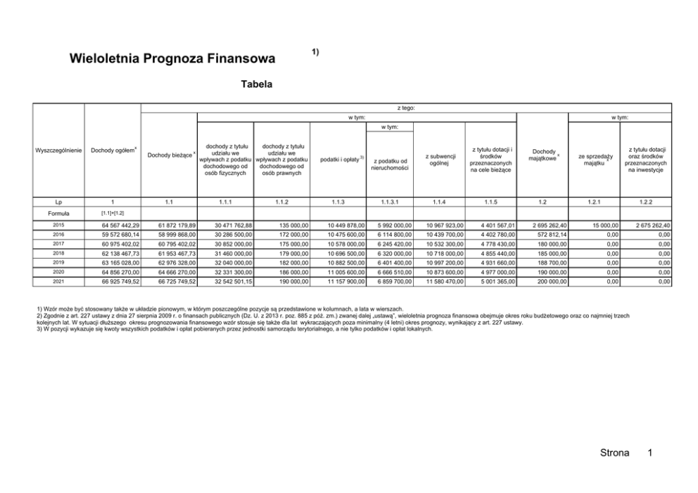 1) Wieloletnia Prognoza Finansowa Tabela z tego: w tym: w tym: w tym: Wyszczególnienie Dochody ogółem Lp 1 Formuła [1.1]+[1.2] x Dochody bieżące x 1.1 dochody z tytułu dochody z tytułu udziału we udziału we wpływach z podatku wpływach z podatku dochodowego od dochodowego od osób fizycznych osób prawnych 1.1.1 1.1.2 podatki i opłaty 3) 1.1.3 z podatku od nieruchomości 1.1.3.1 z subwencji ogólnej z tytułu dotacji i środków przeznaczonych na cele bieżące Dochody x majątkowe 1.1.4 1.1.5 1.2 ze sprzedaży x majątku z tytułu dotacji oraz środków przeznaczonych na inwestycje 1.2.1 1.2.2 2015 64 567 442,29 61 872 179,89 30 471 762,88 135 000,00 10 449 878,00 5 992 000,00 10 967 923,00 4 401 567,01 2 695 262,40 15 000,00 2 675 262,40 2016 59 572 680,14 58 999 868,00 30 286 500,00 172 000,00 10 475 600,00 6 114 800,00 10 439 700,00 4 402 780,00 572 812,14 0,00 0,00 2017 60 975 402,02 60 795 402,02 30 852 000,00 175 000,00 10 578 000,00 6 245 420,00 10 532 300,00 4 778 430,00 180 000,00 0,00 0,00 2018 62 138 467,73 61 953 467,73 31 460 000,00 179 000,00 10 696 500,00 6 320 000,00 10 718 000,00 4 855 440,00 185 000,00 0,00 0,00 2019 63 165 028,00 62 976 328,00 32 040 000,00 182 000,00 10 882 500,00 6 401 400,00 10 997 200,00 4 931 660,00 188 700,00 0,00 0,00 2020 64 856 270,00 64 666 270,00 32 331 300,00 186 000,00 11 005 600,00 6 666 510,00 10 873 600,00 4 977 000,00 190 000,00 0,00 0,00 2021 66 925 749,52 66 725 749,52 32 542 501,15 190 000,00 11 157 900,00 6 859 700,00 11 580 470,00 5 001 365,00 200 000,00 0,00 0,00 1) Wzór może być stosowany także w układzie pionowym, w którym poszczególne pozycje są przedstawione w kolumnach, a lata w wierszach. 2) Zgodnie z art. 227 ustawy z dnia 27 sierpnia 2009 r. o finansach publicznych (Dz. U. z 2013 r. poz. 885 z póź. zm.) zwanej dalej „ustawą”, wieloletnia prognoza finansowa obejmuje okres roku budżetowego oraz co najmniej trzech kolejnych lat. W sytuacji dłuższego okresu prognozowania finansowego wzór stosuje się także dla lat wykraczających poza minimalny (4 letni) okres prognozy, wynikający z art. 227 ustawy. 3) W pozycji wykazuje się kwoty wszystkich podatków i opłat pobieranych przez jednostki samorządu terytorialnego, a nie tylko podatków i opłat lokalnych. Strona 1 z tego: w tym: w tym: w tym: w tym: x Wyszczególnienie Wydatki ogółem Lp 2 Formuła [2.1] + [2.2] x Wydatki bieżące z tytułu poręczeń i x gwarancji 2.1 2.1.1 gwarancje i poręczenia podlegające wyłączeniu z limitu spłaty zobowiązań, o którym mowa wx art. 243 ustawy na spłatę przejętych zobowiązań samodzielnego publicznego zakładu opieki zdrowotnej przekształconego na zasadach określonych w przepisach o działalności leczniczej, w wysokości w jakiej nie podlegają sfinansowaniu dotacją z budżetu państwa 4) 2.1.1.1 2.1.2 odsetki i dyskonto podlegające wyłączeniu z limitu spłaty odsetki i dyskonto zobowiązań, o którym podlegające wyłączeniu mowa w art. 243 wydatki na obsługę z limitu spłaty odsetki i dyskonto x ustawy, w terminie nie długu określone w art. 243 dłuższym niż 90 dni po zobowiązań, o którym mowa w art. 243 x zakończeniu programu, ust. 1 ustawy ustawy, z tytułu projektu lub zadania i zobowiązań otrzymaniu refundacji z zaciągniętych na wkład tych środków (bez krajowy x odsetek i dyskonta od zobowiązań na wkład krajowy) x 2.1.3 2.1.3.1 2.1.3.1.1 2.1.3.1.2 x Wydatki majątkowe 2.2 2015 63 938 227,47 53 306 881,73 0,00 0,00 0,00 876 085,54 876 085,54 0,00 0,00 10 631 345,74 2016 54 249 147,14 51 571 060,00 0,00 0,00 0,00 780 000,00 780 000,00 0,00 0,00 2 678 087,14 2017 56 070 419,00 51 870 870,00 0,00 0,00 0,00 560 000,00 560 000,00 0,00 0,00 4 199 549,00 2018 58 227 701,00 52 096 380,00 0,00 0,00 0,00 371 000,00 371 000,00 0,00 0,00 6 131 321,00 2019 60 490 893,00 52 129 760,00 0,00 0,00 x 221 000,00 221 000,00 0,00 0,00 8 361 133,00 2020 62 541 985,00 52 633 416,00 0,00 0,00 x 121 500,00 121 500,00 0,00 0,00 9 908 569,00 2021 64 923 962,30 53 929 497,30 0,00 0,00 x 36 500,00 36 500,00 0,00 0,00 10 994 465,00 4) W pozycji wykazuje się kwoty dla lat budżetowych 2013-2018. Strona 2 z tego: w tym: x Wyszczególnienie Wynik budżetu Przychodyx budżetu Nadwyżka budżetowa z lat x ubiegłych 4.1 Lp 3 4 Formuła [1] -[2] [4.1] + [4.2] + [4.3] + [4.4] w tym: w tym: w tym: na pokrycie deficytu x budżetu Wolne środki, o których mowa w art. 217 ust.2 pkt x 6 ustawy na pokrycie deficytu x budżetu Kredyty, pożyczki, emisja papierów x wartościowych na pokrycie deficytu x budżetu Inne przychody niezwiązane z zaciągnięciem 5) x długu na pokrycie deficytu x budżetu 4.1.1 4.2 4.2.1 4.3 4.3.1 4.4 4.4.1 2015 629 214,82 4 776 428,18 0,00 0,00 2 276 428,18 0,00 2 500 000,00 0,00 0,00 0,00 2016 5 323 533,00 0,00 0,00 0,00 0,00 0,00 0,00 0,00 0,00 0,00 2017 4 904 983,02 0,00 0,00 0,00 0,00 0,00 0,00 0,00 0,00 0,00 2018 3 910 766,73 0,00 0,00 0,00 0,00 0,00 0,00 0,00 0,00 0,00 2019 2 674 135,00 0,00 0,00 0,00 0,00 0,00 0,00 0,00 0,00 0,00 2020 2 314 285,00 0,00 0,00 0,00 0,00 0,00 0,00 0,00 0,00 0,00 2021 2 001 787,22 0,00 0,00 0,00 0,00 0,00 0,00 0,00 0,00 0,00 5) W pozycji wykazuje się w szczególności kwoty przychodów z tytułu prywatyzacji majątku oraz spłaty pożyczek udzielonych ze środków jednostki. Strona 3 z tego: w tym: z tego: Wyszczególnienie Rozchody budżetu Lp 5 Formuła [5.1] + [5.2] x w tym łączna kwota Spłaty rat przypadających na kapitałowych dany rok kwot kredytów i pożyczek ustawowych oraz wykup wyłączeń z limitu papierów x spłaty zobowiązań, wartościowych o którym mowa wx art. 243 ustawy 5.1 kwota przypadających na dany rok kwot ustawowych wyłączeń określonych w art. x 243 ust. 3 ustawy 5.1.1.1 kwota kwota przypadających na przypadających na dany rok kwot dany rok kwot ustawowych ustawowych wyłączeń wyłączeń innych niż określonych w art. x określone w art. 243 6) x 243 ust. 3a ustawy ustawy 5.1.1.2 5.1.1.3 Inne 