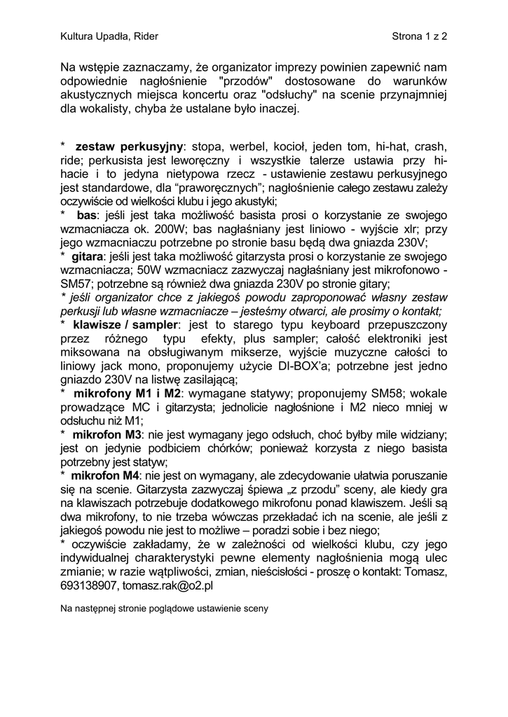 Kultura Upadła, Rider Strona 1 z 2 Na wstępie zaznaczamy, że organizator imprezy powinien zapewnić nam odpowiednie nagłośnienie "przodów" dostosowane do warunków akustycznych miejsca koncertu oraz "odsłuchy" na scenie przynajmniej dla wokalisty, chyba że ustalane było inaczej. * zestaw perkusyjny: stopa, werbel, kocioł, jeden tom, hi-hat, crash, ride; perkusista jest leworęczny i wszystkie talerze ustawia przy hihacie i to jedyna nietypowa rzecz - ustawienie zestawu perkusyjnego jest standardowe, dla “praworęcznych”; nagłośnienie całego zestawu zależy oczywiście od wielkości klubu i jego akustyki; * bas: jeśli jest taka możliwość basista prosi o korzystanie ze swojego wzmacniacza ok. 200W; bas nagłaśniany jest liniowo - wyjście xlr; przy jego wzmacniaczu potrzebne po stronie basu będą dwa gniazda 230V; * gitara: jeśli jest taka możliwość gitarzysta prosi o korzystanie ze swojego wzmacniacza; 50W wzmacniacz zazwyczaj nagłaśniany jest mikrofonowo SM57; potrzebne są również dwa gniazda 230V po stronie gitary; * jeśli organizator chce z jakiegoś powodu zaproponować własny zestaw perkusji lub własne wzmacniacze – jesteśmy otwarci, ale prosimy o kontakt; * klawisze / sampler: jest to starego typu keyboard przepuszczony przez różnego typu efekty, plus sampler; całość elektroniki jest miksowana na obsługiwanym mikserze, wyjście muzyczne całości to liniowy jack mono, proponujemy użycie DI-BOX’a; potrzebne jest jedno gniazdo 230V na listwę zasilającą; * mikrofony M1 i M2: wymagane statywy; proponujemy SM58; wokale prowadzące MC i gitarzysta; jednolicie nagłośnione i M2 nieco mniej w odsłuchu niż M1; * mikrofon M3: nie jest wymagany jego odsłuch, choć byłby mile widziany; jest on jedynie podbiciem chórków; ponieważ korzysta z niego basista potrzebny jest statyw; * mikrofon M4: nie jest on wymagany, ale zdecydowanie ułatwia poruszanie się na scenie. Gitarzysta zazwyczaj śpiewa „z przodu” sceny, ale kiedy gra na klawiszach potrzebuje dodatkowego mikrofonu ponad klawiszem. Jeśli są dwa mikrofony, to nie trzeba wówczas przekładać ich na scenie, ale jeśli z jakiegoś powodu nie jest to możliwe – poradzi sobie i bez niego; * oczywiście zakładamy, że w zależności od wielkości klubu, czy jego indywidualnej charakterystyki pewne elementy nagłośnienia mogą ulec zmianie; w razie wątpliwości, zmian, nieścisłości - proszę o kontakt: Tomasz, 693138907, [email protected] Na następnej stronie poglądowe ustawienie sceny Kultura Upadła, Rider Strona 2 z 2 PERK GIT M4 BAS K L A M3 M2 M1 ODSŁ