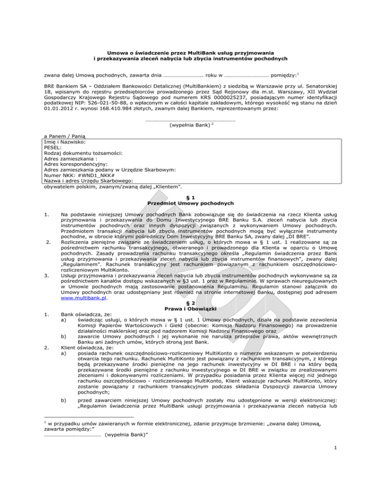 Umowa o świadczenie przez MultiBank usług przyjmowania i przekazywania zleceń nabycia lub zbycia instrumentów pochodnych zwana dalej Umową pochodnych, zawarta dnia ……………………….. roku w …………………………… pomiędzy:1 BRE Bankiem SA – Oddziałem Bankowości Detalicznej (MultiBankiem) z siedzibą w Warszawie przy ul. Senatorskiej 18, wpisanym do rejestru przedsiębiorców prowadzonego przez Sąd Rejonowy dla m.st. Warszawy, XII Wydział Gospodarczy Krajowego Rejestru Sądowego pod numerem KRS 0000025237, posiadającym numer identyfikacji podatkowej NIP: 526-021-50-88, o wpłaconym w całości kapitale zakładowym, którego wysokość wg stanu na dzień 01.01.2012 r. wynosi 168.410.984 złotych, zwanym dalej Bankiem, reprezentowanym przez: ………………………………………………………… (wypełnia Bank) 2 a Panem / Panią Imię i Nazwisko: PESEL: Rodzaj dokumentu tożsamości: Adres zamieszkania : Adres korespondencyjny: Adres zamieszkania podany w Urzędzie Skarbowym: Numer NKK: #WND1_NKK# Nazwa i adres Urzędu Skarbowego: obywatelem polskim, zwanym/zwaną dalej „Klientem”. §1 Przedmiot Umowy pochodnych 1. 2. 3. 1. 2. Na podstawie niniejszej Umowy pochodnych Bank zobowiązuje się do świadczenia na rzecz Klienta usług przyjmowania i przekazywania do Domu Inwestycyjnego BRE Banku S.A. zleceń nabycia lub zbycia instrumentów pochodnych oraz innych dyspozycji związanych z wykonywaniem Umowy pochodnych. Przedmiotem transakcji nabycia lub zbycia instrumentów pochodnych mogą być wyłącznie instrumenty pochodne, w obrocie którymi pośredniczy Dom Inwestycyjny BRE Banku SA, zwany dalej „DI BRE”. Rozliczenia pieniężne związane ze świadczeniem usług, o których mowa w § 1 ust. 1 realizowane są za pośrednictwem rachunku transakcyjnego, otwieranego i prowadzonego dla Klienta w oparciu o Umowę pochodnych. Zasady prowadzenia rachunku transakcyjnego określa „Regulamin świadczenia przez Bank usług przyjmowania i przekazywania zleceń nabycia lub zbycia instrumentów finansowych”, zwany dalej „Regulaminem”. Rachunek transakcyjny jest rachunkiem powiązanym z rachunkiem oszczędnościoworozliczeniowym MultiKonto. Usługi przyjmowania i przekazywania zleceń nabycia lub zbycia instrumentów pochodnych wykonywane są za pośrednictwem kanałów dostępu wskazanych w §3 ust. 1 oraz w Regulaminie. W sprawach nieuregulowanych w Umowie pochodnych mają zastosowanie postanowienia Regulaminu. Regulamin stanowi załącznik do Umowy pochodnych oraz udostępniany jest również na stronie internetowej Banku, dostępnej pod adresem www.multibank.pl. §2 Prawa i Obowiązki Bank oświadcza, że: a) świadcząc usługi, o których mowa w § 1 ust. 1 Umowy pochodnych, działa na podstawie zezwolenia Komisji Papierów Wartościowych i Giełd (obecnie: Komisja Nadzoru Finansowego) na prowadzenie działalności maklerskiej oraz pod nadzorem Komisji Nadzoru Finansowego oraz b) zawarcie Umowy pochodnych i jej wykonanie nie narusza przepisów prawa, aktów wewnętrznych Banku ani żadnych umów, których stroną jest Bank. Klient oświadcza, że: a) posiada rachunek oszczędnościowo-rozliczeniowy MultiKonto o numerze wskazanym w potwierdzeniu otwarcia tego rachunku. Rachunek MultiKonto jest powiązany z rachunkiem transakcyjnym, z którego będą przekazywane środki pieniężne na jego rachunek inwestycyjny w DI BRE i na który będą przekazywane środki pieniężne z rachunku inwestycyjnego w DI BRE w związku ze zrealizowanymi zleceniami i dokonywanymi rozliczeniami. W przypadku posiadania przez Klienta więcej niż jednego rachunku oszczędnościowo - rozliczeniowego MultiKonto, Klient wskazuje rachunek MultiKonto, który zostanie powiązany z rachunkiem transakcyjnym podczas składania Dyspozycji zawarcia Umowy pochodnych; b) przed zawarciem niniejszej Umowy pochodnych zostały mu udostępnione w wersji elektronicznej: „Regulamin świadczenia przez MultiBank usługi przyjmowania i przekazywania zleceń nabycia lub 1 w przypadku umów zawieranych w formie elektronicznej, zdanie przyjmuje brzmienie: „zwana dalej Umową, zawarta pomiędzy:” …………………………………… (wypełnia Bank)” 1 zbycia instrumentów finansowych”, „Regulamin przyjmowania i rozpatrywania reklamacji w MultiBanku”, „Taryfa prowizji i opłat bankowych MultiBanku dla osób fizycznych”, „Tabele stóp procentowych MultiBanku dla osób fizycznych” w sposób umożliwiający mu przechowywanie i odtwarzanie tych dokumentów w zwykłym toku czynności oraz uznaje, że stanowią one część niniejszej Umowy pochodnych i że wiążą Klienta i Bank z chwilą jej zawarcia; c) wyraża zgodę na otrzymanie podstawowych informacji wymaganych przez Dyrektywę w sprawie rynków instrumentów finansowych (MiFID) w wersji elektronicznej, w tym za pośrednictwem strony internetowej Banku pod adresem www.multibank.pl/dla_ciebie/centrum_oszczedzania/mifid oraz, że przed zawarciem Umowy pochodnych powyższe informacje zostały mu udostępnione w taki sposób, aby możliwe było ich przechowywanie i odtwarzanie w zwykłym toku czynności; d) przyjmuje do wiadomości przekazywanie przez Bank do DI BRE oraz na otrzymywanie przez DI BRE, w zakresie niezbędnym do wykonania usług określonych Umową pochodnych, danych osobowych Klienta takich jak: imię i nazwisko, nr dowodu osobistego, adres zamieszkania, adres korespondencyjny, adres do celów podatkowych, adres e-mail, nr telefonu komórkowego, numer posiadanego rachunku MultiKonto, numer NKK, numer posiadanego rachunku transakcyjnego oraz informacje o złożonych zleceniach nabycia lub zbycia instrumentów pochodnych; e) przyjmuje do wiadomości otrzymywanie przez Bank od DI BRE informacji o posiadanym przez Klienta numerze rachunku inwestycyjnego w DI BRE, o transakcjach zrealizowanych przez DI BRE na podstawie złożonych przez Klienta zleceń, o stanie rachunku inwestycyjnego Klienta prowadz