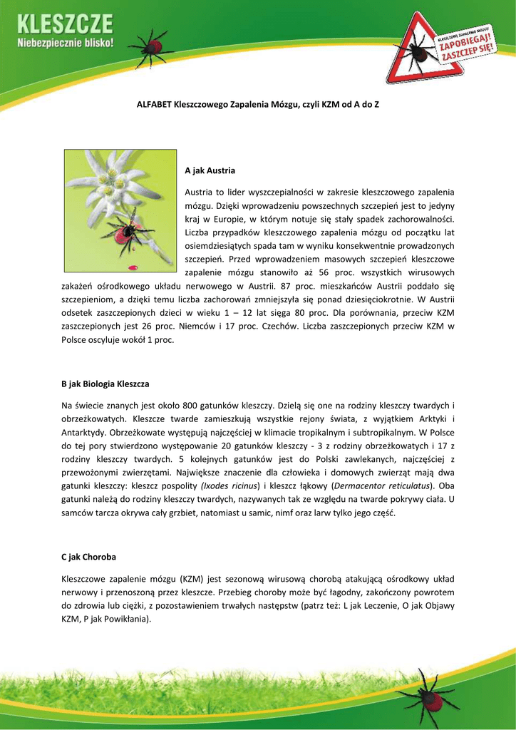 ALFABET Kleszczowego Zapalenia Mózgu, czyli KZM od A do Z A jak Austria Austria to lider wyszczepialności w zakresie kleszczowego zapalenia mózgu. Dzięki wprowadzeniu powszechnych szczepień jest to jedyny kraj w Europie, w którym notuje się stały spadek zachorowalności. Liczba przypadków kleszczowego zapalenia mózgu od początku lat osiemdziesiątych spada tam w wyniku konsekwentnie prowadzonych szczepień. Przed wprowadzeniem masowych szczepień kleszczowe zapalenie mózgu stanowiło aż 56 proc. wszystkich wirusowych zakażeń ośrodkowego układu nerwowego w Austrii. 87 proc. mieszkańców Austrii poddało się szczepieniom, a dzięki temu liczba zachorowań zmniejszyła się ponad dziesięciokrotnie. W Austrii odsetek zaszczepionych dzieci w wieku 1 – 12 lat sięga 80 proc. Dla porównania, przeciw KZM zaszczepionych jest 26 proc. Niemców i 17 proc. Czechów. Liczba zaszczepionych przeciw KZM w Polsce oscyluje wokół 1 proc. B jak Biologia Kleszcza Na świecie znanych jest około 800 gatunków kleszczy. Dzielą się one na rodziny kleszczy twardych i obrzeżkowatych. Kleszcze twarde zamieszkują wszystkie rejony świata, z wyjątkiem Arktyki i Antarktydy. Obrzeżkowate występują najczęściej w klimacie tropikalnym i subtropikalnym. W Polsce do tej pory stwierdzono występowanie 20 gatunków kleszczy - 3 z rodziny obrzeżkowatych i 17 z rodziny kleszczy twardych. 5 kolejnych gatunków jest do Polski zawlekanych, najczęściej z przewożonymi zwierzętami. Największe znaczenie dla człowieka i domowych zwierząt mają dwa gatunki kleszczy: kleszcz pospolity (Ixodes ricinus) i kleszcz łąkowy (Dermacentor reticulatus). Oba gatunki należą do rodziny kleszczy twardych, nazywanych tak ze względu na twarde pokrywy ciała. U samców tarcza okrywa cały grzbiet, natomiast u samic, nimf oraz larw tylko jego część. C jak Choroba Kleszczowe zapalenie mózgu (KZM) jest sezonową wirusową chorobą atakującą ośrodkowy układ nerwowy i przenoszoną przez kleszcze. Przebieg choroby może być łagodny, zakończony powrotem do zdrowia lub ciężki, z pozostawieniem trwałych następstw (patrz też: L jak Leczenie, O jak Objawy KZM, P jak Powikłania). D jak Dzieci Szczepienie zalecane jest wszystkim dzieciom, które na stałe lub czasowo przebywają na terenach endemicznego występowania KZM. Szczepionka może być stosowana u dzieci od drugiego roku życia. Dzieci ze względu na swoją aktywność, zwłaszcza w okresie wakacyjnym (spędzanie czasu na świeżym powietrzu, zabawy na trawie, wyjazdy w regiony endemiczne, np. Mazury, mniejszy dozór dorosłych podczas wyjazdów grupowych) są szczególnie narażone na ukąszenia kleszczy (patrz też: G jak Groźne Smarowanie Masłem). E jak Epidemiologia W latach 1990-2008 na kontynencie europejskim zgłoszono 162.835 przypadków KZM. Roczna średnia zakażeń KZM na wynosi 8570 przypadków, czyli ponad 23 zachorowania na dobę. W Polsce w ostatnich latach rozpoznaje się rocznie średnio 250-300 przypadków zachorowań na KZM. Eksperci oceniają, że dane te są mocno niedoszacowane i uważają, że to tylko około 30 proc. wszystkich zachorowań. Wstępne podliczenia wskazują, że w 2009 r. w Polsce KZM zakaziło się 330 osób. W Słowacji, Słowenii, Polsce, Niemczech, Czechach i Szwajcarii odnotowano w ubiegłym roku 1924 przypadki KZM. Liczba ta wzrośnie po uzupełnieniu brakujących danych ze wszystkich szpitali. F jak Flagowanie Jest to metoda zbierania kleszczy, która umożliwia oszacowanie liczebności i zagęszczenia kleszczy na danym terenie. Odłów przeprowadza się od kwietnia do października, ponieważ w tych miesiącach kleszcze są aktywne. Flaga, czyli koc o wymiarach 1 x 1,5 m, jest ciągnięty po trawie i niskich roślinach na wyznaczonym terenie. Przyczepione do niego kleszcze zbierane są do fiolek z etanolem. Potem oznacza się gatunek i stadium rozwojowe złapanych kleszczy (larwa, nimfa czy dorosły osobnik), a także odsetek zakażonych kleszczy w zależności od stadium rozwoju. W trakcie flagowania można mierzyć ponadto temperaturę, wilgotność i ciśnienie. G jak Groźne Smarowanie Masłem Wbrew ludowej mądrości nie wolno wczepionego w skórę kleszcza smarować masłem, olejem, spirytusem czy wyciągać ręką, bo pod wpływem tych działań kleszcz wydala z siebie wszystkie zarazki, które trafiają z krwią do naszego organizmu (patrz też: Ł jak Łatwe Usunięcie Kleszcza). H jak Historia Pierwsze kliniczne i epidemiologiczne obserwacje na temat rozpowszechnienia kleszczowego zapalenia mózgu w Europie, dokonane na początku lat dwudziestych ubiegłego stulecia, przypisuje się dr Johannowi Schneiderowi. W 1956 roku udało mu się wyizolować wirusa i opisać szczegółowo przebieg choroby. W oparciu o liczne prace badawcze i odkrycia dotyczące kleszczowego zapalenia mózgu prof. Christian Kunz z Instytutu Wirusologii Uniwersytetu Wiedeńskiego stworzył szczepionkę, której użyto po raz pierwszy w latach siedemdziesiątych ubiegłego stulecia. Ciekawostką jest fakt, że pierwszą wyprodukowaną szczepionkę prof. Kunz przetestował na własnym organizmie. Najpierw sam poddał się szczepieniu, a następnie zaszczepili się jego współpracownicy. Dopiero później szczepionka została dopuszczona do obrotu i stosowania w kolejnych krajach. I jak Idealny Czas na Szczepienie Optymalnym czasem na rozpoczęcie szczepienia podstawowego przeciw KZM jest zima lub wczesna wiosna, by zapewnić odporność przed początkiem sezonu żerowania kleszczy na wiosnę. Dla osób podróżujących i tych, które zdecydowały się na szczepienie później, lekarz może zalecić przyspieszony schemat szczepienia, zaczynający się co najmniej trzy tygodnie przed wyjazdem lub wakacjami. J jak działa szczepienie? Jedynym skutecznym sposobem zapobiegania KZM jest szczepienie. Podanie szczepionki powoduje powstanie w organizmie swoistych przeciwciał. W przypadku ugryzienia przez zakażonego kleszcz