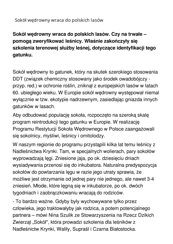 Sokół wędrowny wraca do polskich lasów Sokół wędrowny wraca do polskich lasów. Czy na trwałe – pomogą zweryfikować leśnicy. Właśnie zakończyły się szkolenia terenowej służby leśnej, dotyczące identyfikacji tego gatunku. Sokół wędrowny to gatunek, który na skutek szerokiego stosowania DDT (związek chemiczny stosowany jako środek owadobójczy przyp. red.) w ochronie roślin, zniknął z europejskich lasów w latach 60. ubiegłego wieku. W Europie sokół wędrowny występował niemal wyłącznie w tzw. ekotypie nadrzewnym, zasiedlając gniazda innych gatunków w lasach. Aby odbudować populację sokoła, rozpoczęto na szeroką skalę program reintrodukcji tego gatunku w Europie. W realizację Programu Restytucji Sokoła Wędrownego w Polsce zaangażowali się sokolnicy, myśliwi, leśnicy i ornitolodzy. W naszym regionie do programu przystąpili kilka lat temu leśnicy z Nadleśnictwa Krynki. Tam, w specjalnych wolierach, pary sokołów wyprowadzają lęgi. Zniesione jaja, po ok. dziesięciu dniach wysiadywania przenosi się do inkubatora. Naturalna predyspozycja sokołów do powtarzania lęgu w razie jego utraty sprawia, że możliwe jest otrzymanie od jednej pary nie jednego, ale nawet 3-4 zniesień. Młode, które lęgną się w inkubatorze, po ok. dwóch tygodniach i zaobrączkowaniu wracają do rodziców. - To bardzo ważne. Gdyby były wychowywane tylko przez człowieka, jego traktowałyby jak rodzica, a potem potencjalnego partnera – mówi Nina Szulik ze Stowarzyszenia na Rzecz Dzikich Zwierząt „Sokół", która prowadzi szkolenia dla leśników z Nadleśnictw Krynki, Waliły, Supraśl i Czarna Białostocka. Ostatnim etapem właściwego procesu reintrodukcji jest Ostatnim etapem właściwego procesu reintrodukcji jest wypuszczenie młodych ptaków na wolność. To też proces kilkuetapowy – najpierw umieszcza się 4-5 tygodniowe młode w zamkniętej klatce-gnieździe na drzewie, po 10-14 tygodniach klatkę się otwiera, a po kolejnych 4-5 tygodniach młode zazwyczaj usamodzielniają się. Zbadanie tego, ile sokołów przeżyje i wyprowadzi nowe lęgi, będzie możliwe właśnie dzięki terenowej służbie leśnej. Szkolenia prowadzone przez ornitologów, pozwolą leśnikom nie tylko odróżnić sokoła od innych gatunków, ale też rozpoznać, czy ptaki odbywają akurat gody, czy też może polują. Leśnicy będą też potrafili zidentyfikować gniazdo zasiedlone przez ten gatunek. Informacje o zaobserwowanych sokołach będą na bieżąco przekazywane ornitologom ze stowarzyszenia „Sokół", które prowadzi stały monitoring populacji sokoła w Polsce. Dzięki monitoringowi z terenu i badaniom telemetrycznym, będzie można stwierdzić, czy restytucja sokoła wędrownego w Polsce już zmierza ku szczęśliwemu zakończeniu, czy też będzie wymagać kolejnych lat aktywnych zabiegów. Tekst i załączone zdjęcia: Maria Nowicka-Szpakowicz RDLP w Białymstoku